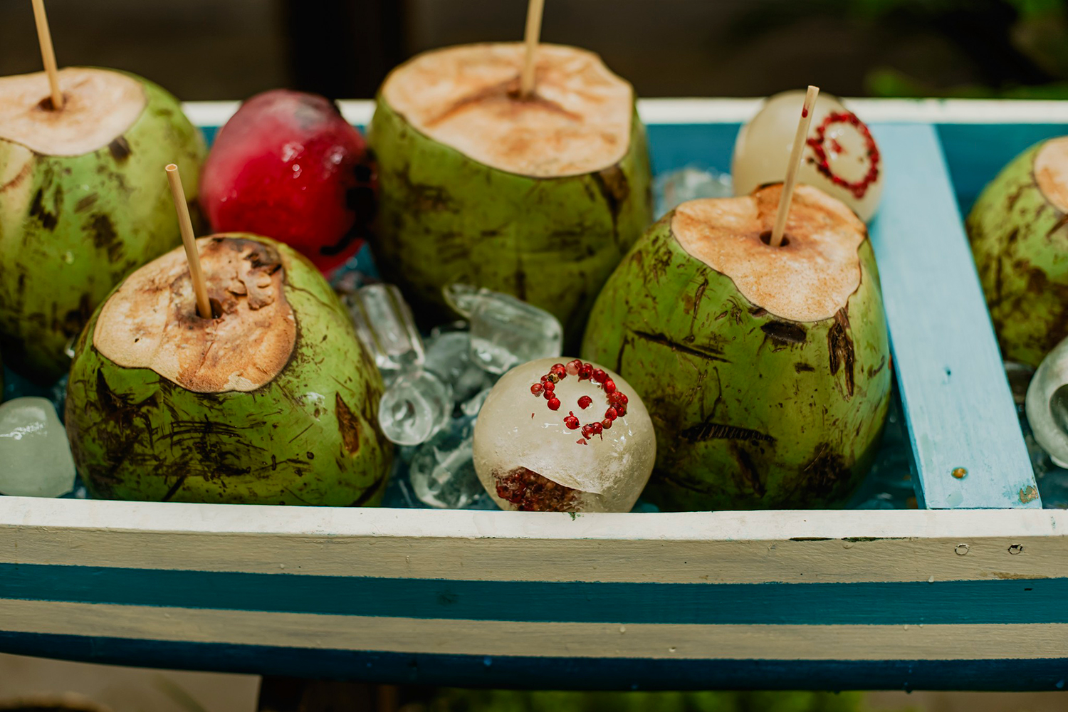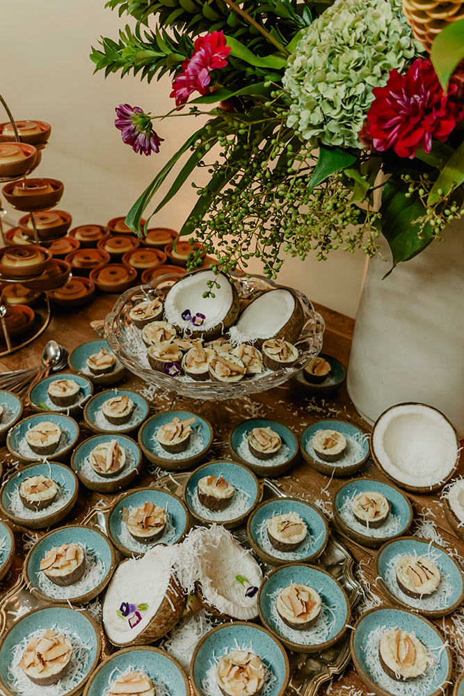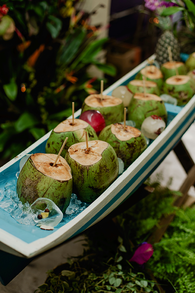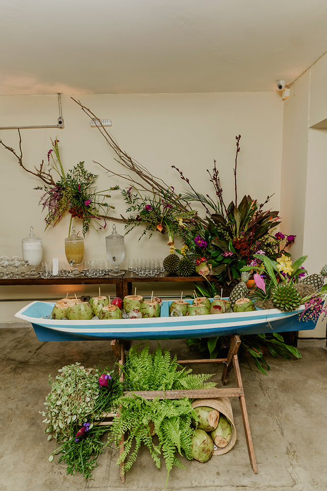 Só para ilustrar, ainda rolou ilha de coco, detalhes tropicais e lindos arranjos coloridos.