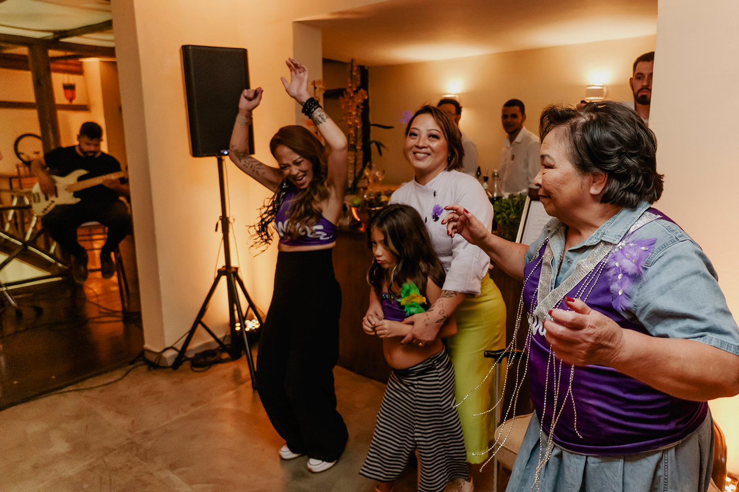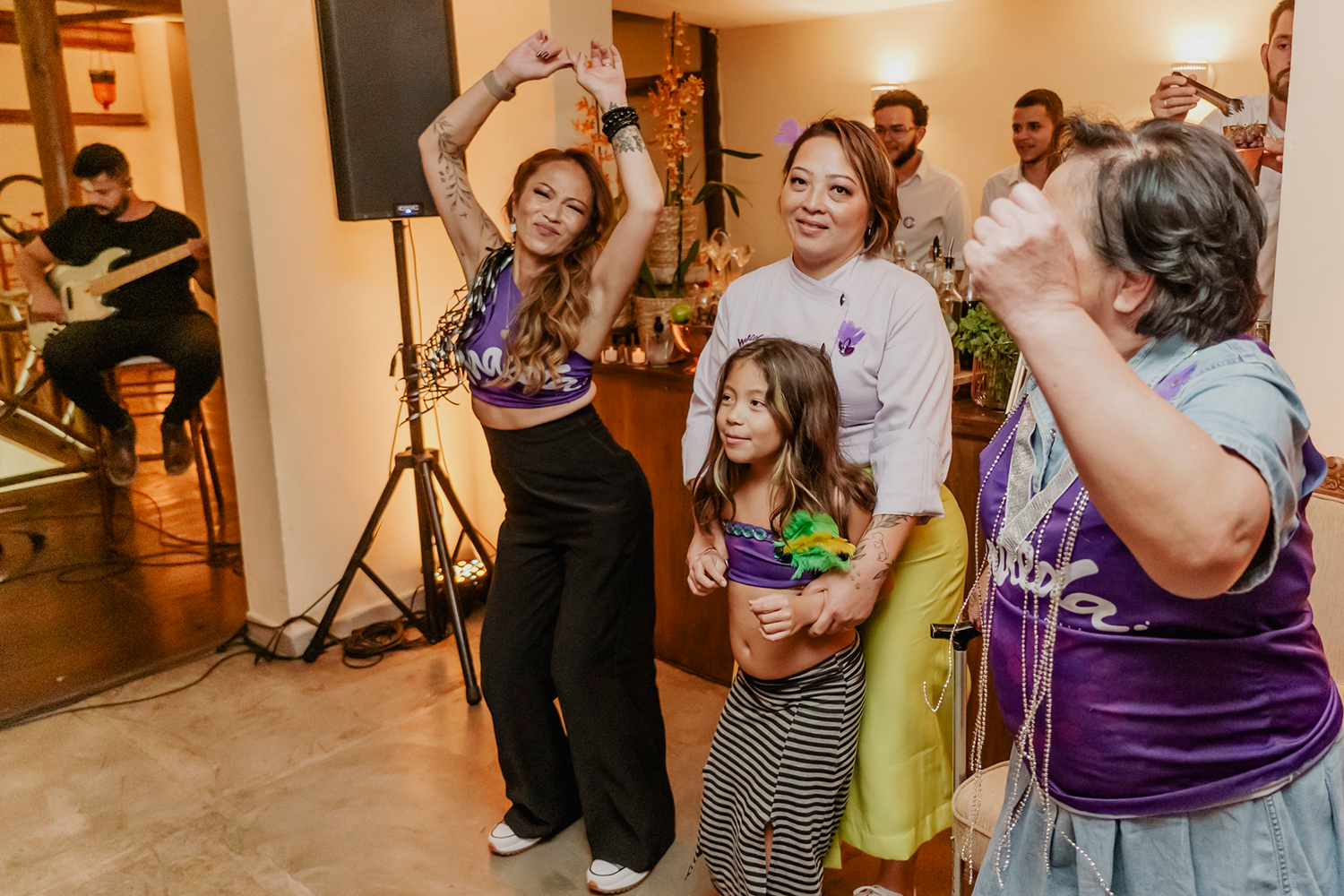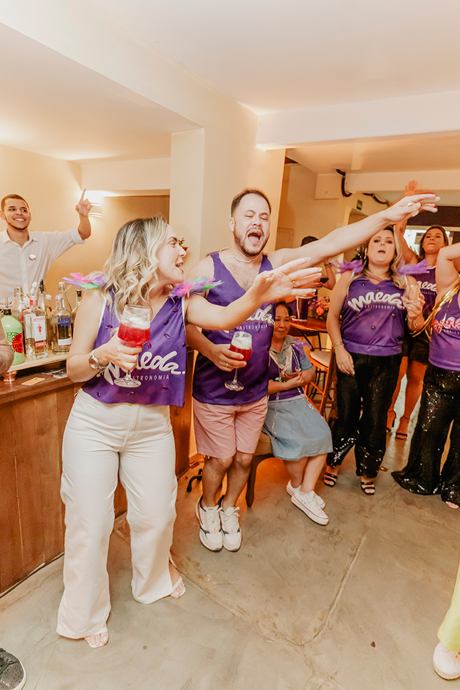 Ainda no clima de diversão e celebração, rolaram abadás personalizados, ilha de sobremesas e muitos sorrisos.