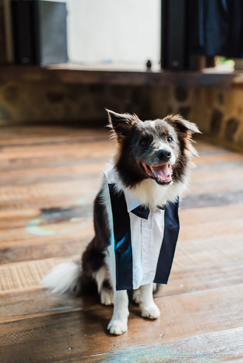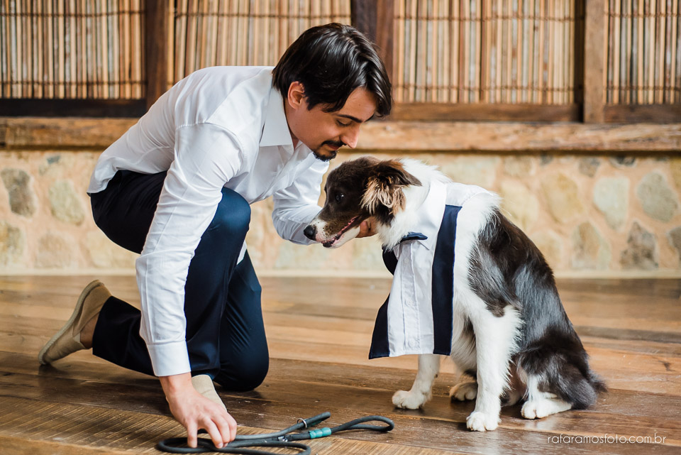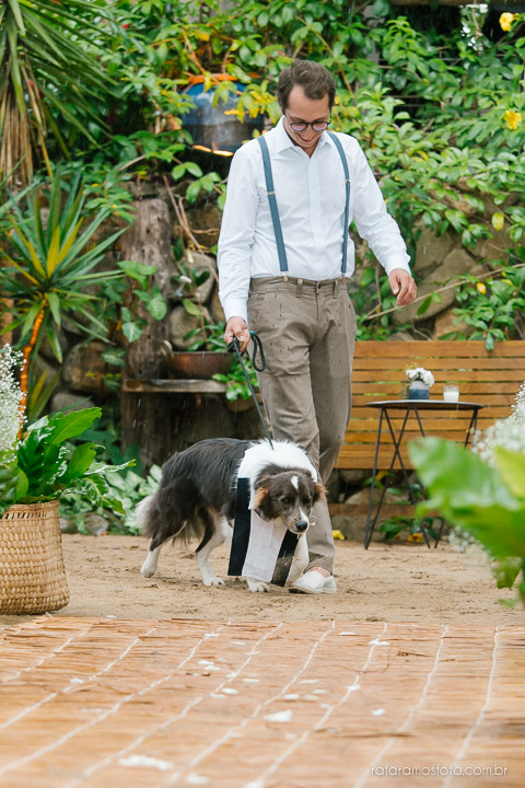 A troca de votos ainda teve o Benjamin, filho de quatro patas do casal, levando as alianças.