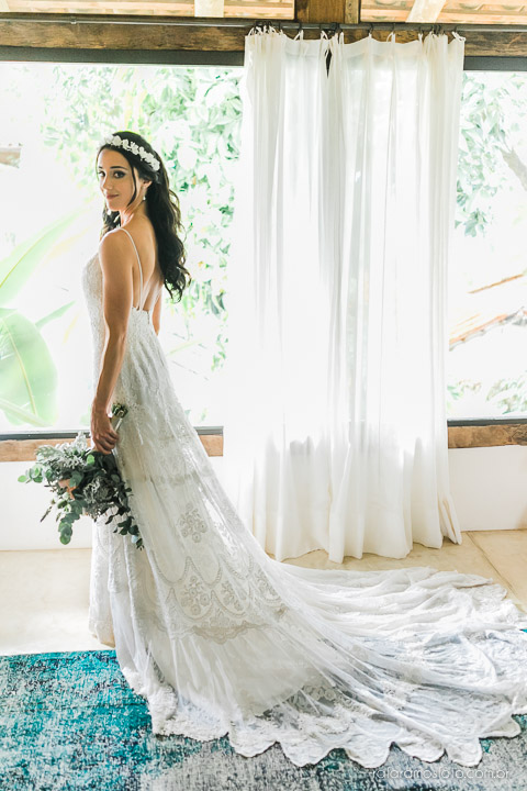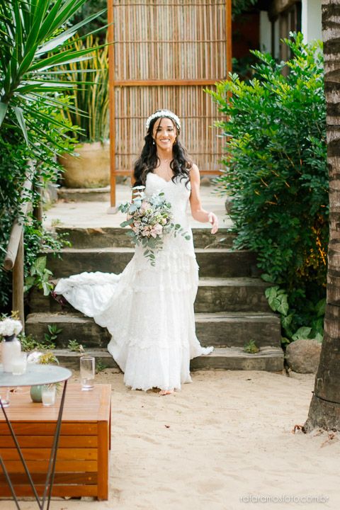 Assumindo o estilo pé na areia, a noiva usou um lindo vestido de renda com as costas de fora. No cabelo, nada de véu. Ao invés disso, uma coroa de flores de papel.