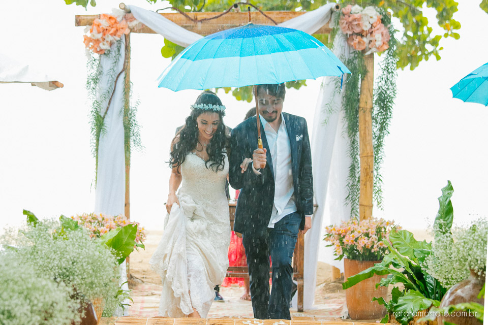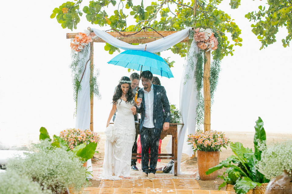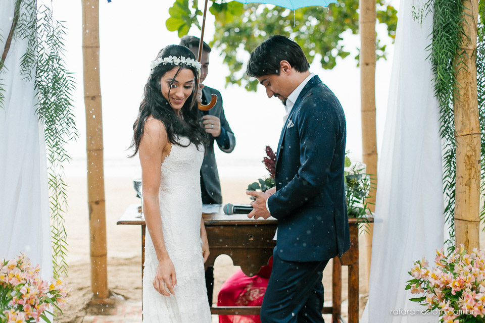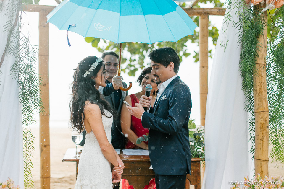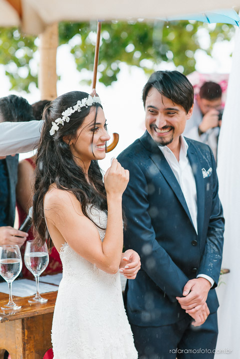 Certamente, um casamento em Ilhabela desses que deixam a gente sem fôlego, mas… Embora não estivesse prevista, a chuva marcou presença, surpreendendo a todos durante a cerimônia.