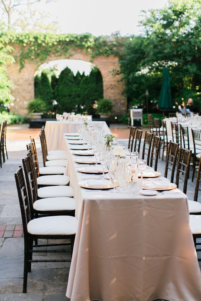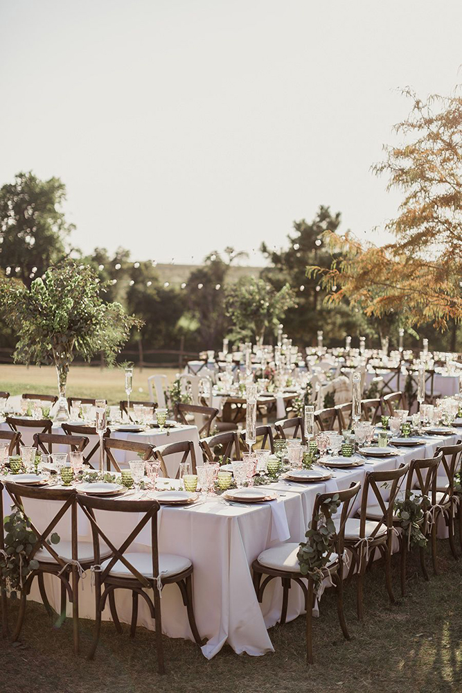 Por serem simples, as mesas comunitárias podem ser decoradas para se adaptar a diferentes estilos de casamento.