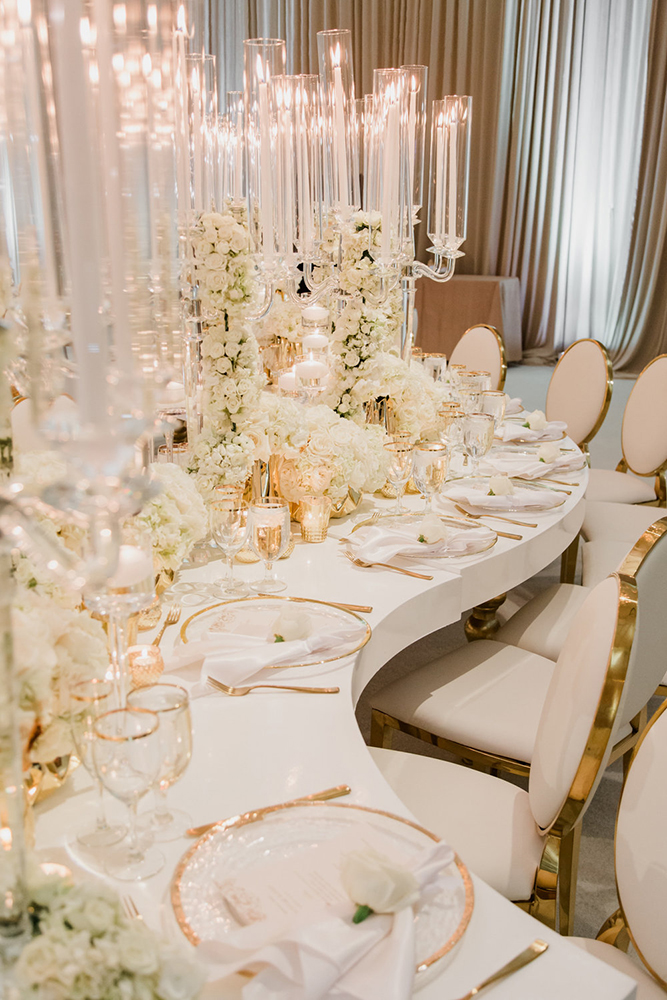 Quer ir além das mesas comunitárias e ainda adicionar uma forte tendência trazida das decorações gringas? A dica são as mesas sinuosas ou composições com uma pegada artística.
