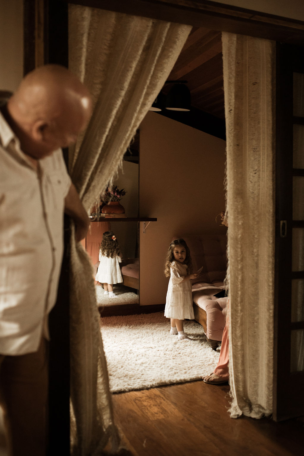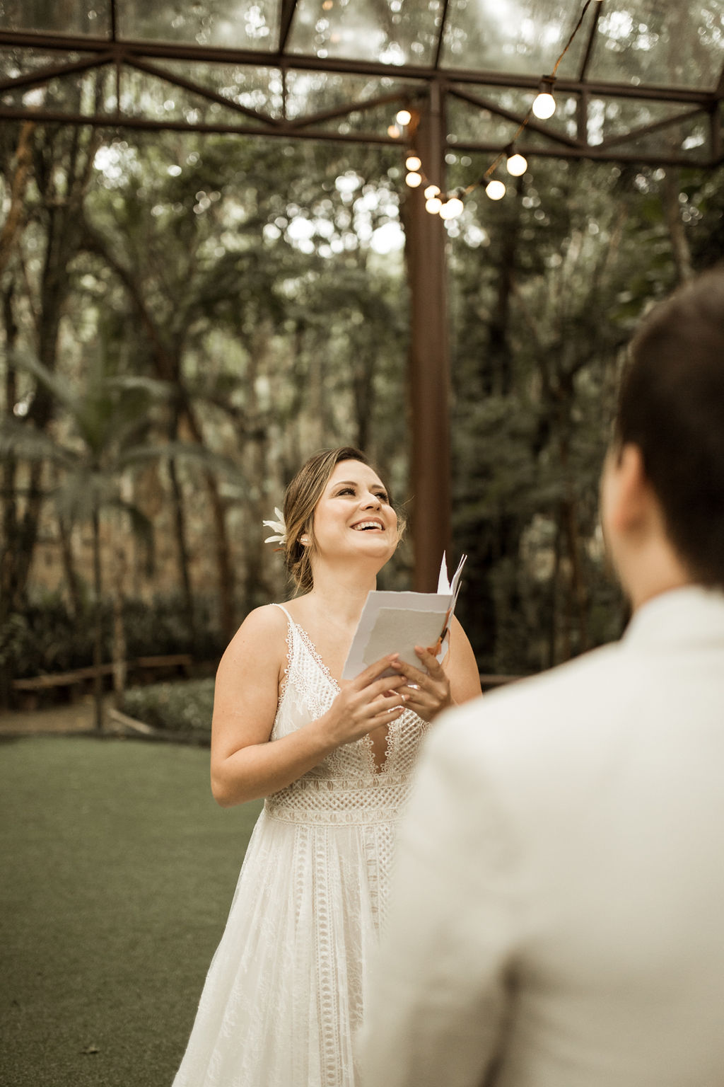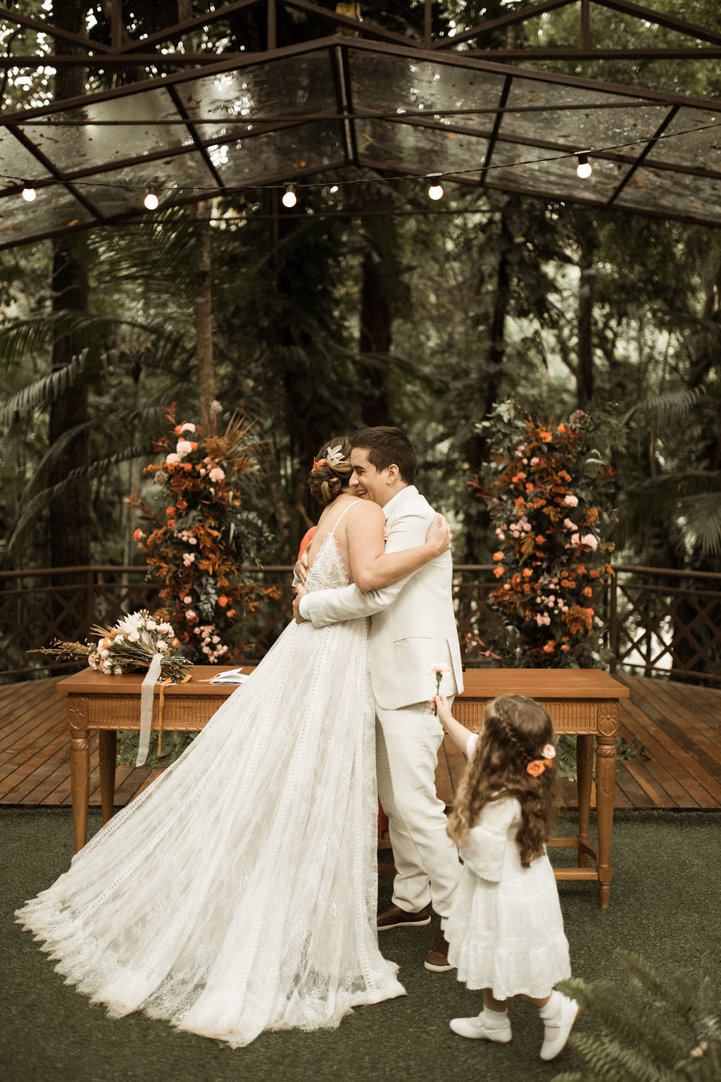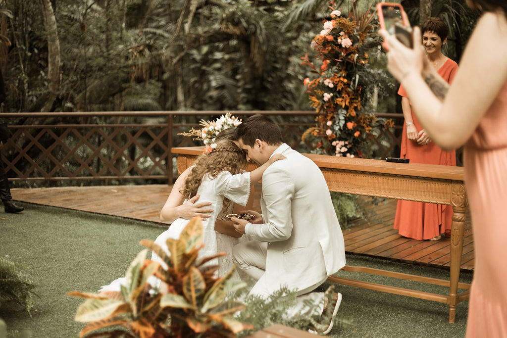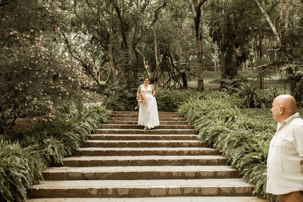 Antes de entrar com meu pai, ele me disse muitas coisas bonitas. Parte delas eu não lembro, mas a principal era que se ele estava ali, é porque ele e minha mãe amavam muito a gente! Pedi pra que ele não chorasse, mas na entrada, antes da metade do caminho, meu pai desabou. Acredito que tinha a emoção de estar casando a filha mais velha, mas também era um sonho que ele queria estar vivendo com a minha mãe.