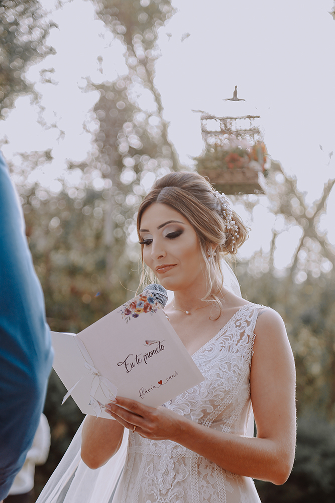 Conhecemos o bosque e era exatamente o que queríamos. Em resumo, foi amor à primeira vista! O Ravena Garden é um lugar com simplicidade e beleza natural, um espaço entre árvores e muito verde. A cerimônia foi linda e mágica neste lugar! O sol, o vento e o frescor na natureza abençoaram nossa união… Foi uma celebração abençoada, confortável para todos e com a nossa carinha!”.