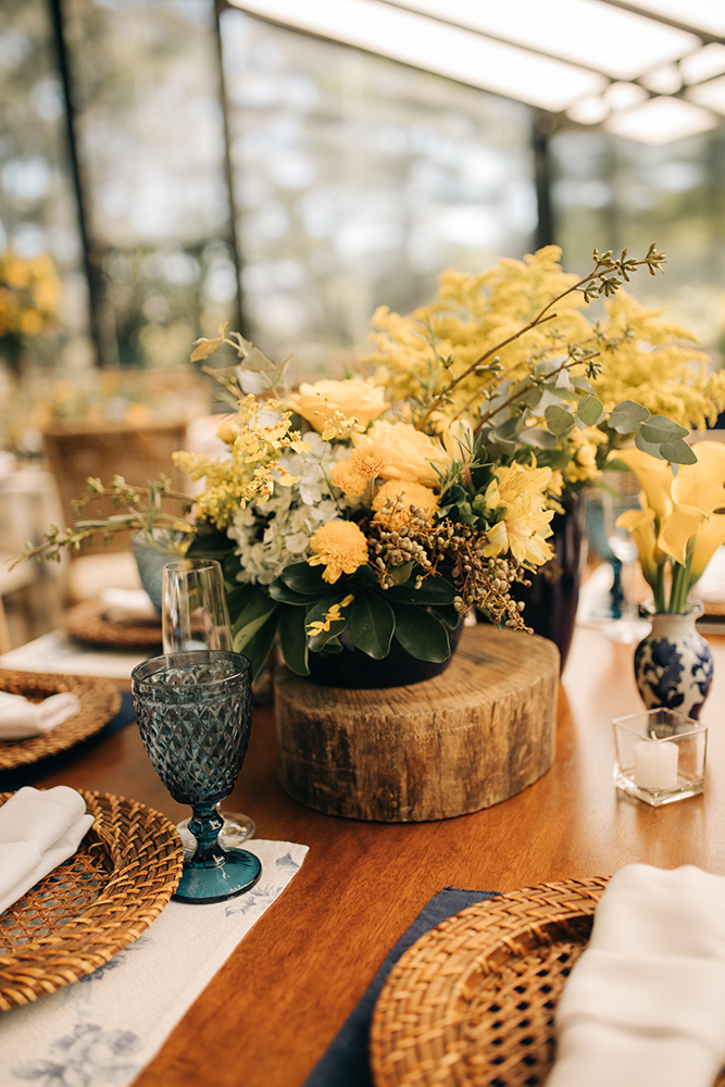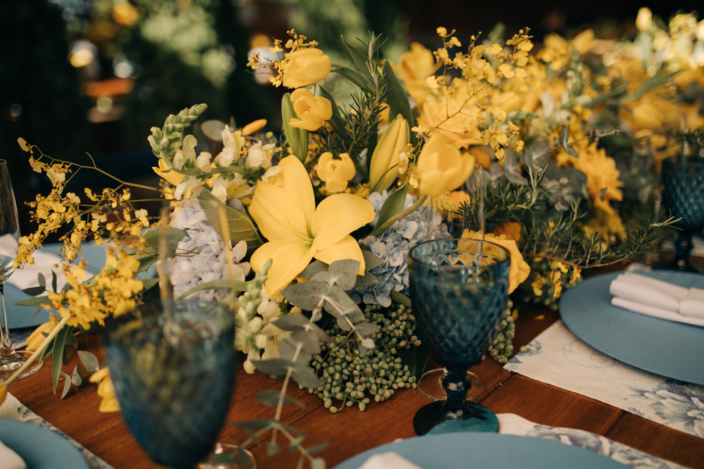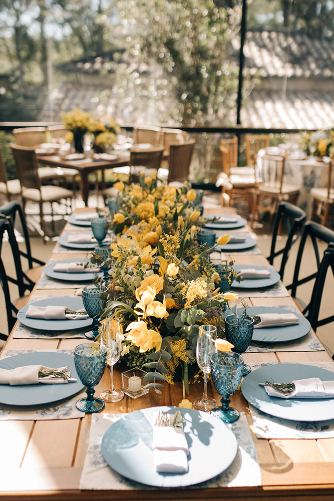 ♥ A decoração em tons de azul e amarelo, que deixou o clima da fazenda ainda mais acolhedor.
