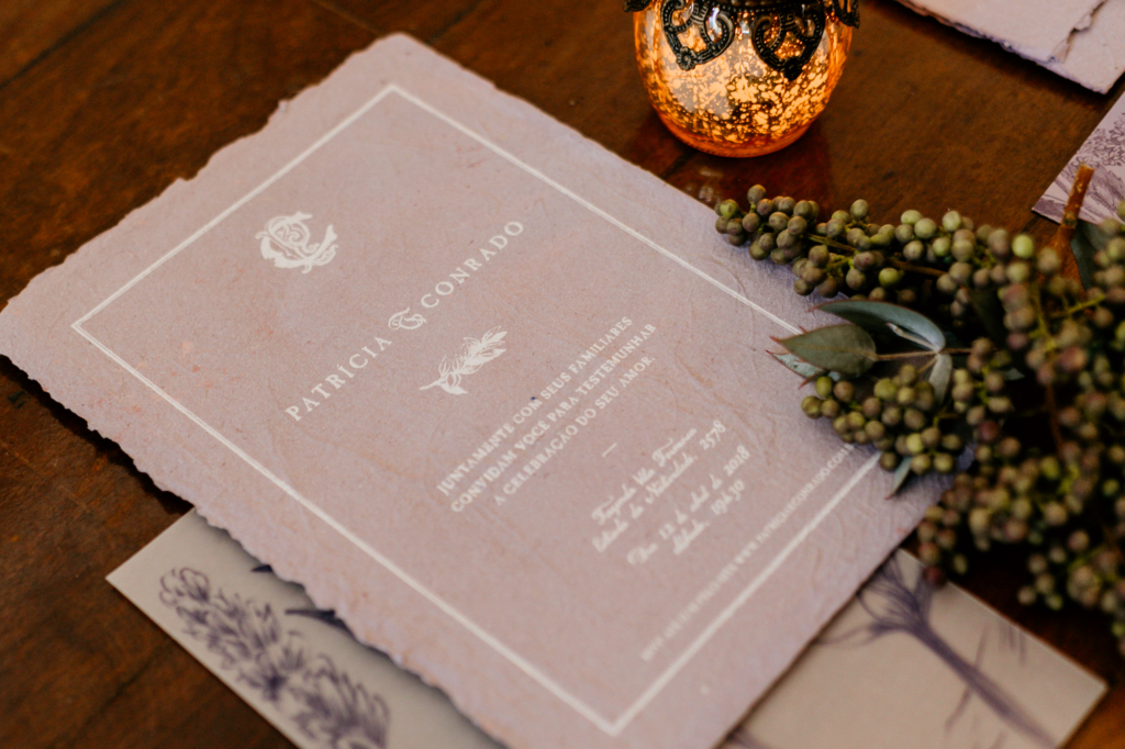 Convites, cartão de agradecimento, caderninho de votos… Tudo confeccionado com primor, como é de praxe no caso da Papelconceito.