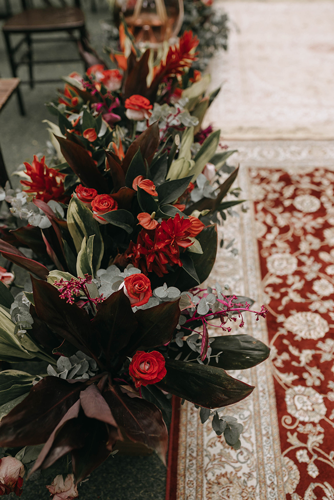 Como designer, eu já tinha algumas ideias em mente, salvei referências no Instagram e Pinterest. Por fim, ficou definido o estilo boho chic, porém mais para chic do que pra boho, hahaha! A decoração contou com cores quentes e um toque rústico, tendo como peça vários tapetes estilo passadeira belga para o altar, por exemplo. Escolhi fazendo testes de cor o tom do vestido das madrinhas, mães, avós e demoiselle. Sendo eles: terracota, marsala, rosa champanhe e goiaba.