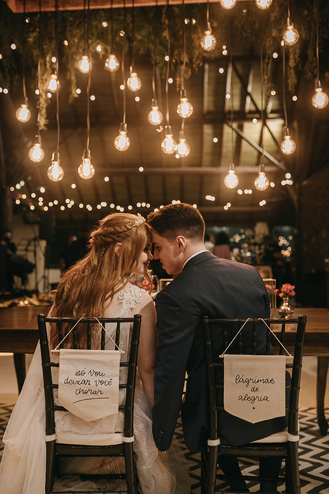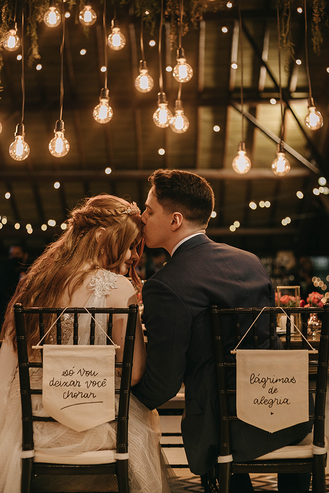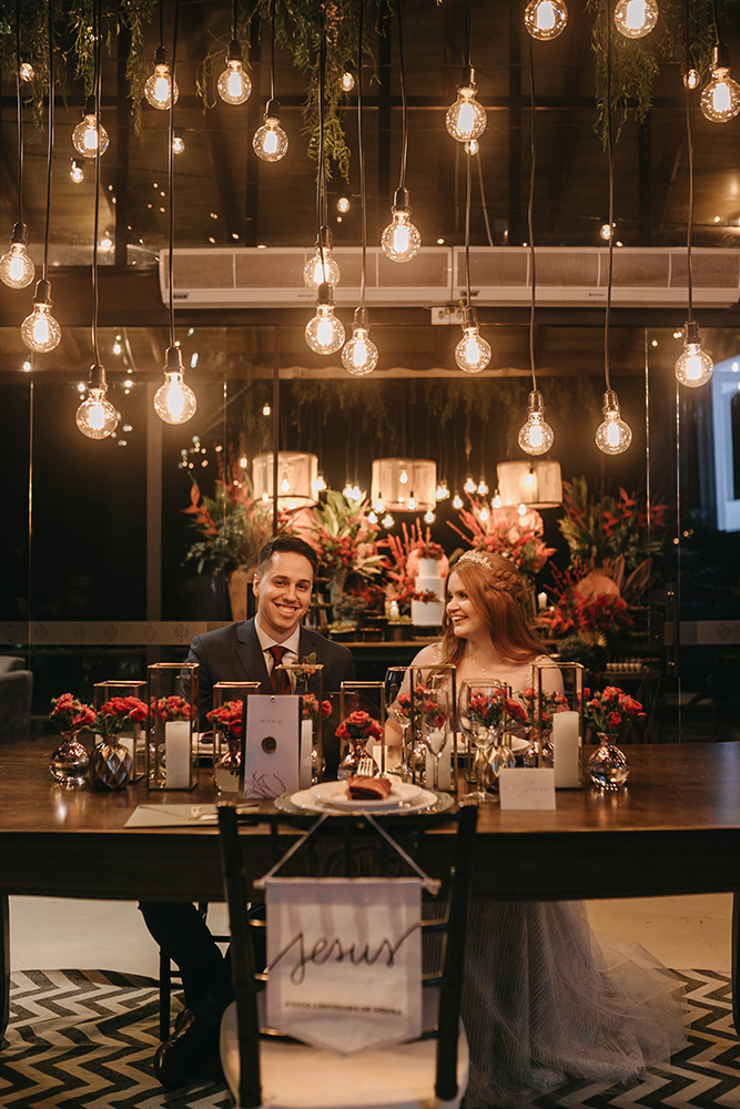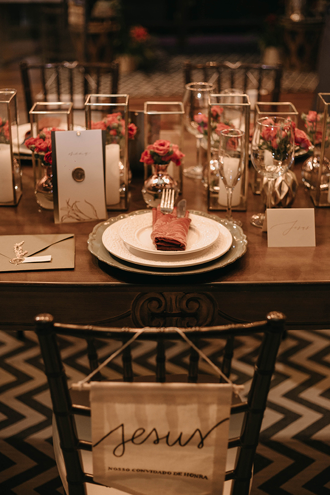 Papelaria. Além disso, em conjunto com o pessoal de decoração, a Ana e o Rodrigo da Estúdio AR colaboraram com todo o significado da nossa mesa dos noivos, nos ajudando com a ideia de criar toda a papelaria do convidado mais especial pra nós, Jesus, com lugar reservado, bandeirola para cadeira, convite e menu para Ele. Eu e o Pedro somos cristãos, e isso foi extremamente importante pra gente; além de ter ficado estupidamente lindo! Fora isso, todos os itens da papelaria foram criados com extremo capricho e com minha mão de criatividade: as tags de convite individual eram destacáveis e a tag do próprio convite foi feita de papel semente, dando a possibilidade do convidado plantar e lembrar desse dia especial.