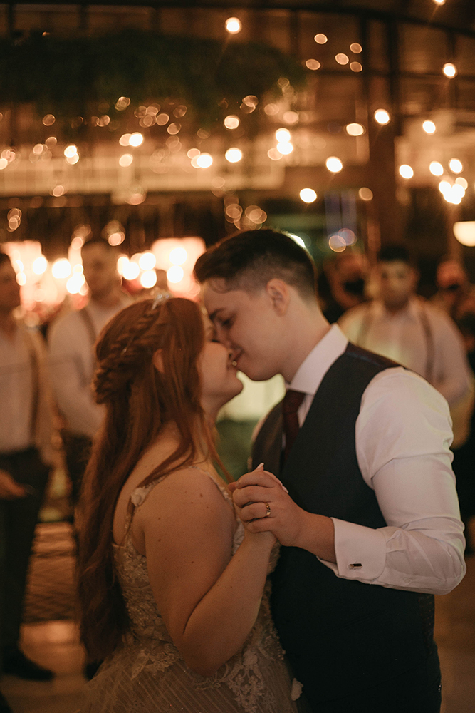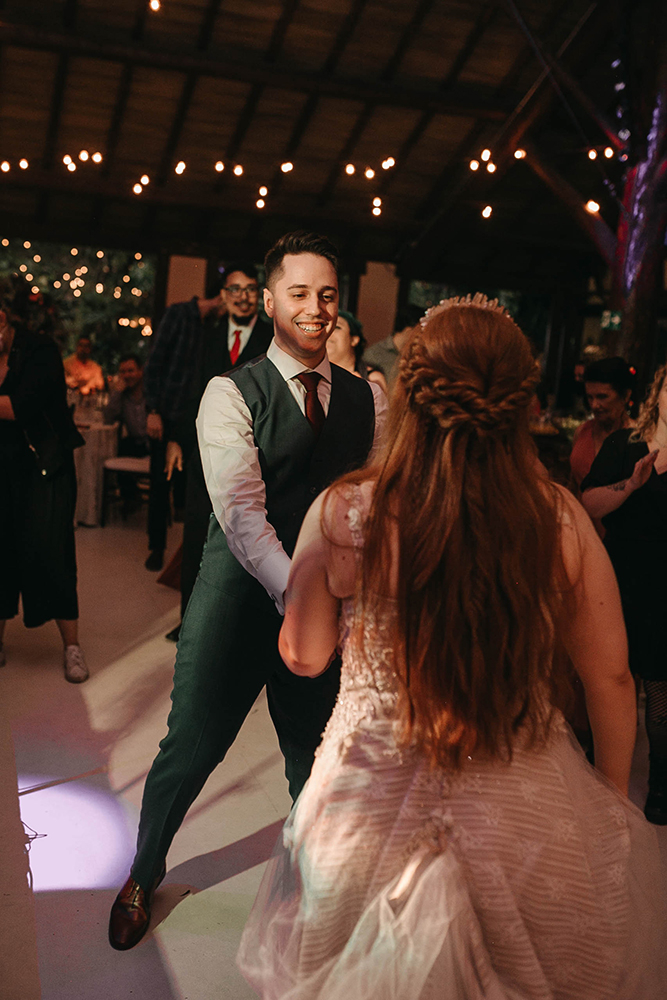 Eu e o Pedro adoramos música e rock. Queríamos uma banda ao vivo no casamento e foi difícil encontrar, pois as boas eram caríssimas e as que gostamos não tocam em eventos. Foi quando achamos o Daniel da Burnz no YouTube e entramos em contato. Além da Burnz, ele também toca e canta na five:pm, que é acústica, então fechamos com ela na cerimônia e a Burnz na festa. Para os rockeiros de plantão, foi INSANO! Muito rock, bate cabelo, gente pulando e cantando junto… Muita gente voltando no tempo, se emocionando e se divertindo. Foi simplesmente o casamento dos meus sonhos e me arrependo amargamente de não ter gravado esse show!
