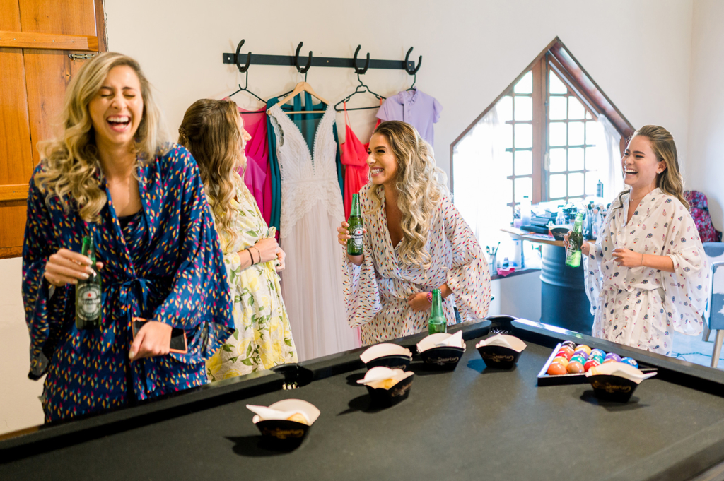 As cenas ao ar livre são espetaculares! De robe ou prontíssimas para a festa, noiva e madrinhas aparecem radiantes, plenas e felizes. Tem coisa melhor?