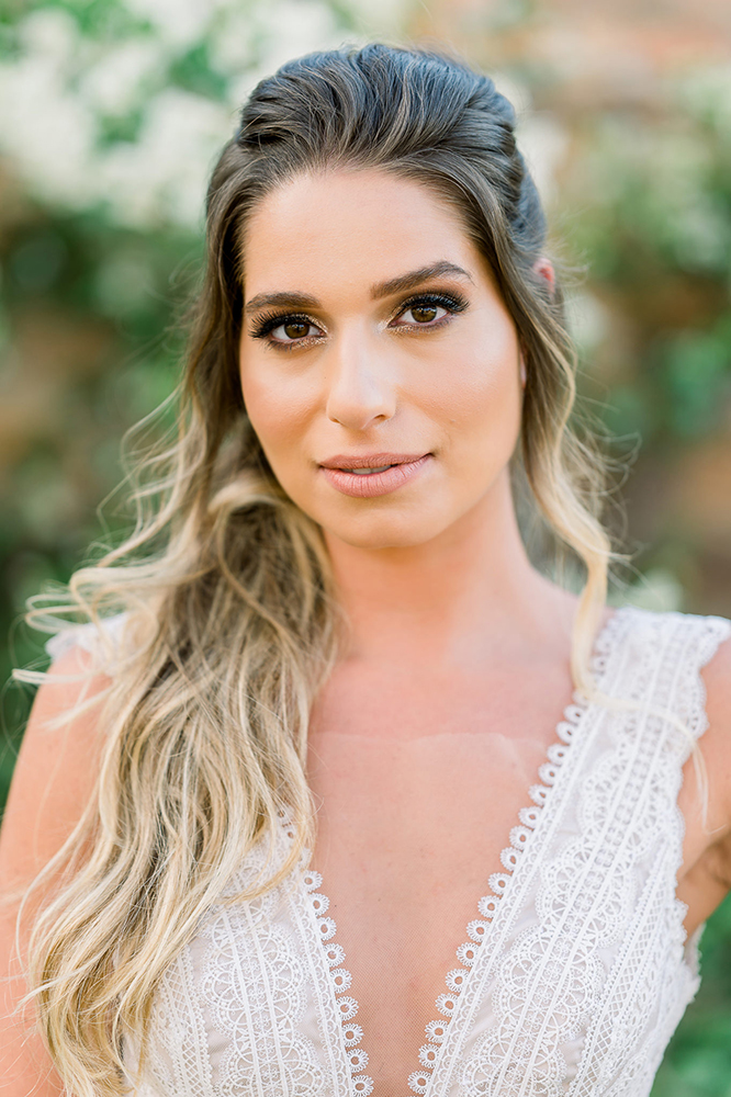 Reparem, por exemplo, no cabelo impecável da noiva, na make glow e nos demais detalhes da maquiagem. Tudo na medida para um super casamento no campo!