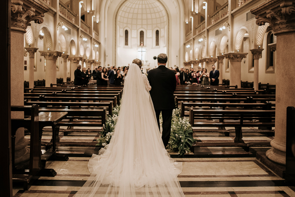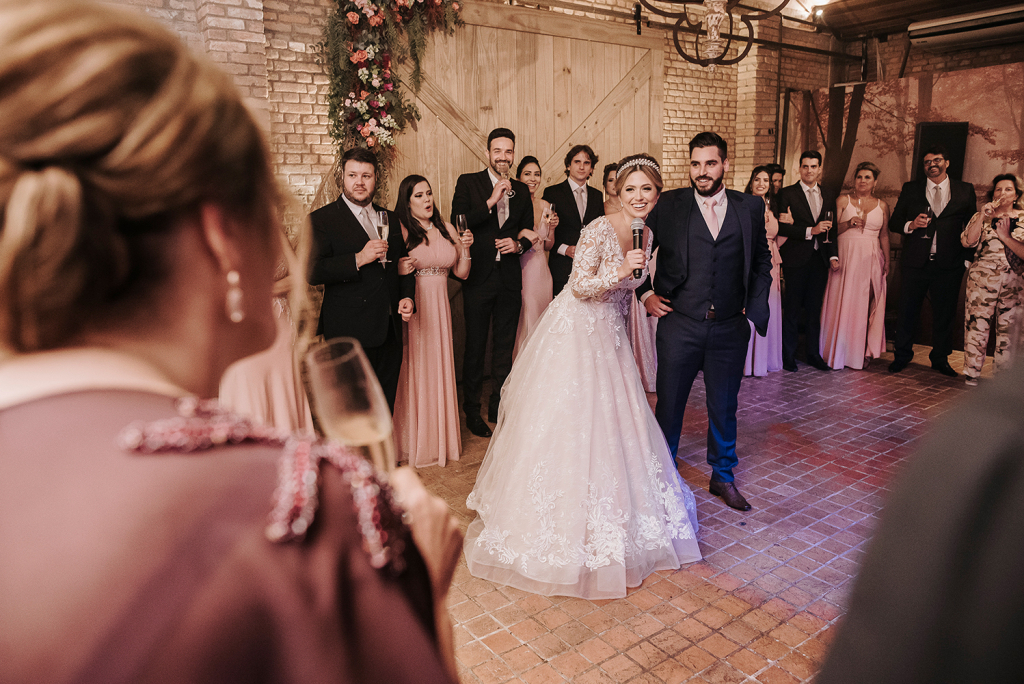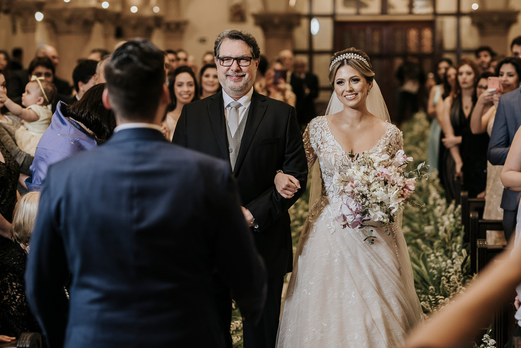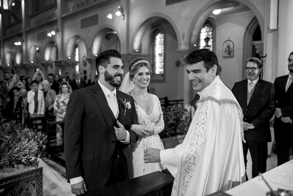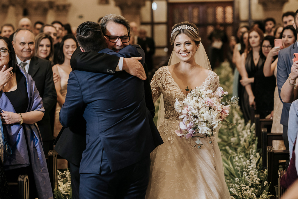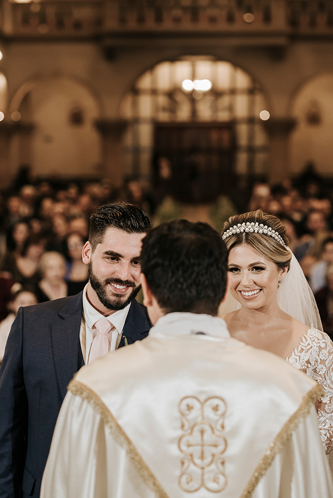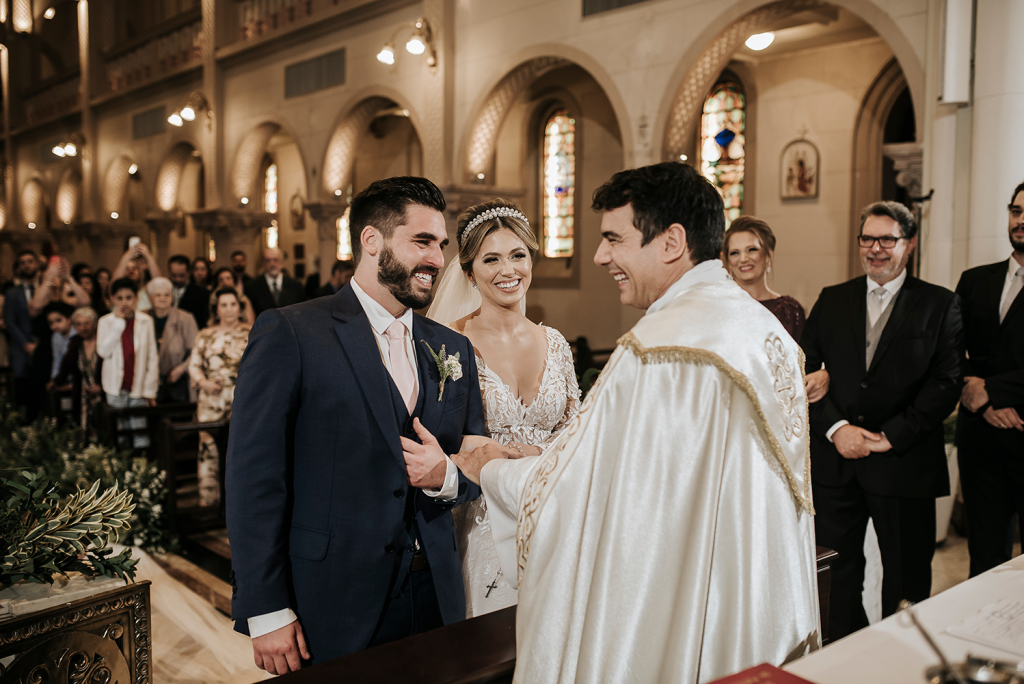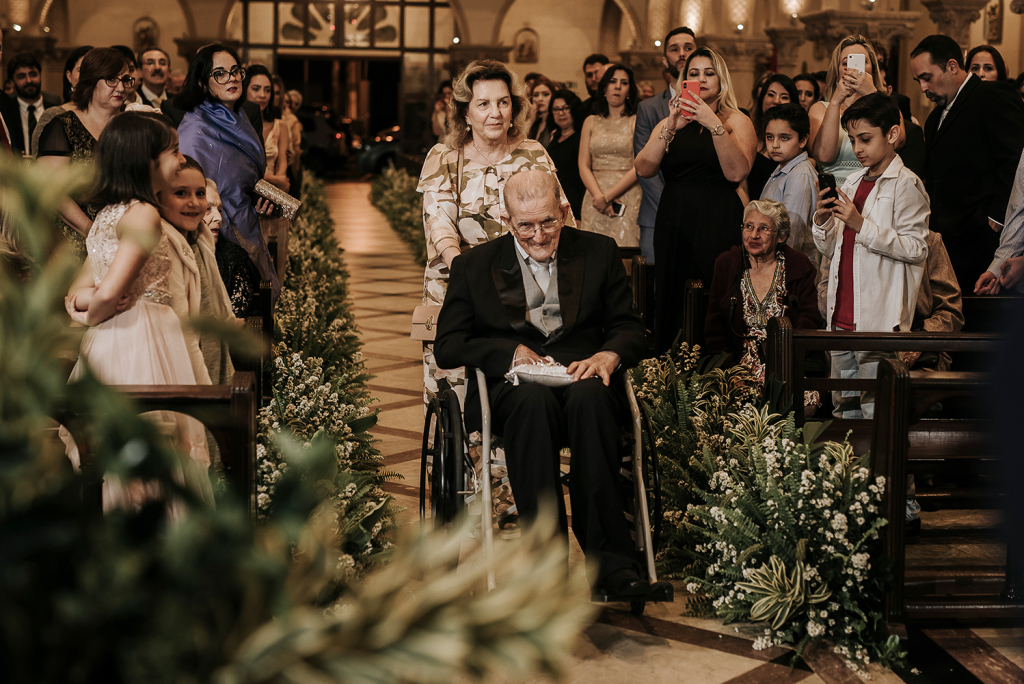 Foi uma cerimônia extremamente emocionante e que todos os convidados elogiaram. Um dos momentos mais emocionantes foi a entrada dos nossos avós com as alianças. Meu avô estava extremamente feliz, ele não via a hora de chegar o dia do casamento! Nós somos muito apegados um ao outro. E também foi emocionante pelo fato de eu ter perdido minha avó seis meses antes do casamento… Ela também entraria com as alianças, mas com certeza ela estava lá olhando por nós.