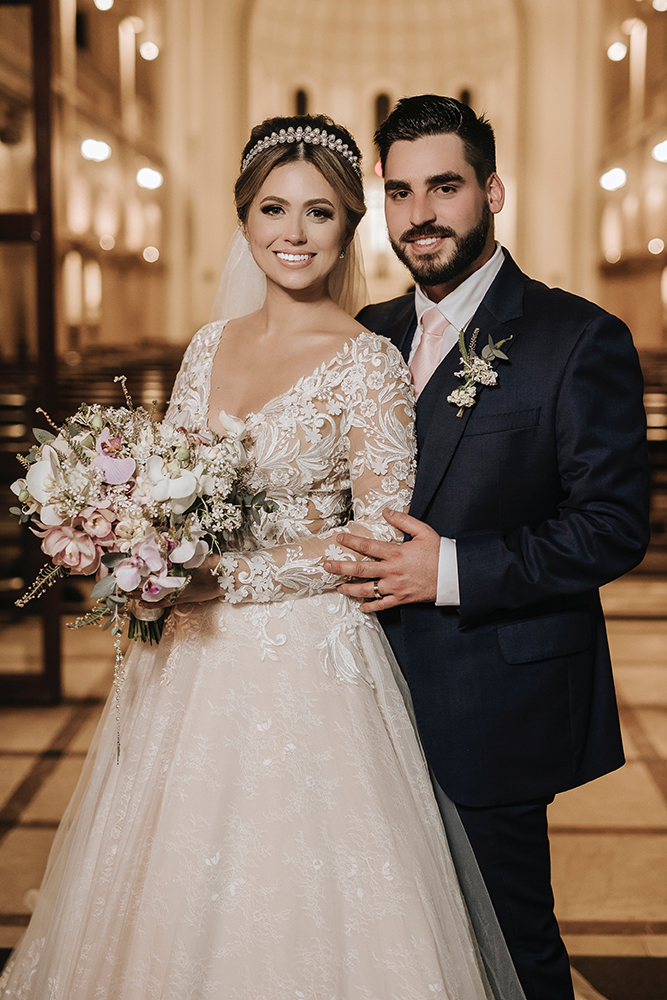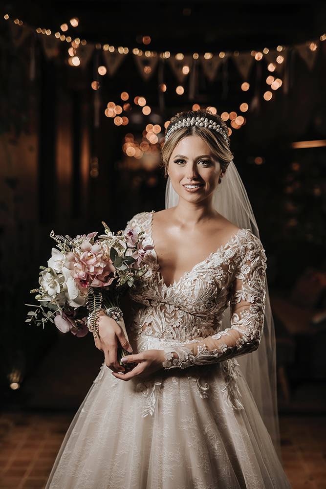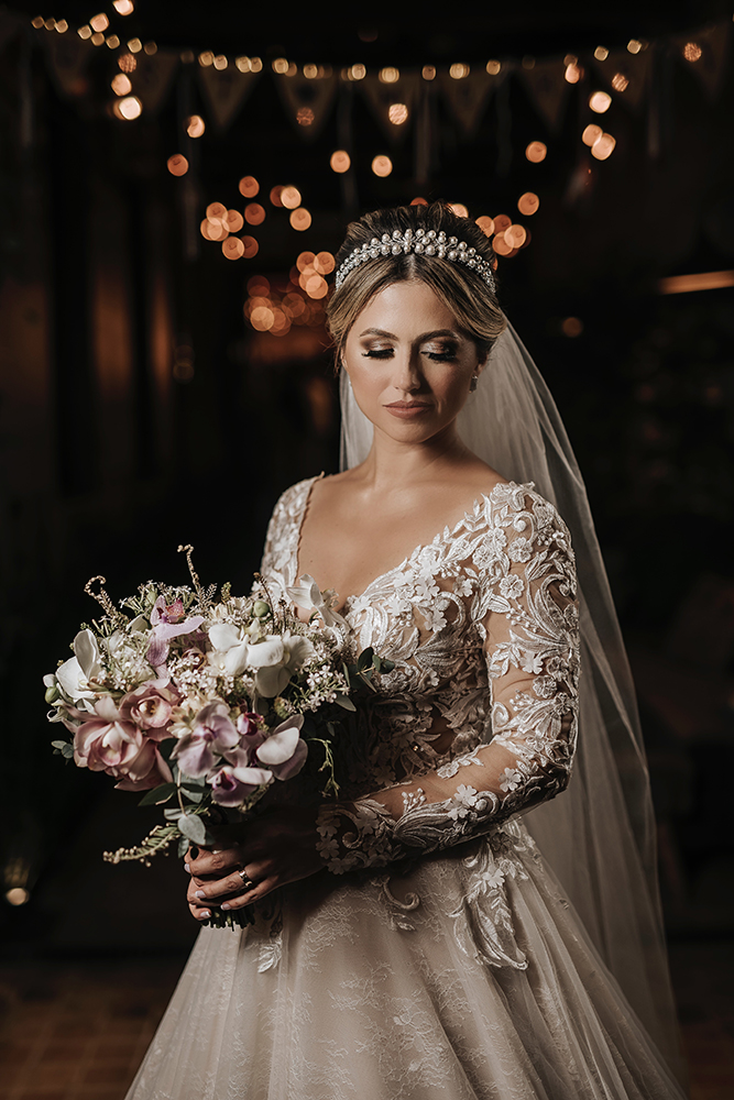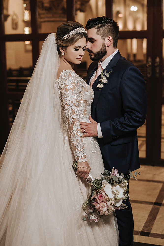 A noiva usou véu longo, vestido com mangas e renda, cabelo preso e tiara de pérolas. Uma verdadeira princesa contemporânea!
