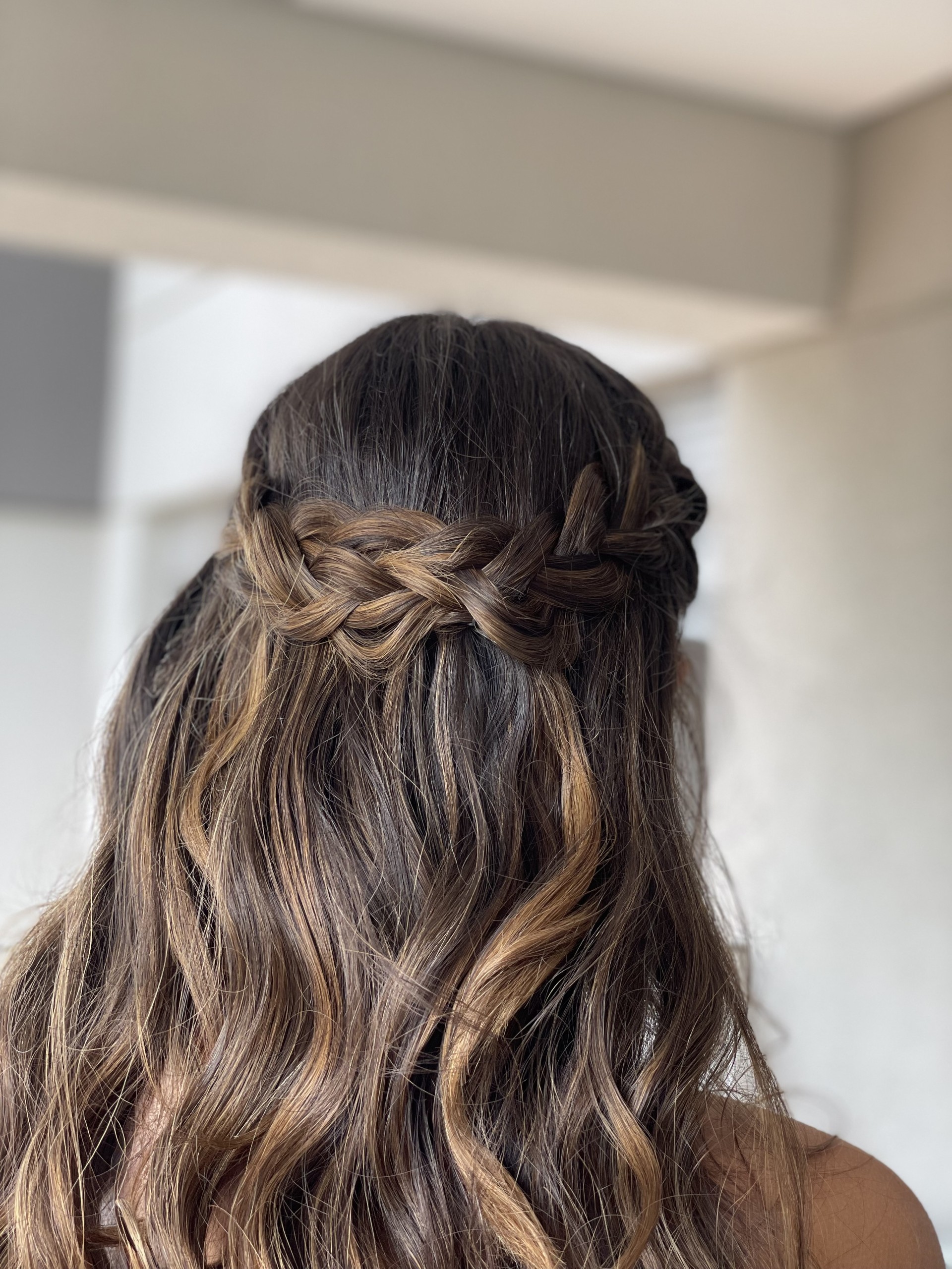 O cabelo semi-preso pode não ser a melhor escolha para noivas com detalhes muito significativos na parte detrás do vestido.