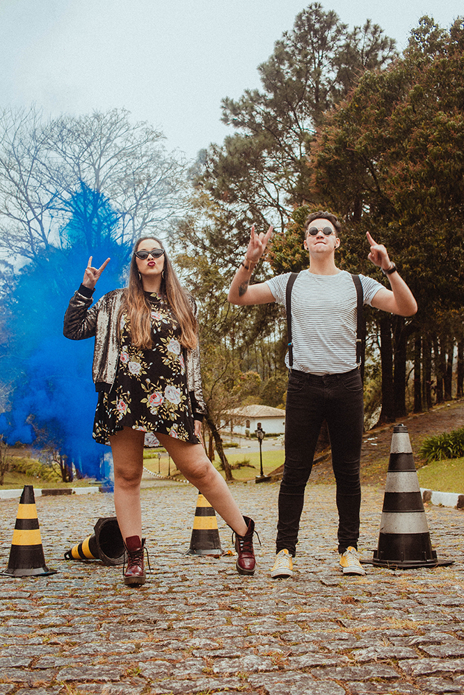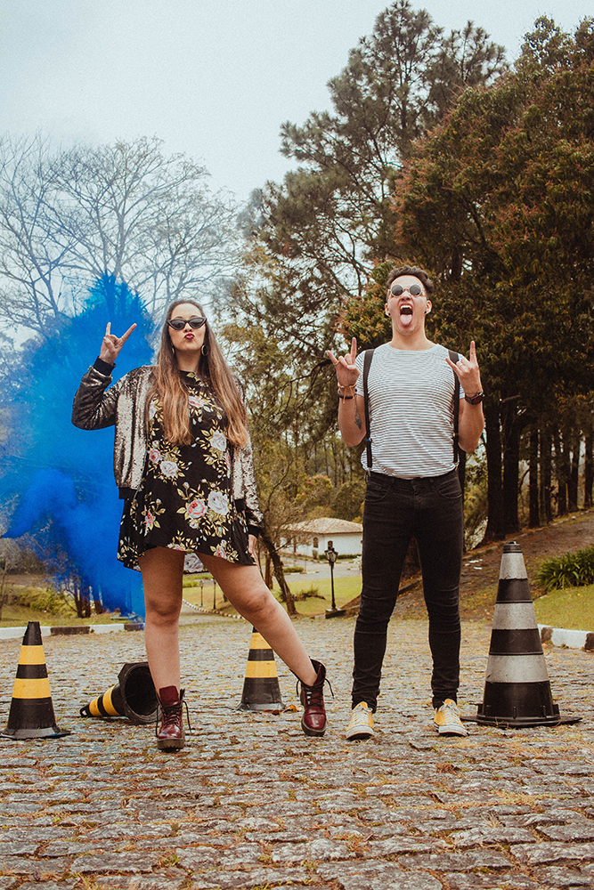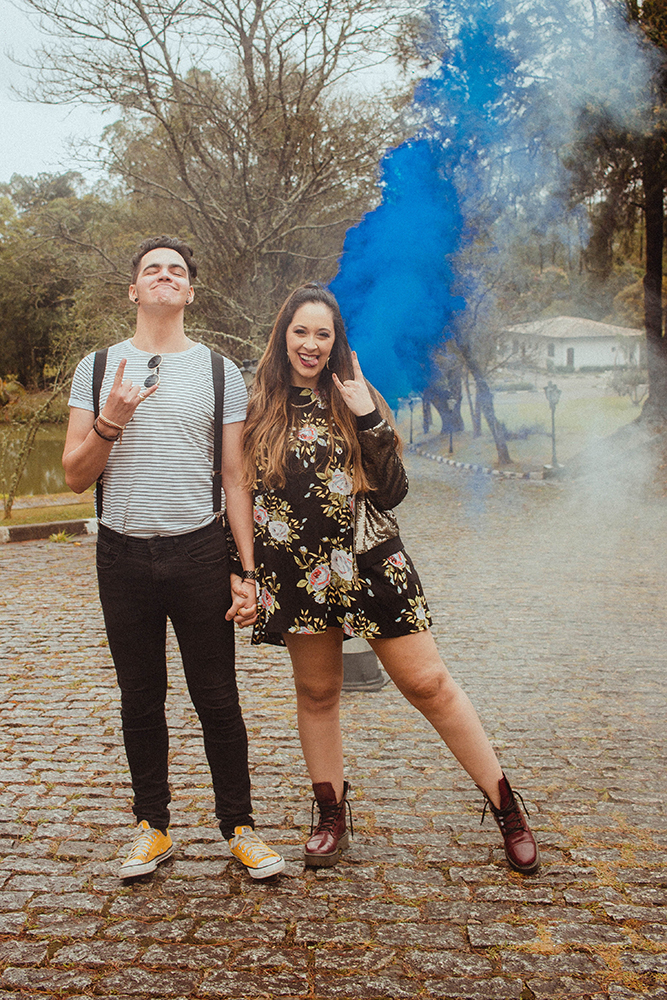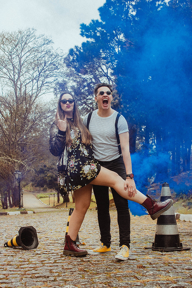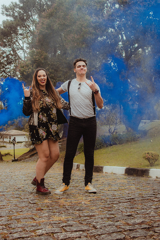 Já que o Lollapalooza é conhecido pelas cores vibrantes num estilo mais alternativo, aplicamos isso no pré wedding. A fumaça azul, por exemplo, é a cor do casamento.