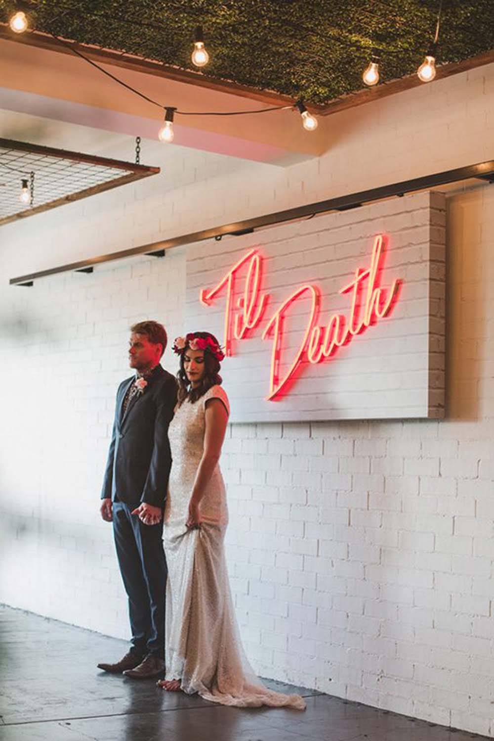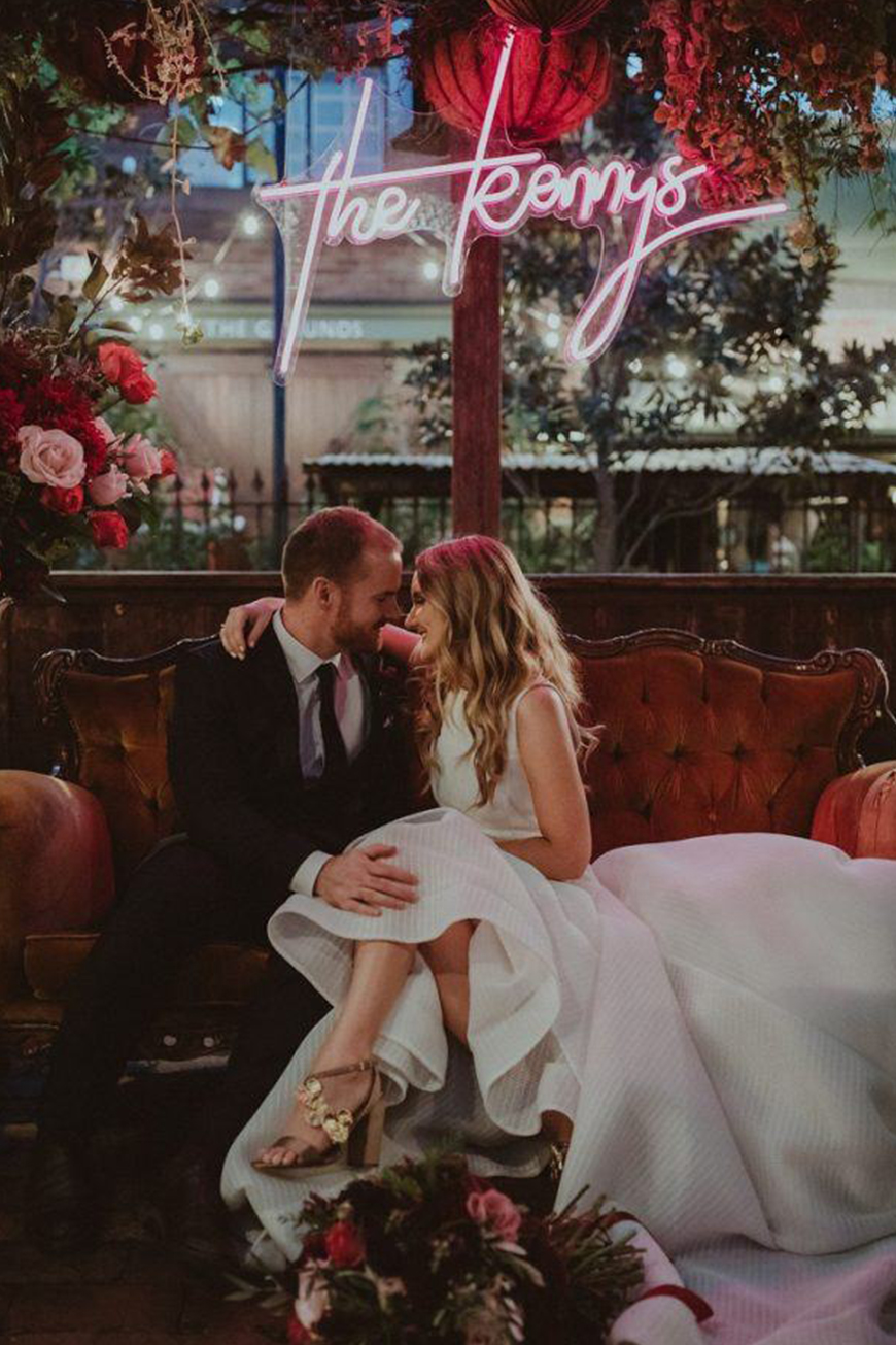 O neon é despojado, alegre, chama a atenção e ainda pode aparecer naquela frase especial para os noivos.