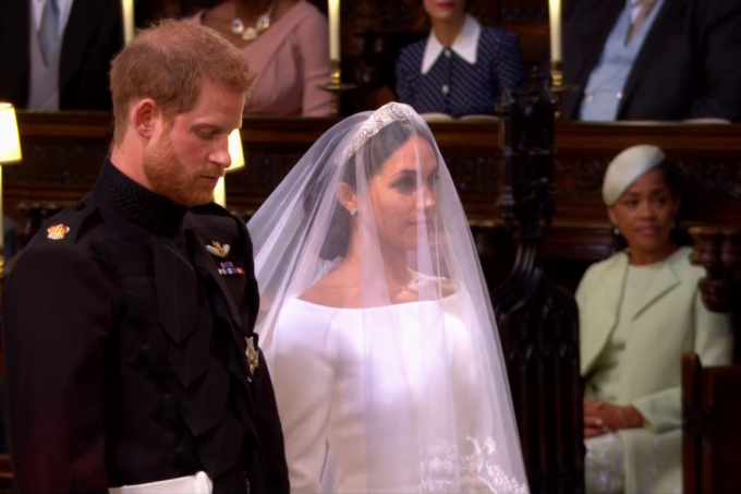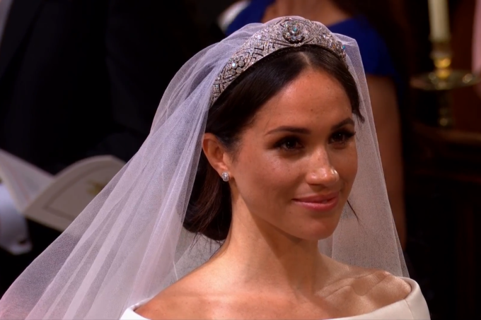 Como acessório, Meghan usou uma tiara feita para a rainha Mary em 1932. O diamante central da joia foi dado à monarca em 1893.