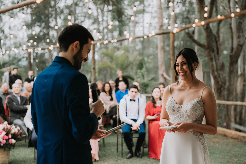 Aliás, os noivos escolheram o espaço em Atibaia porque queriam um casamento ao ar livre, com cerimônia no campo e pôr do sol.