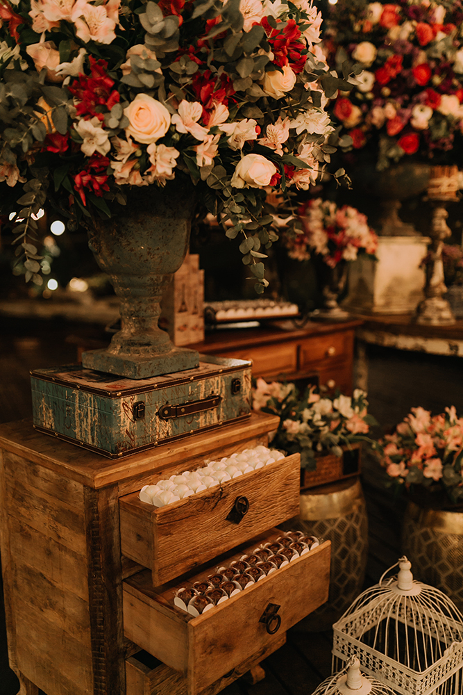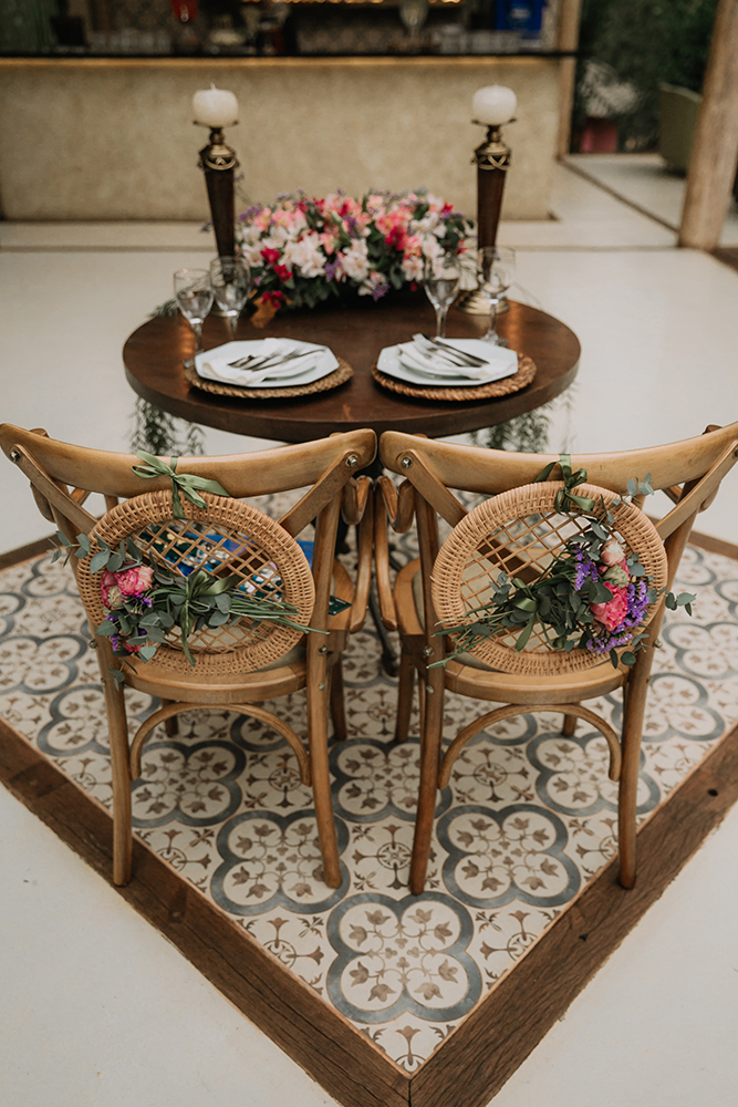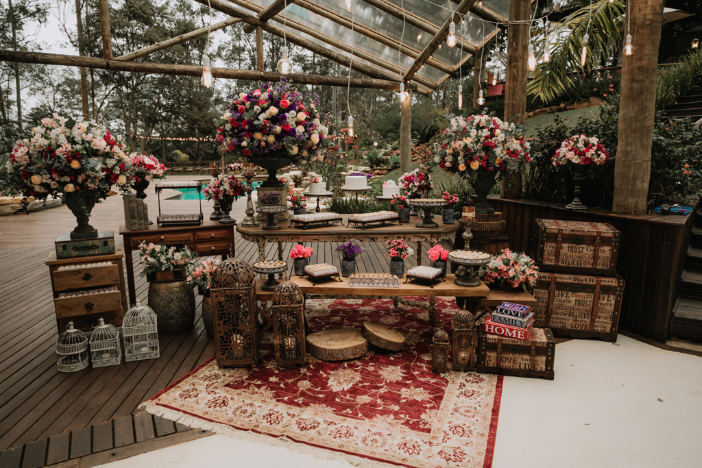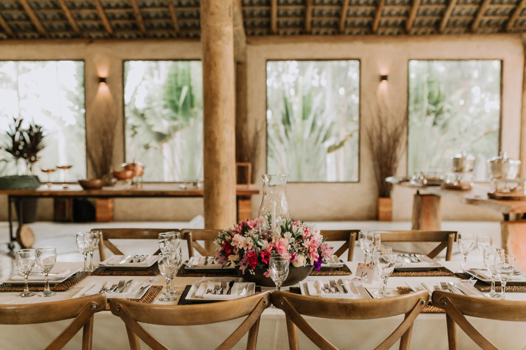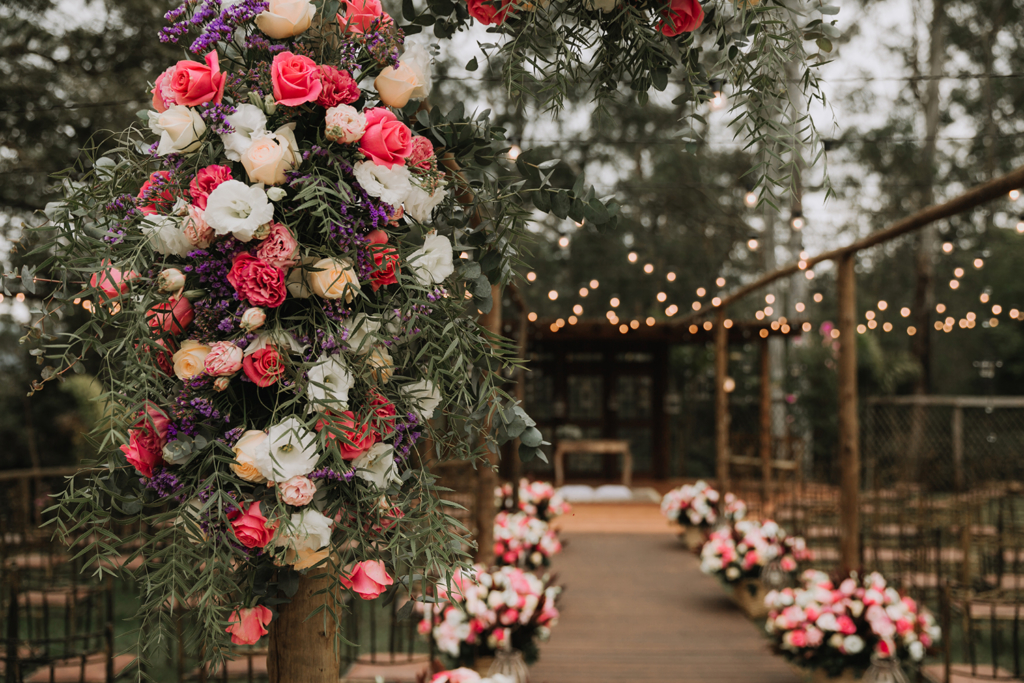 Um dos motivos da escolha do local foi a natureza exuberante na qual ele está inserido. Optamos por flores em tons de rosa e lilás para realçar ainda mais a beleza natural do Vila dos Eucaliptos.