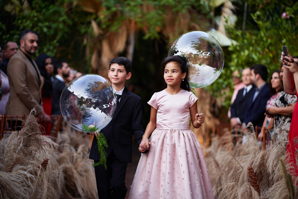 Kiki foi responsável por levar as alianças aos noivos, vestindo uma roupa inspirada no vestido da noiva, também assinado por Fernando Peixoto Atelier.