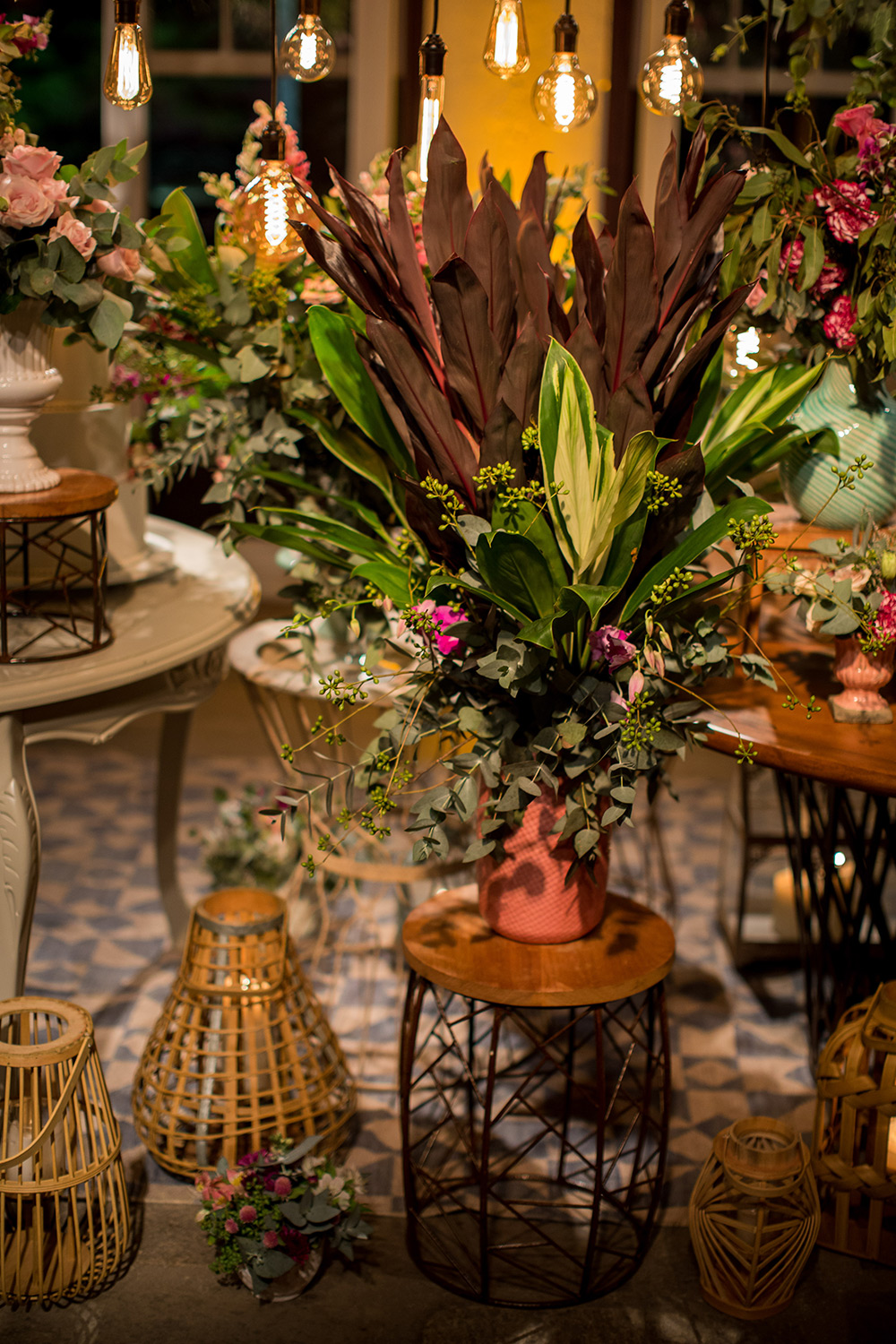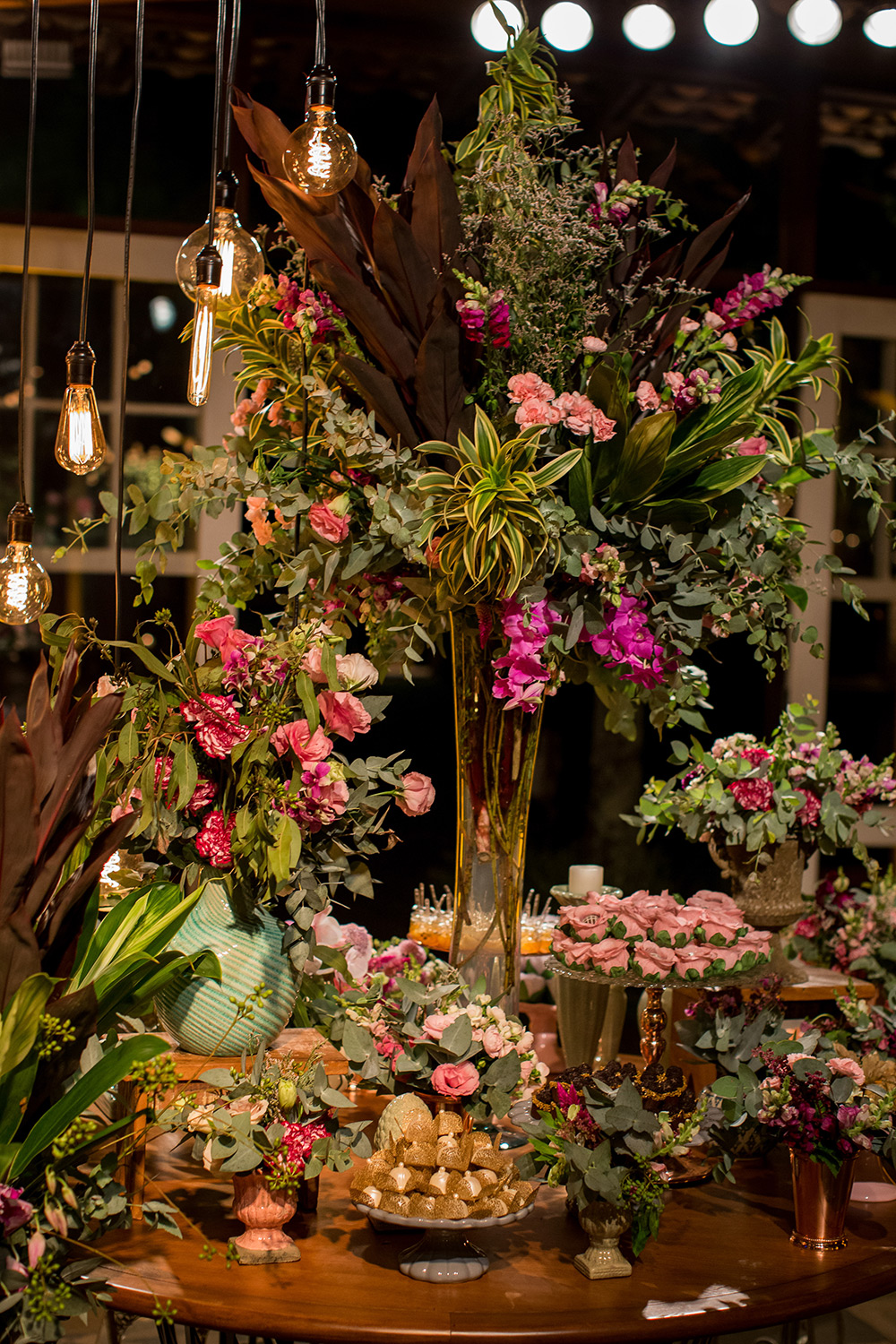 Para a decoração, escolhemos o estilo boho chic com paleta de cores em tons marsala, rosa, verde e branco. Elementos de madeira e rústicos eram super bem-vindos. A Glau Miranda me garantiu uma mesa de doces desconstruída, 360 graus e com lâmpadas de filamento. Os doces? Minha família, que ama confeitaria, produziu todos eles!