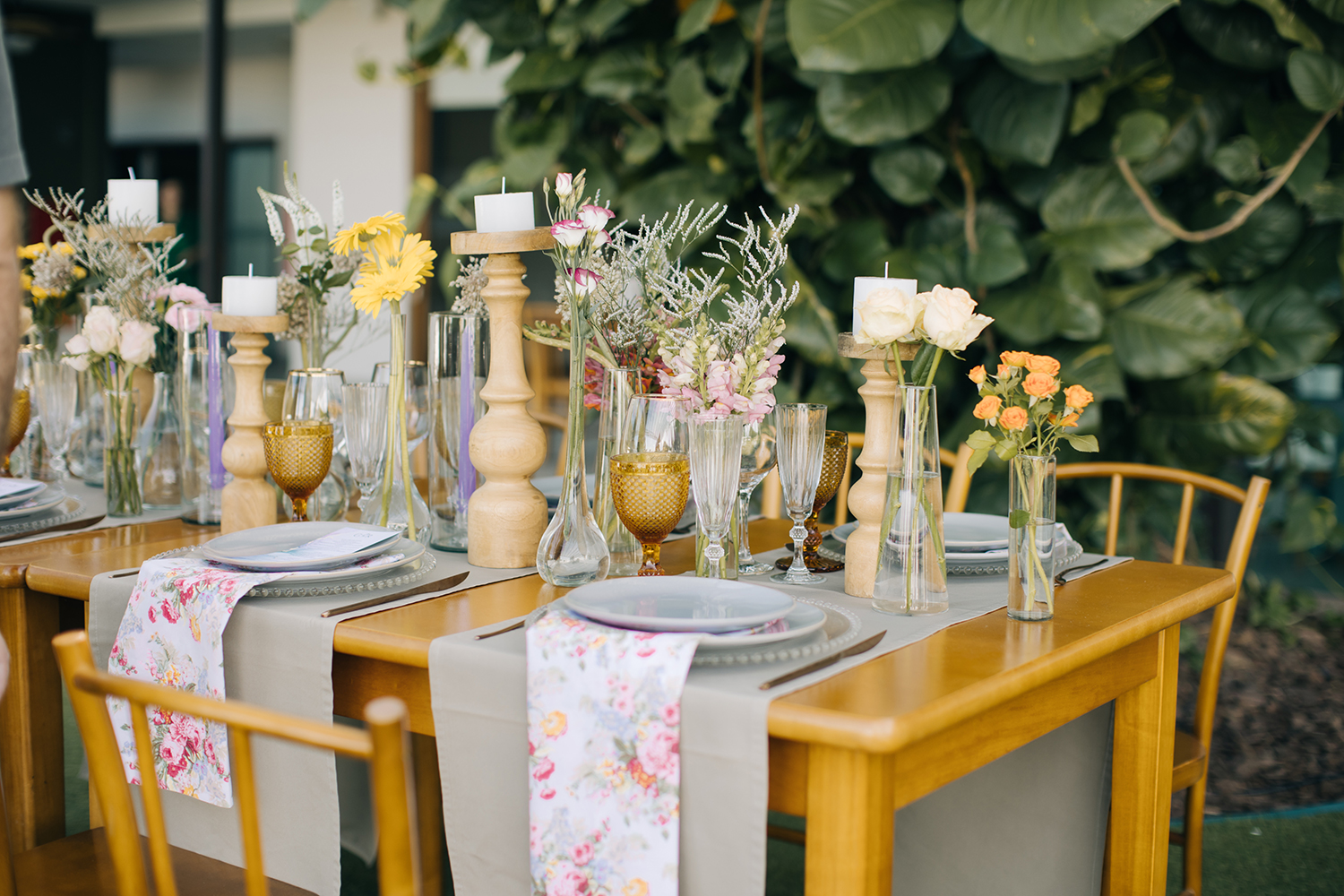 Arranjos florais simples e delicados, com várias espécies de flores, tomaram conta da mesa e dividiram espaço com as lindas peças da Ritz.