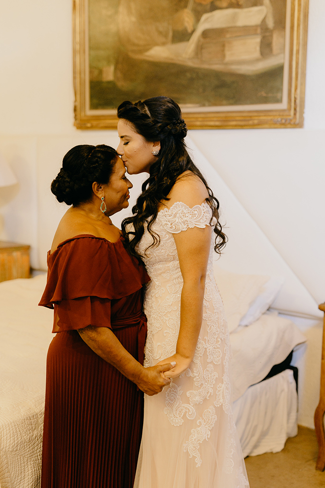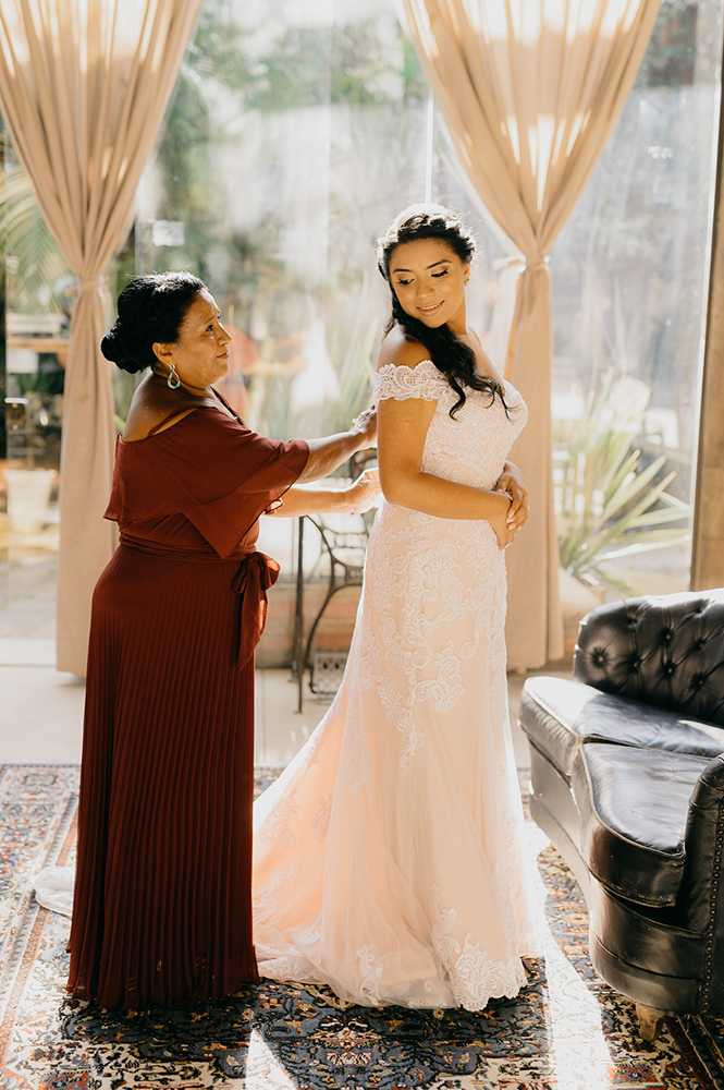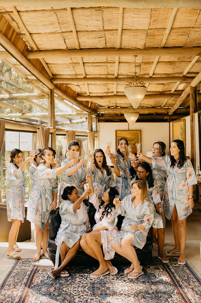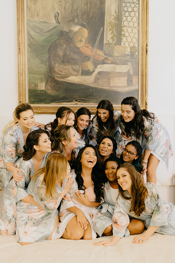 Madrinhas com robes combinando, troca de carinho com a mãe, um buquê UAU e uma noiva plena. Com toda a certeza, não precisa de mais nada!