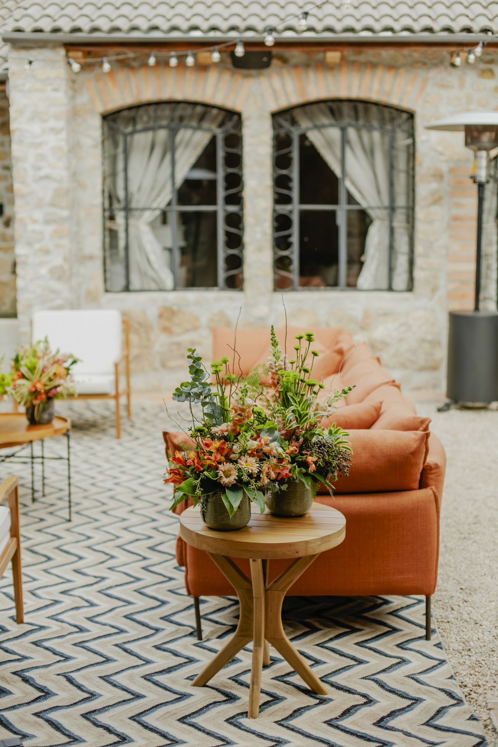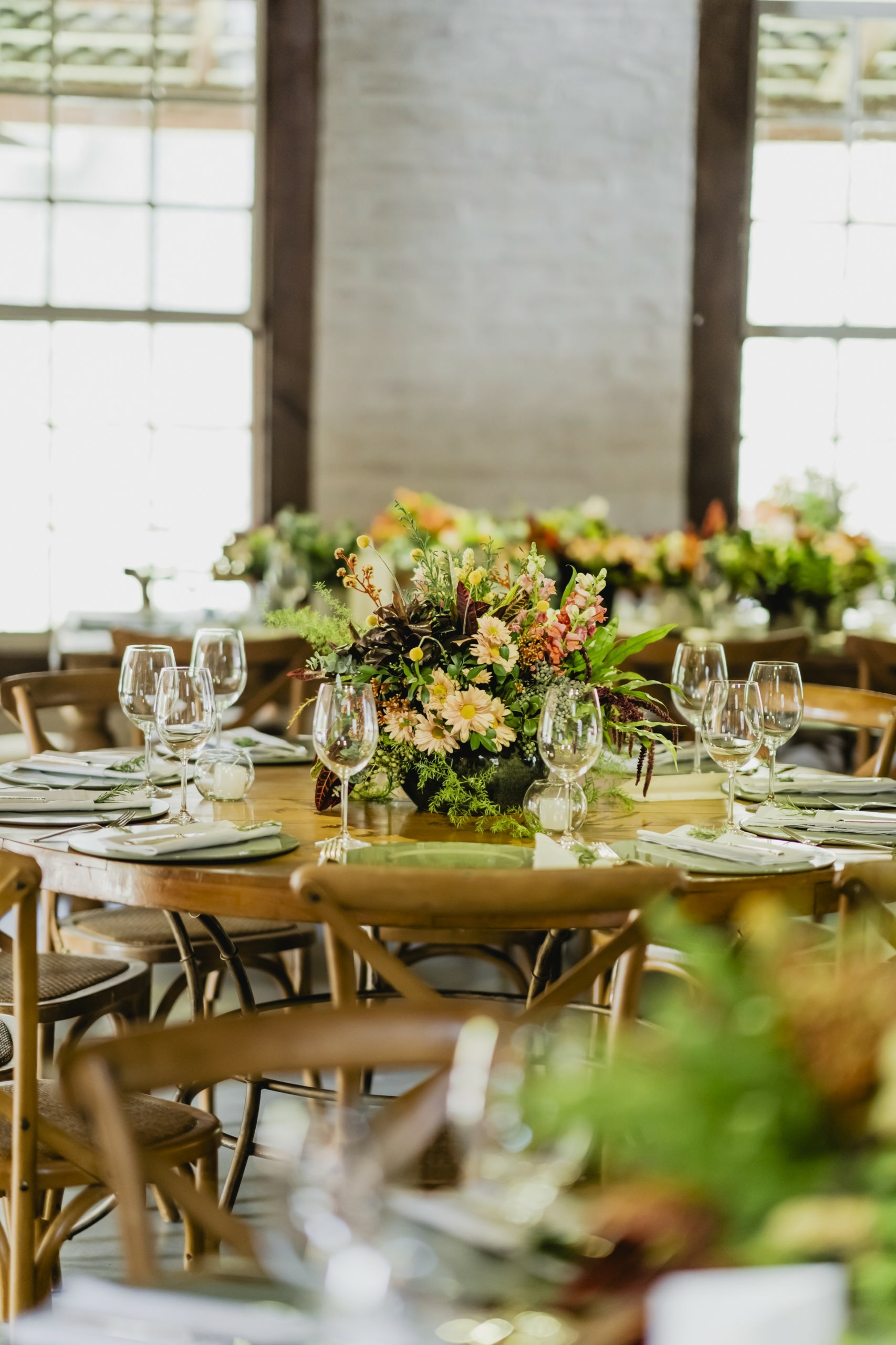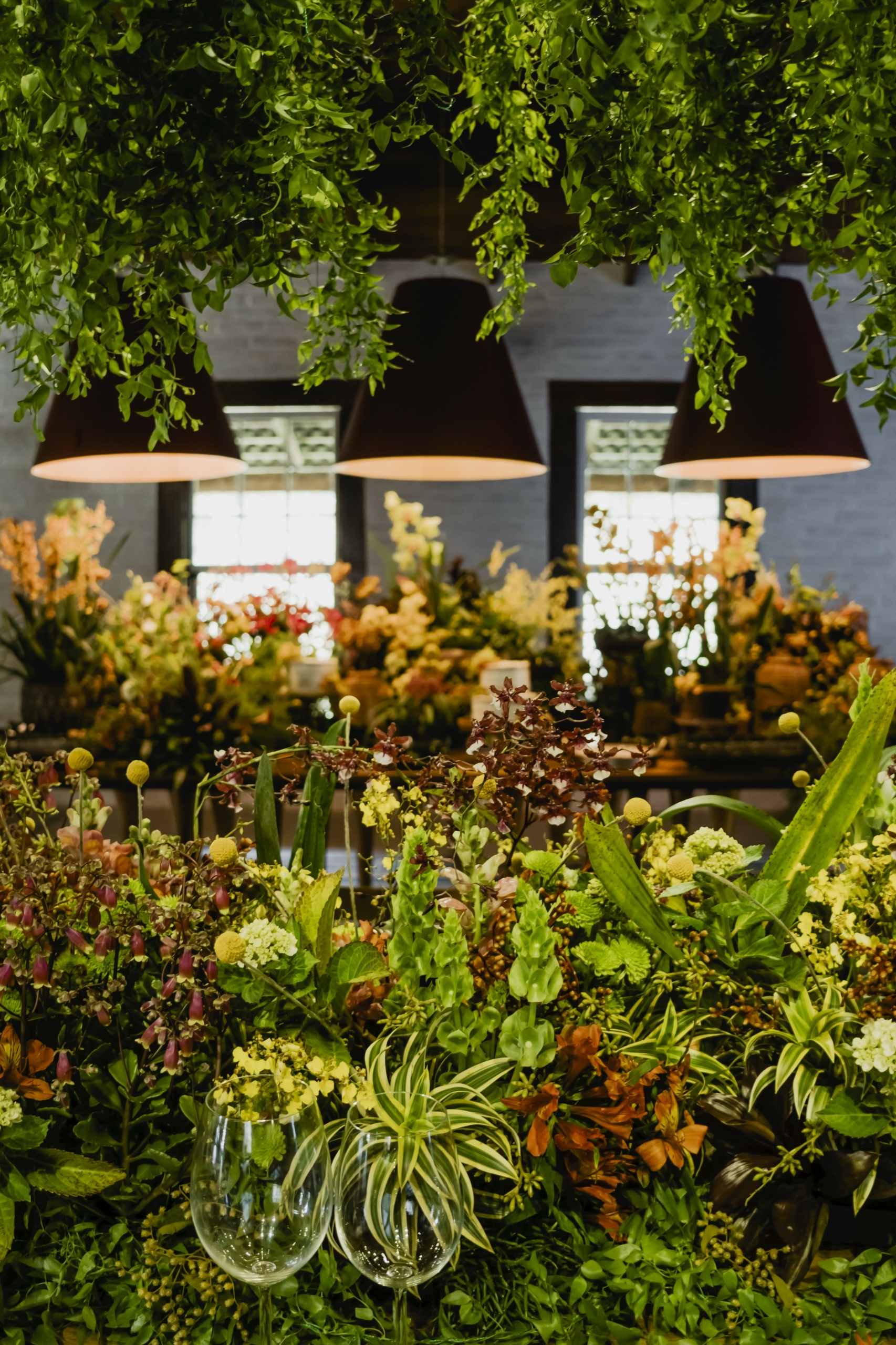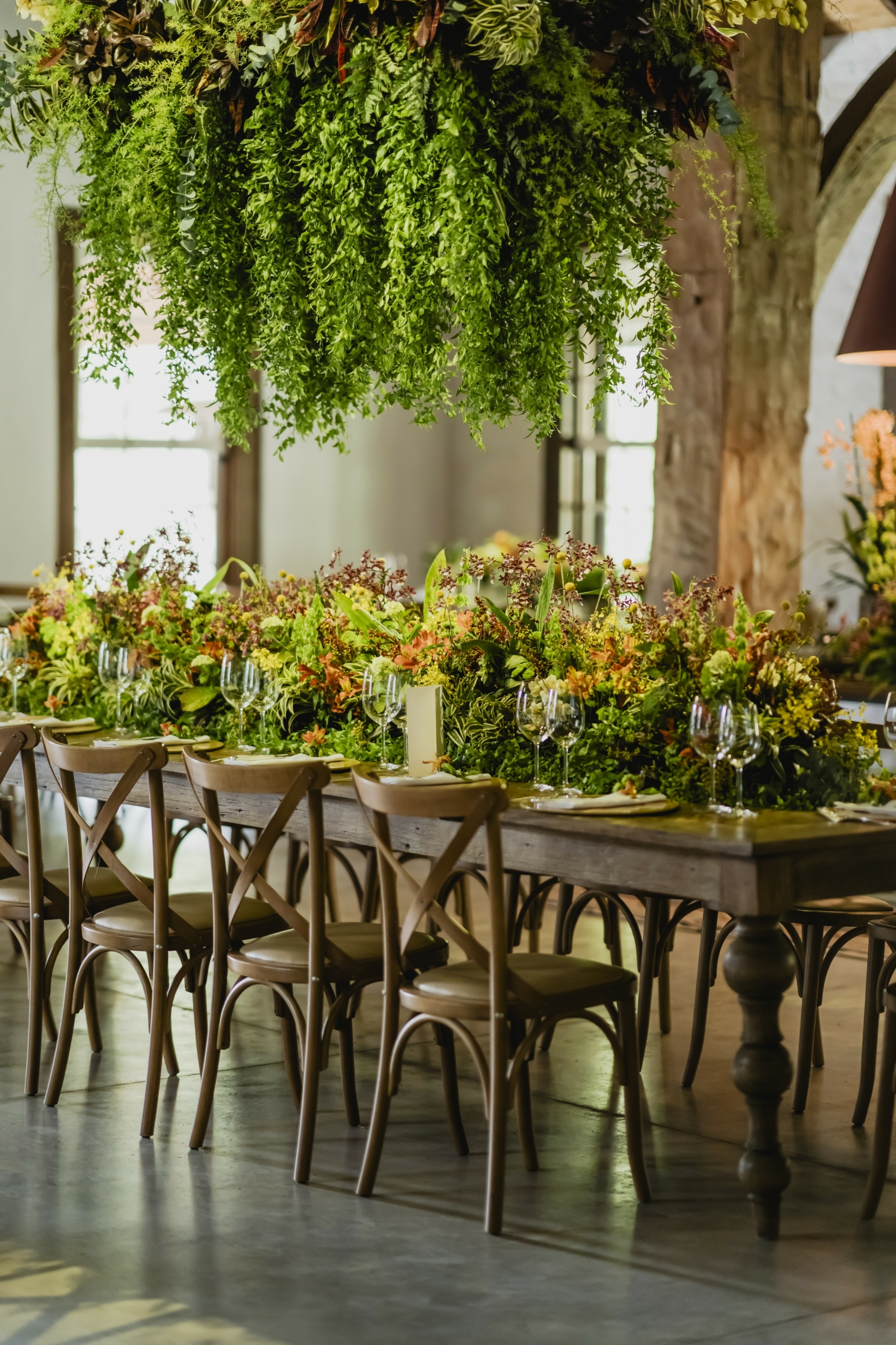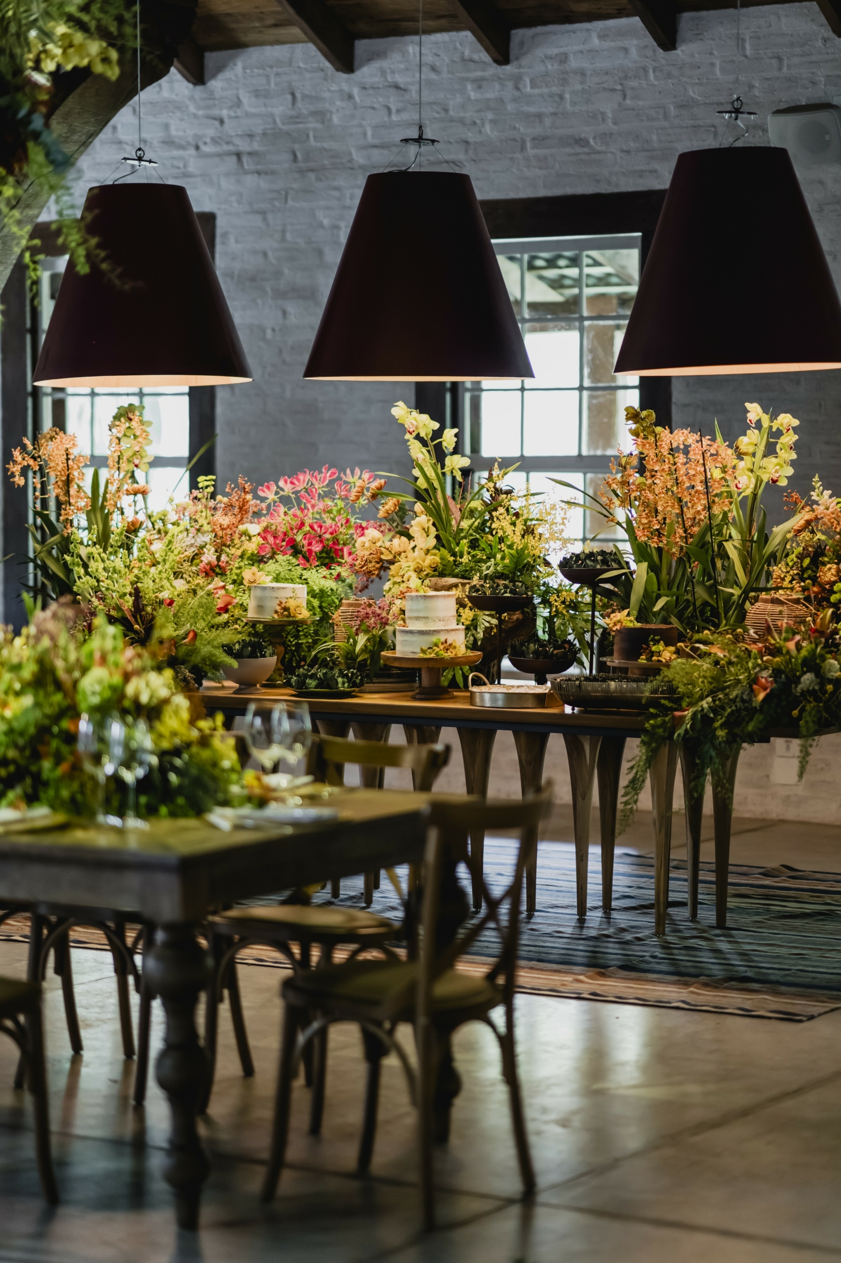 O Ville La Rochelle ganhou uma linda decoração orgânica. Dessa forma, nota-se a conexão com a natureza através de arranjos que exploram o verde, além de grande variedade de flores.