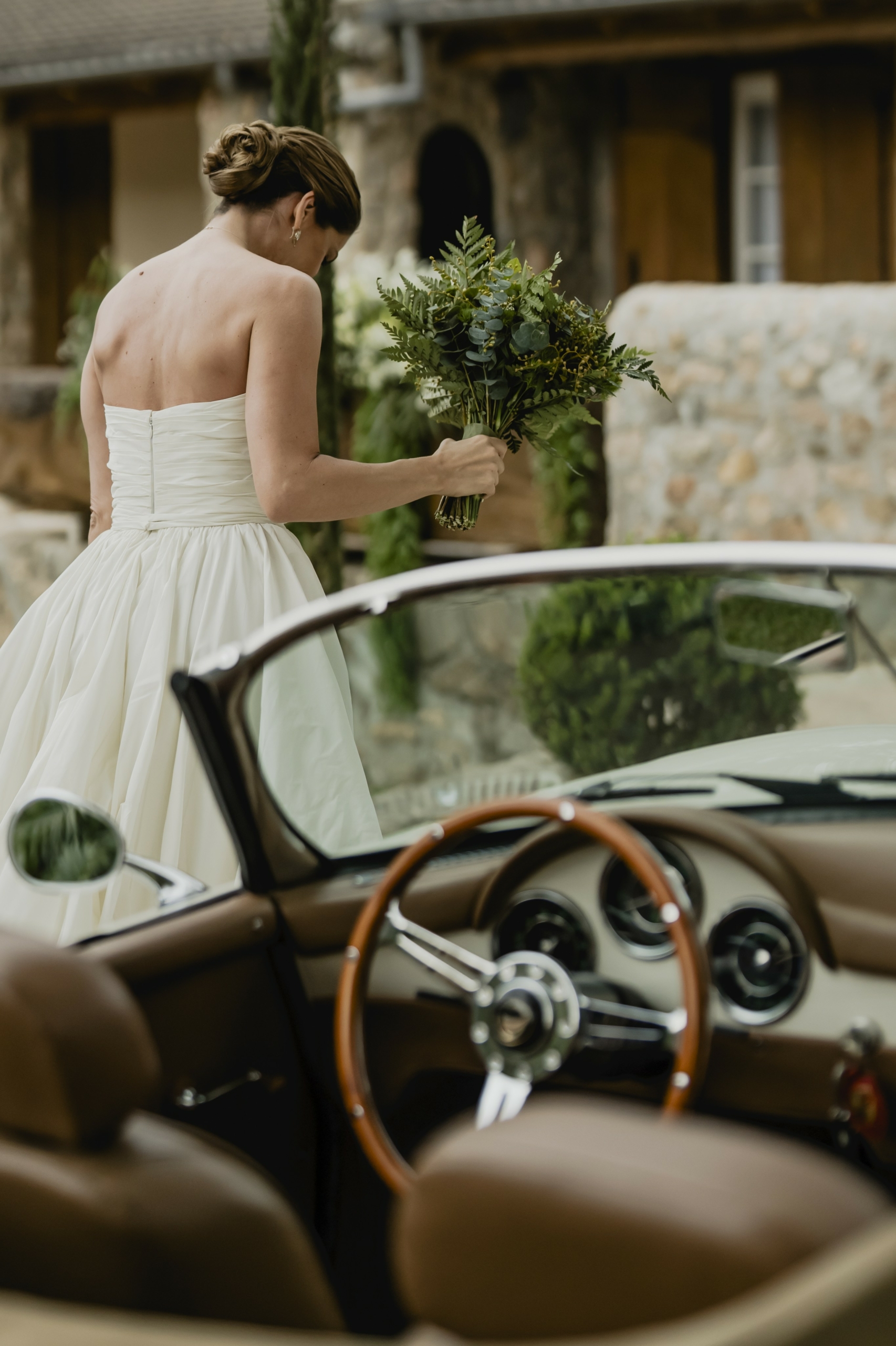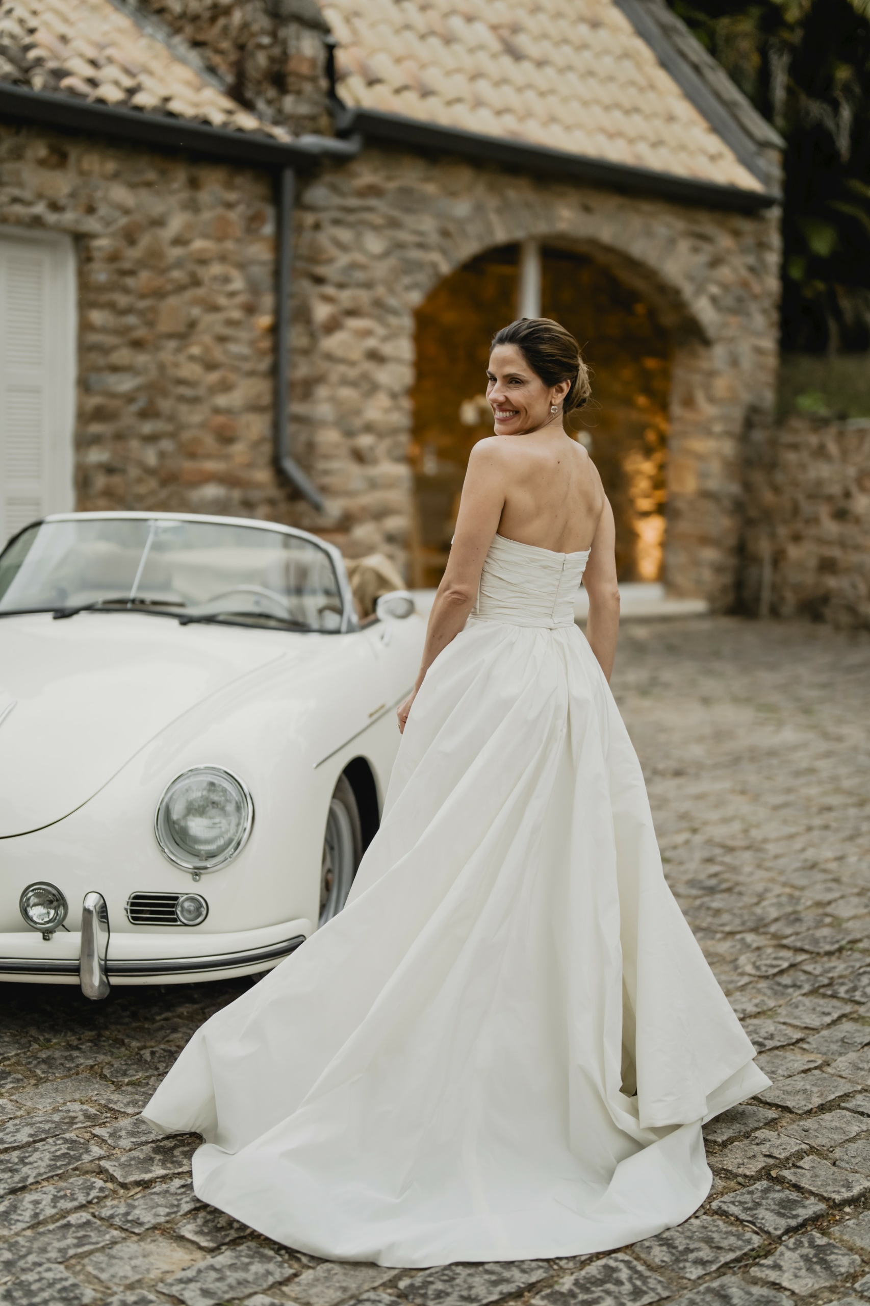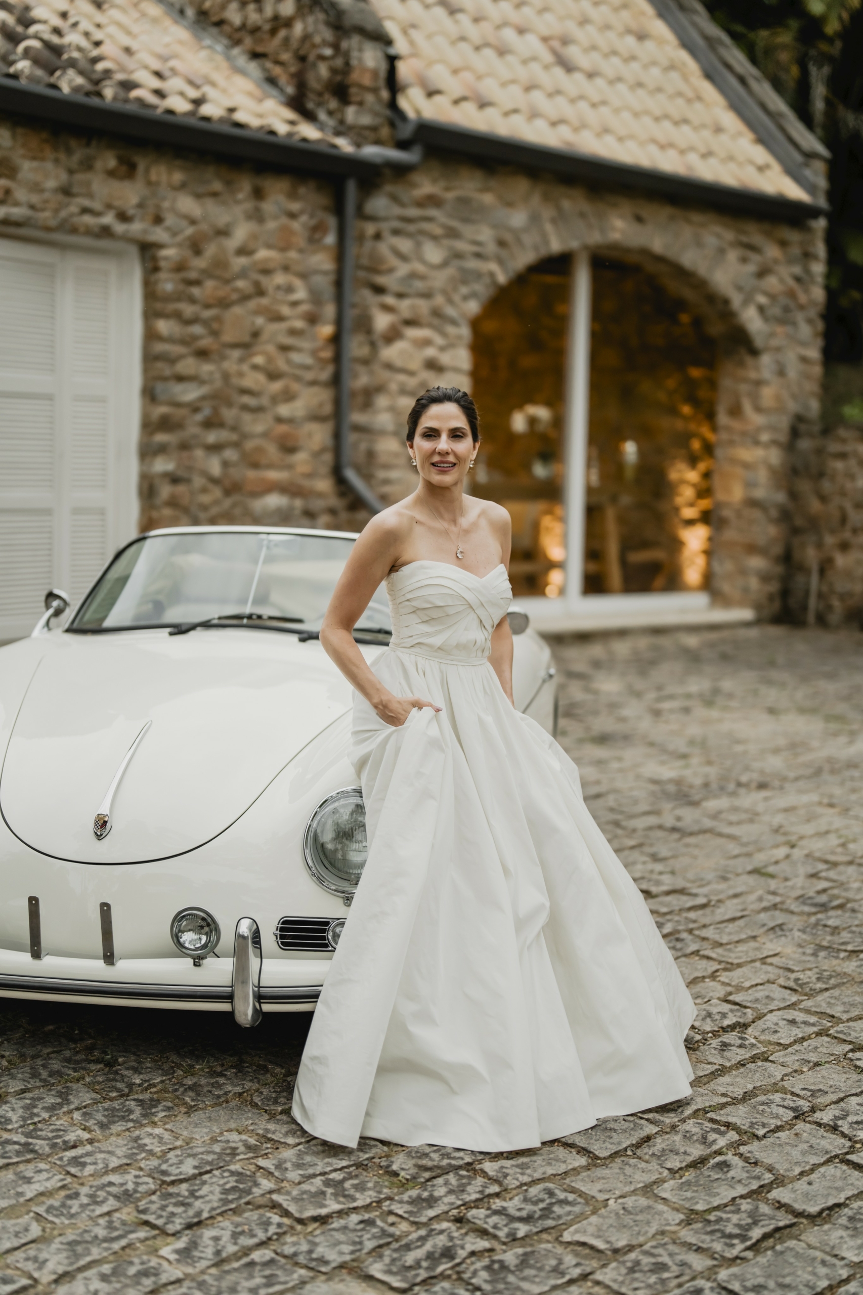 Outro destaque é o vestido de noiva, um tomara que caia com saia evasê e bolsos. Novamente a ideia de combinar o romantismo e a sofisticação com toques de modernidade.