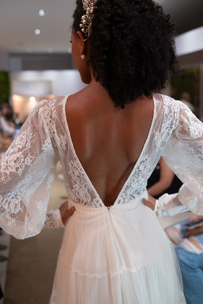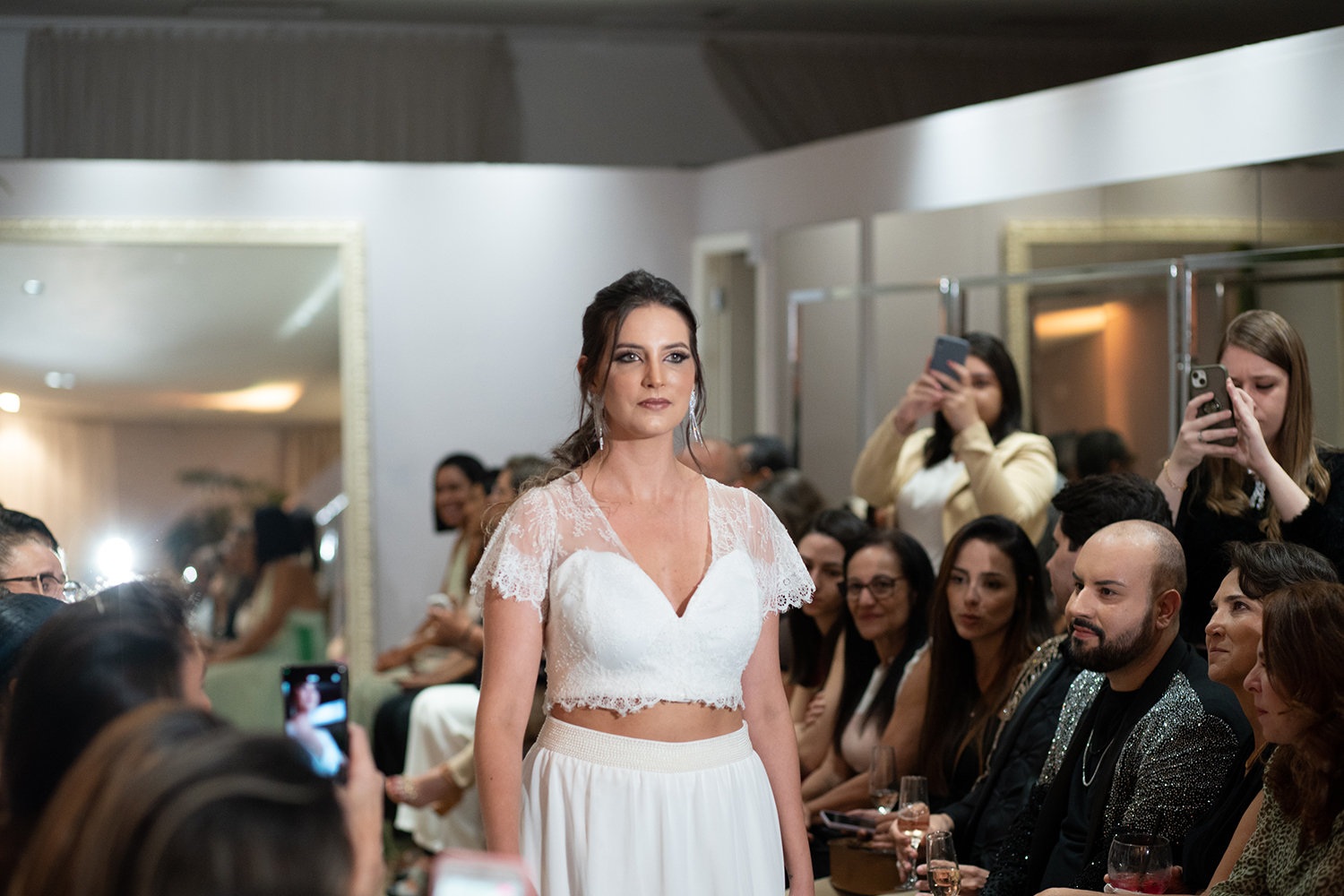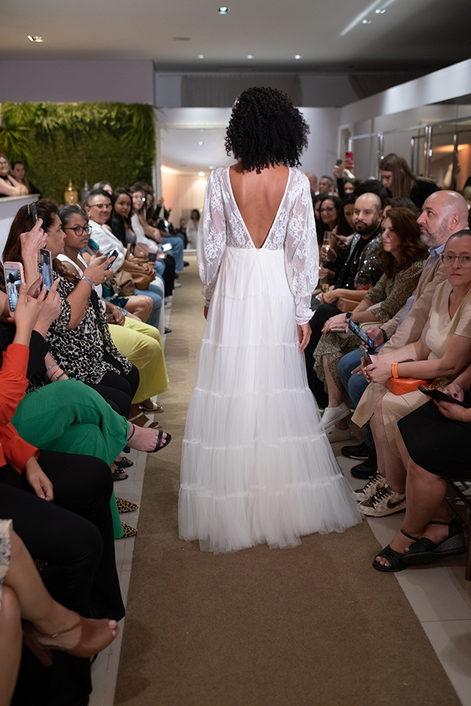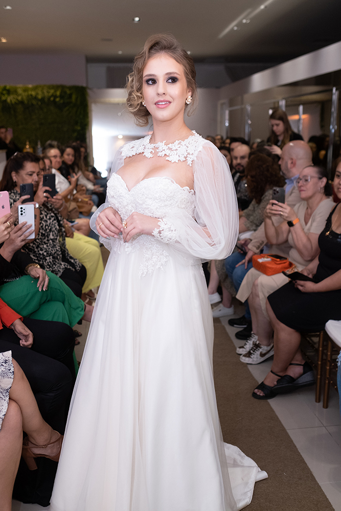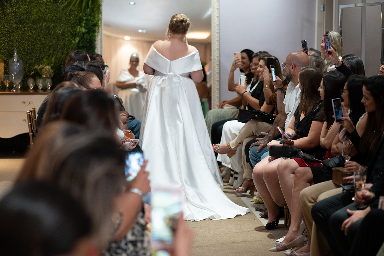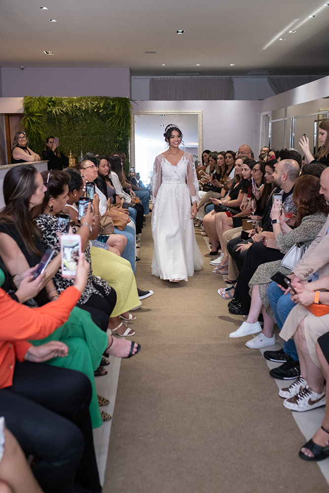 A coleção de vestidos de noiva foi apresentada de maneira leve e interativa. Dessa forma, noivas e assessores foram recebidos lindamente, com direito a buffet, bar e mais uma série de parceiros.