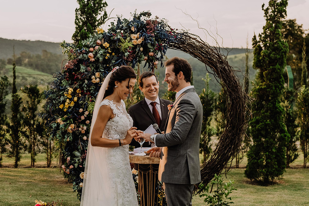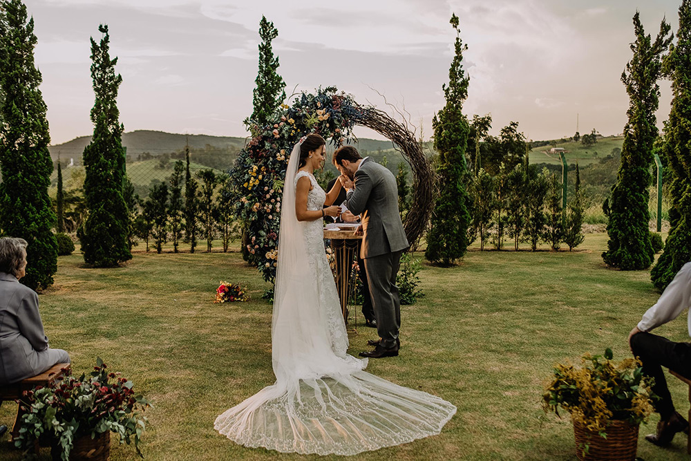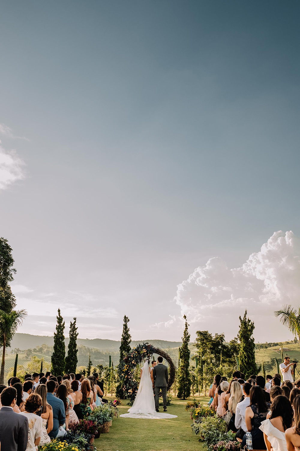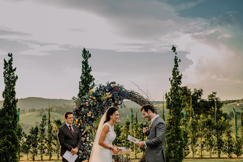 Amantes de bom vinho, o casal trocou alianças ao ar livre, garantindo muito verde, aconchego e amor.