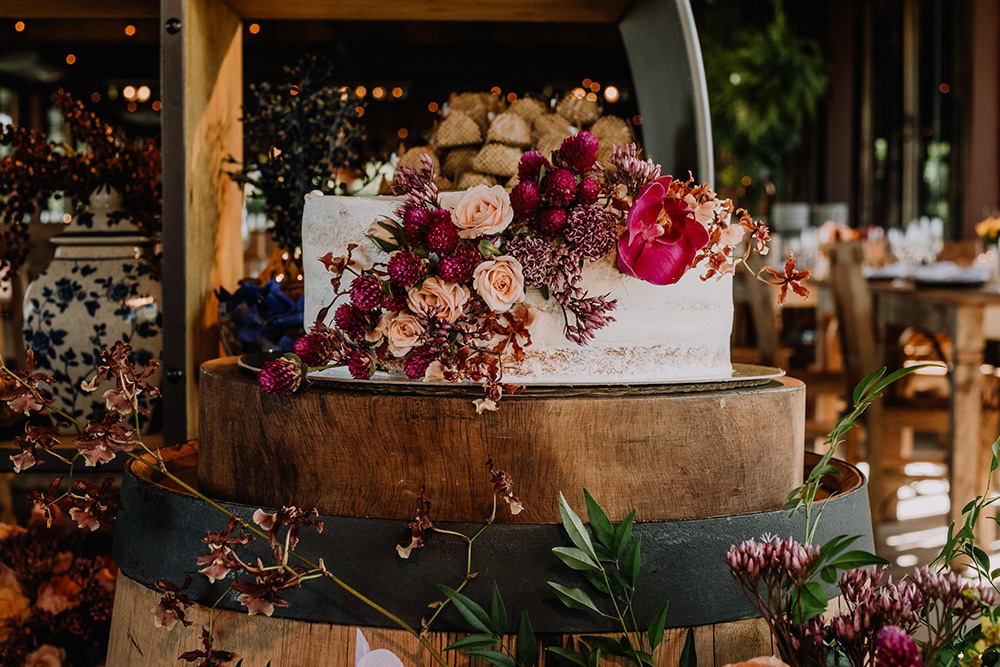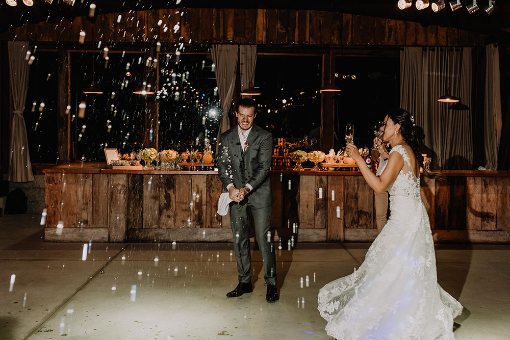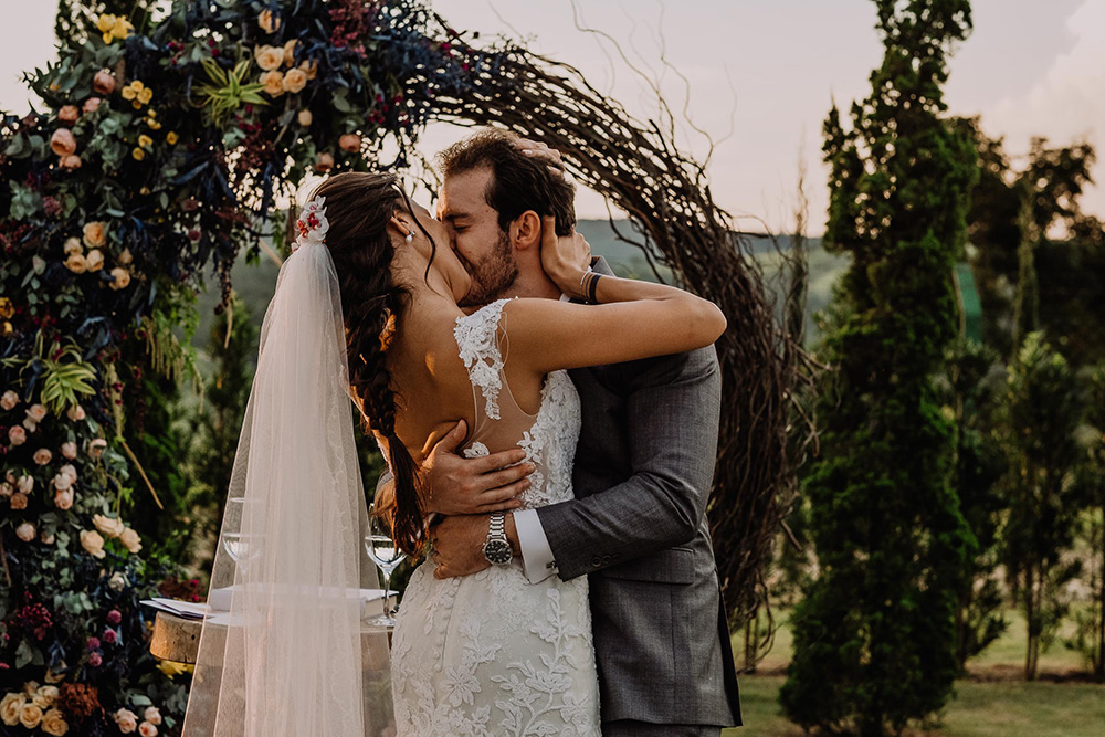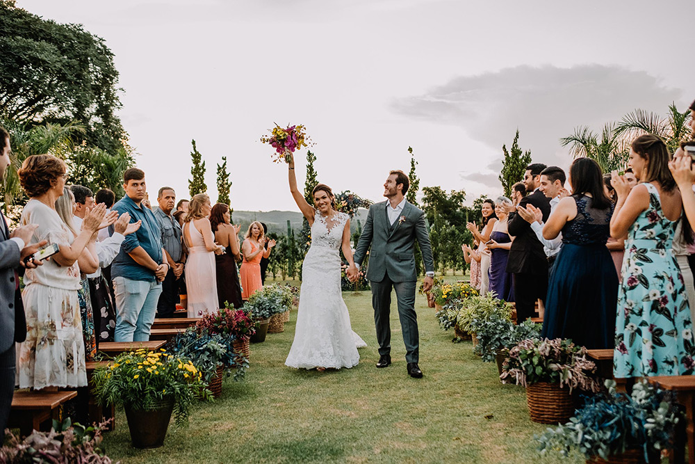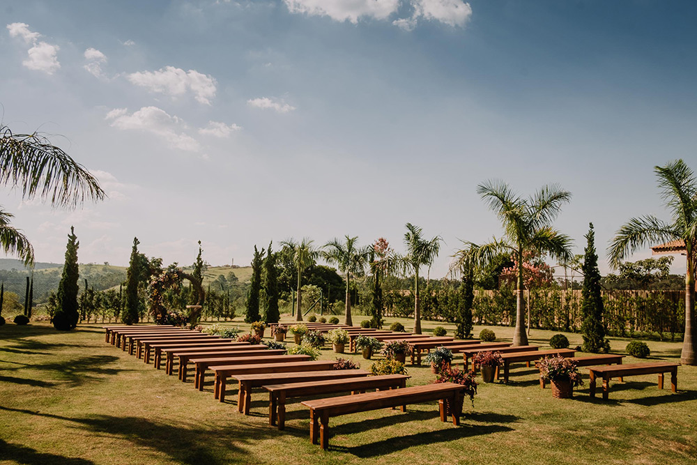 Amantes de bom vinho, o casal trocou alianças ao ar livre, garantindo muito verde, aconchego e amor.