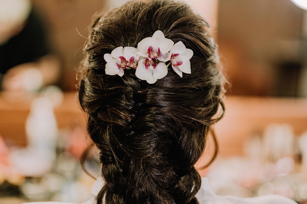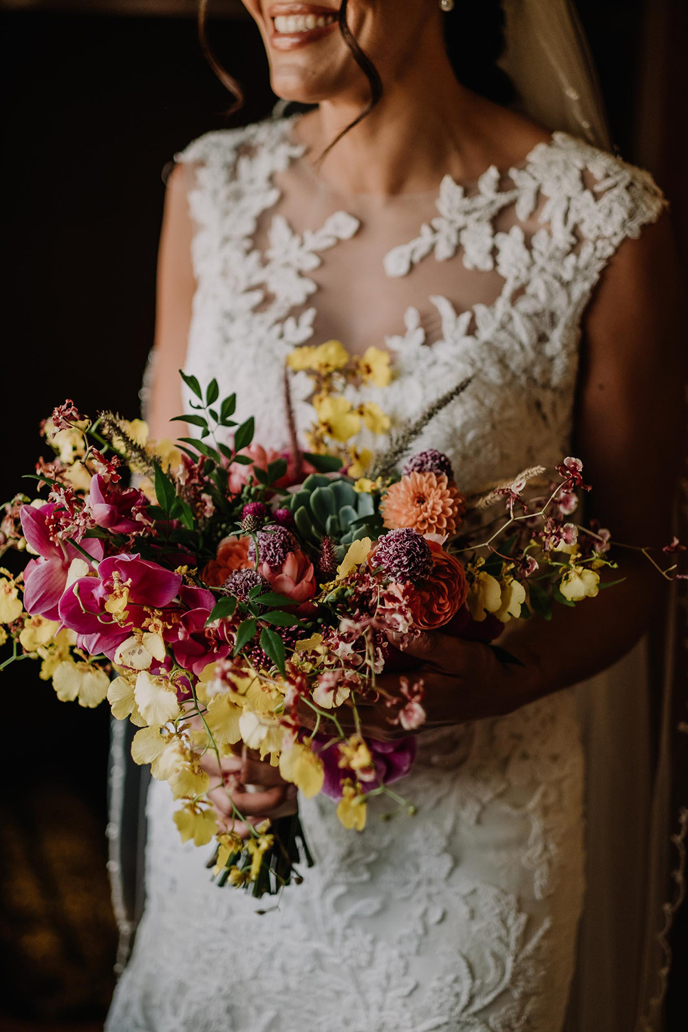 O vestido de noiva da Casamarela e o buquê exuberante com orquídeas combinaram super bem com a Renata, que ficou deslumbrante!
