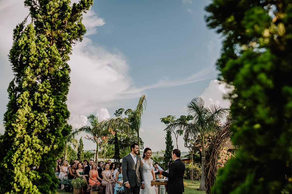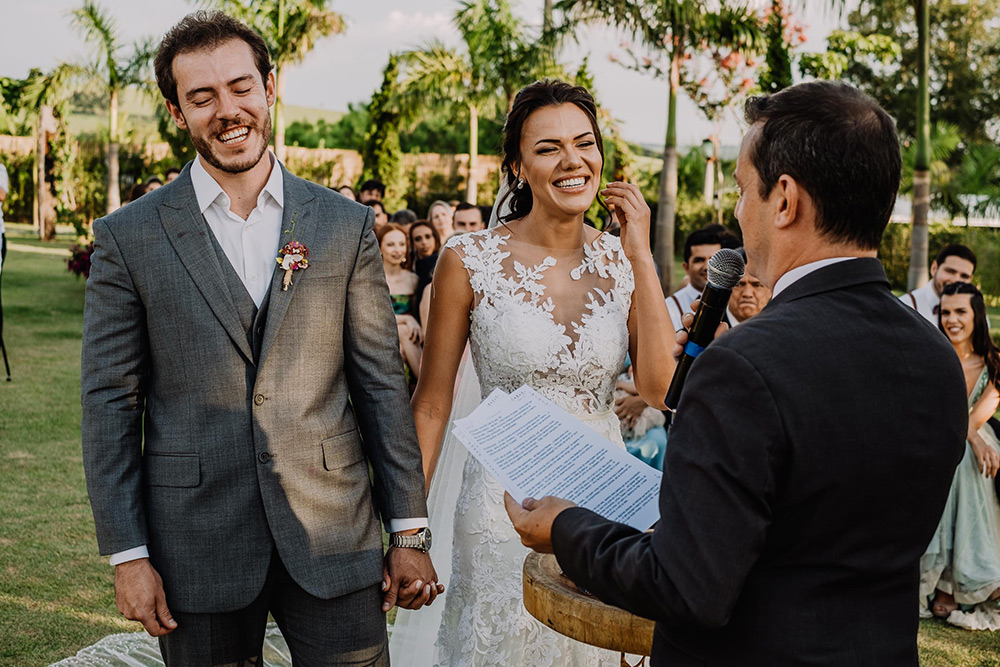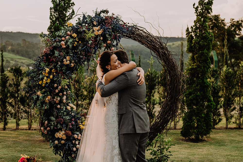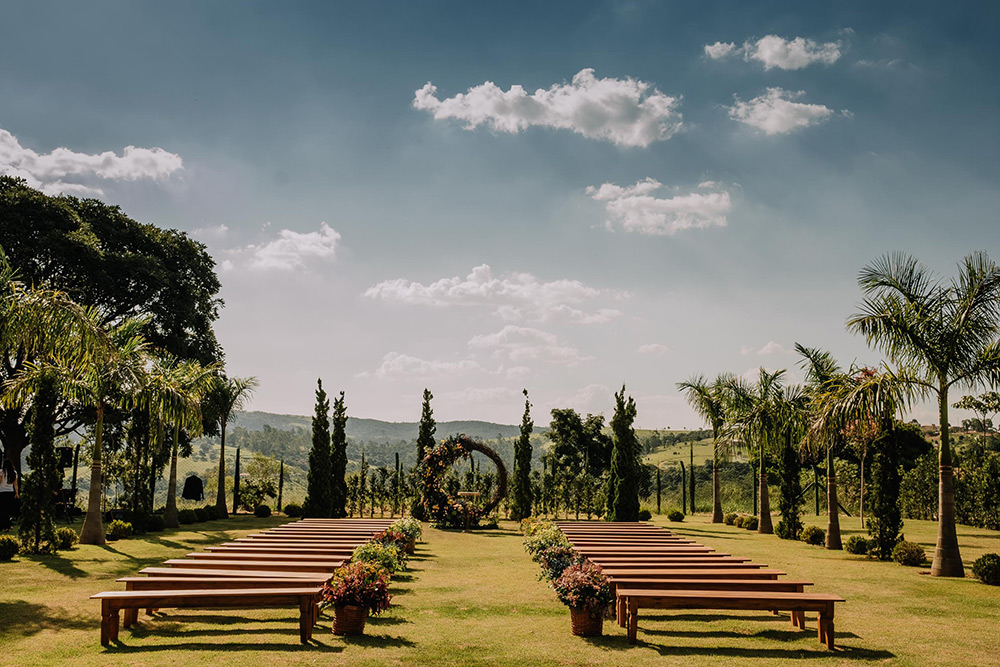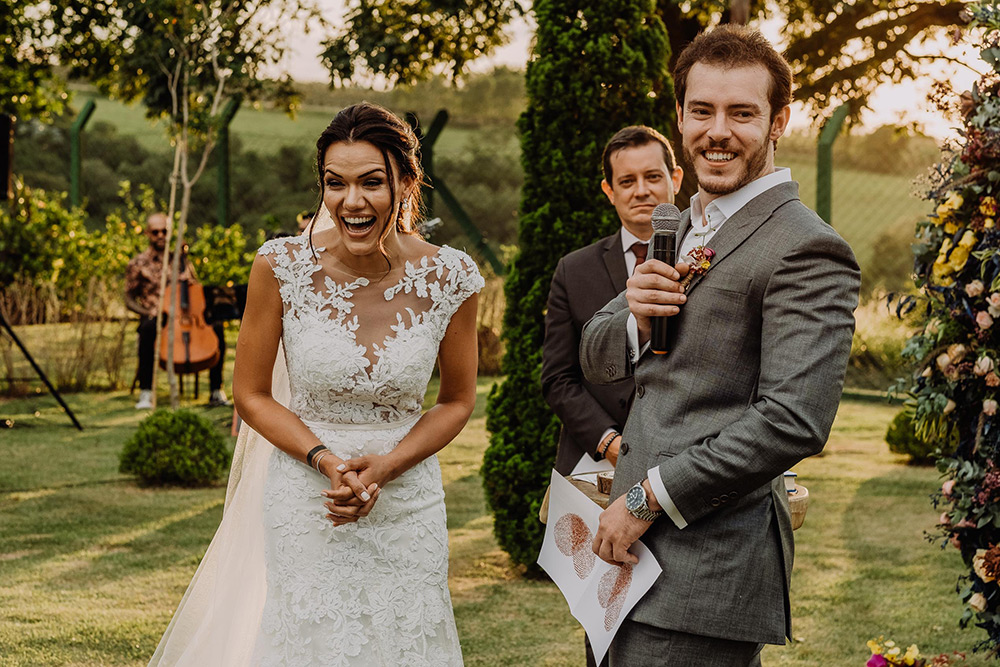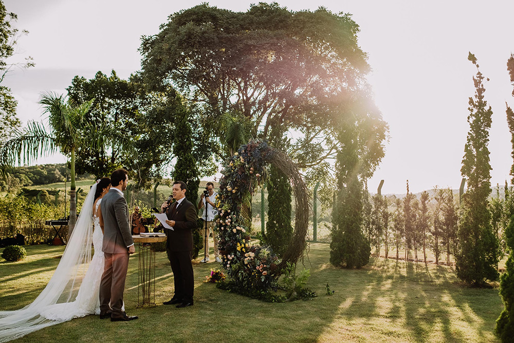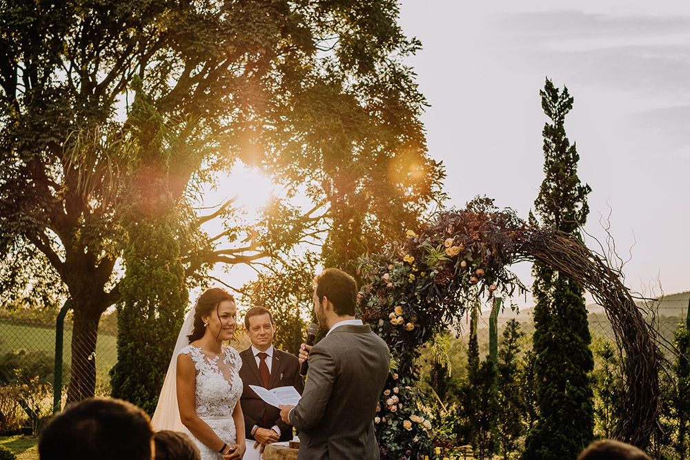 Um casamento no campo com a luz natural como um dos destaques, refletindo a alegria dos noivos e tornando o ambiente ainda mais bonito.