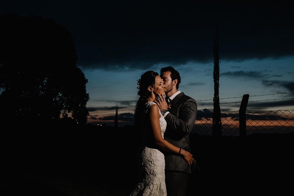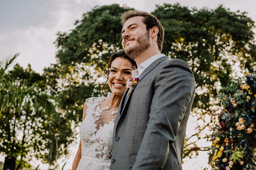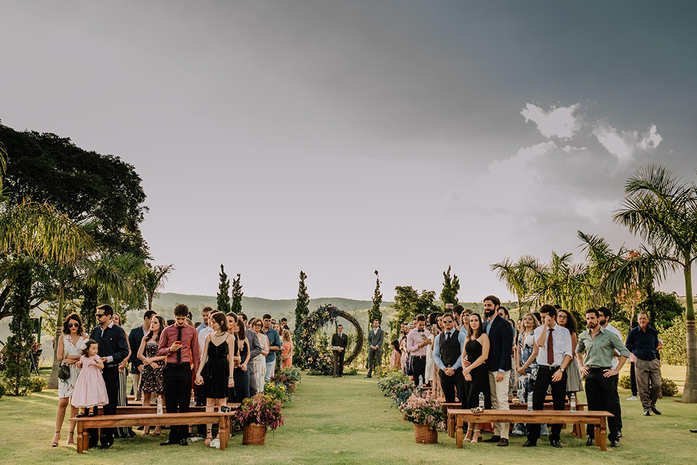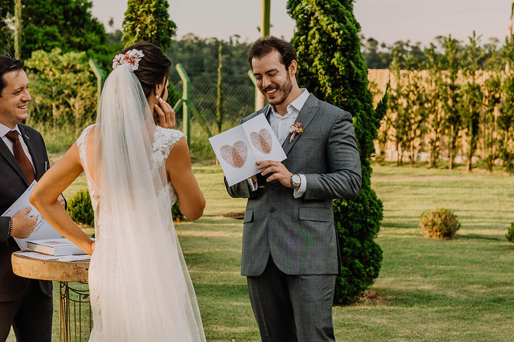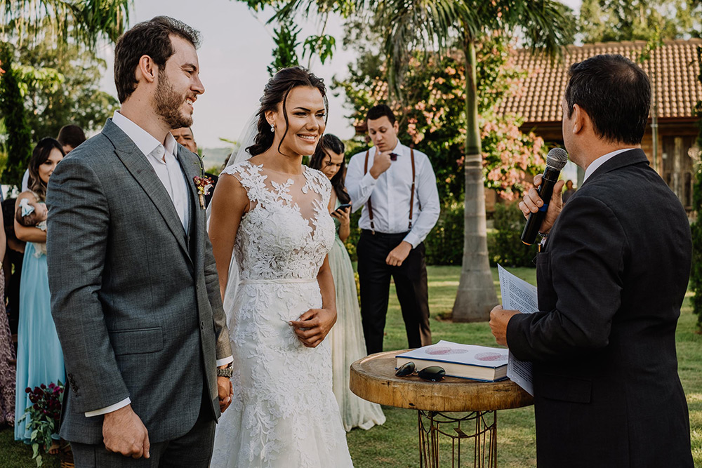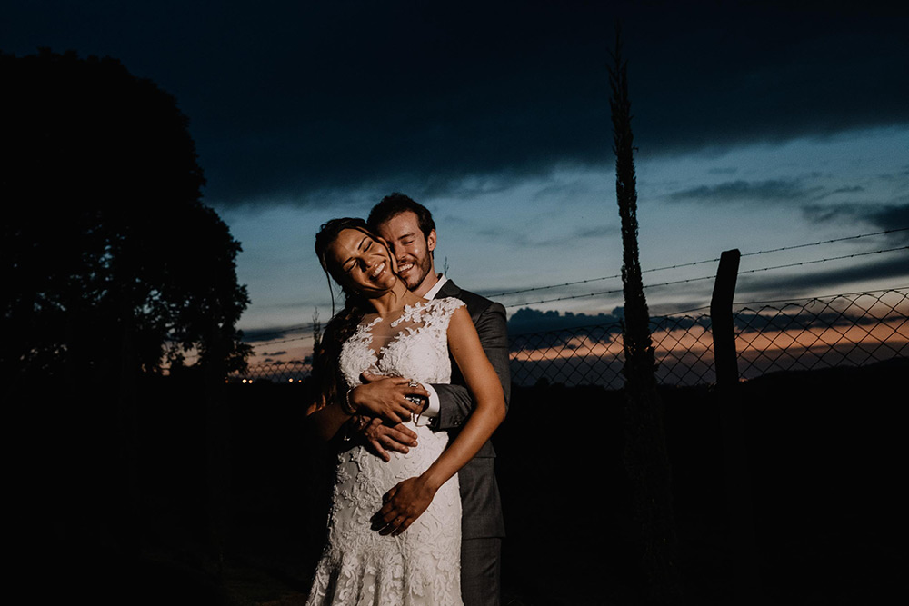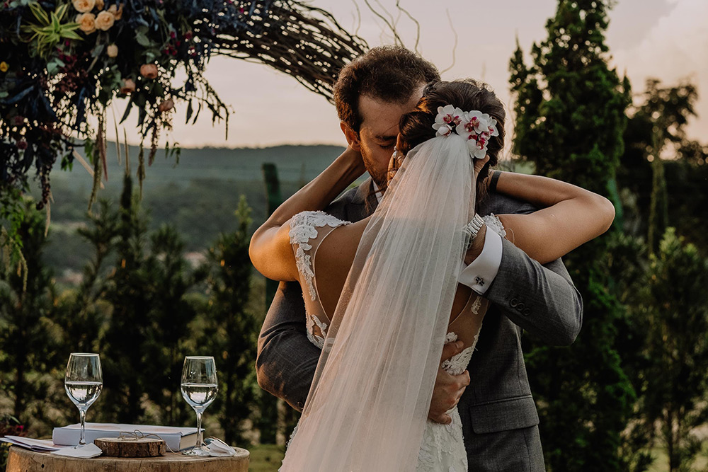 Um casamento no campo com a luz natural como um dos destaques, refletindo a alegria dos noivos e tornando o ambiente ainda mais bonito.