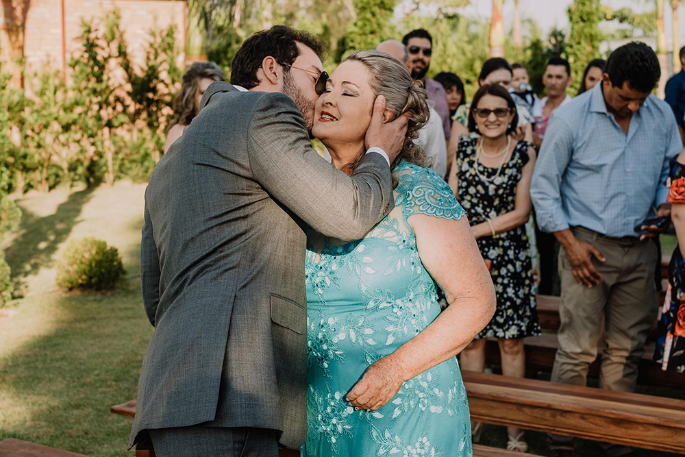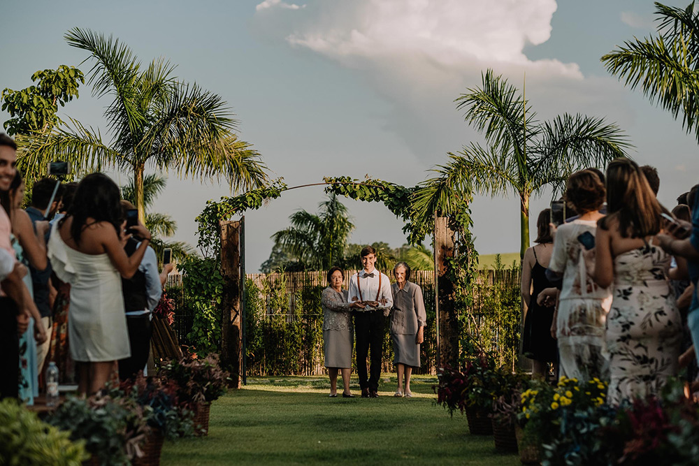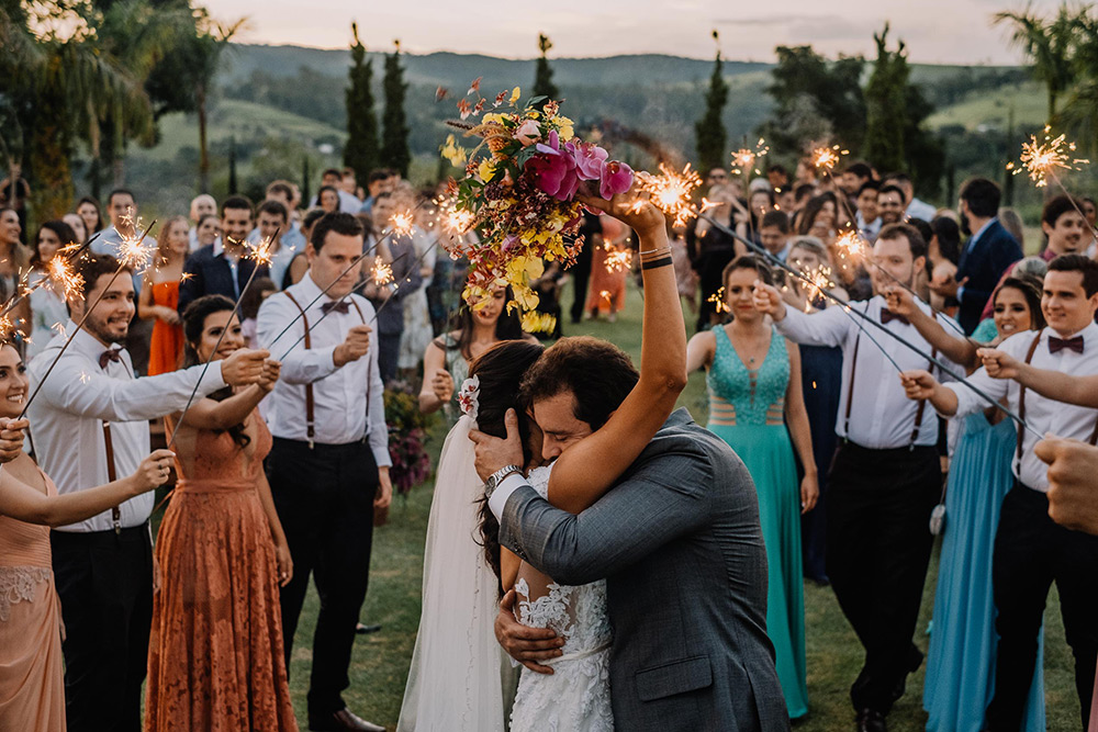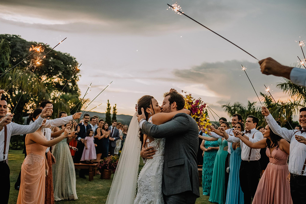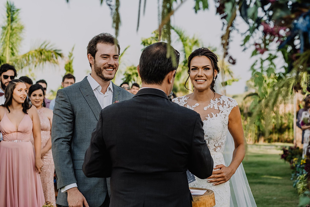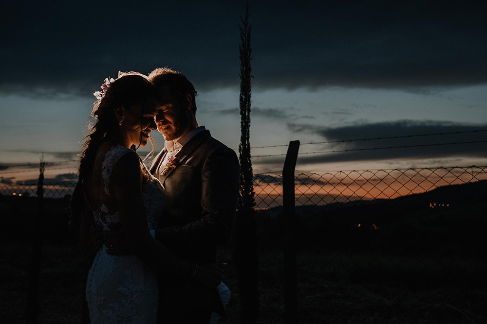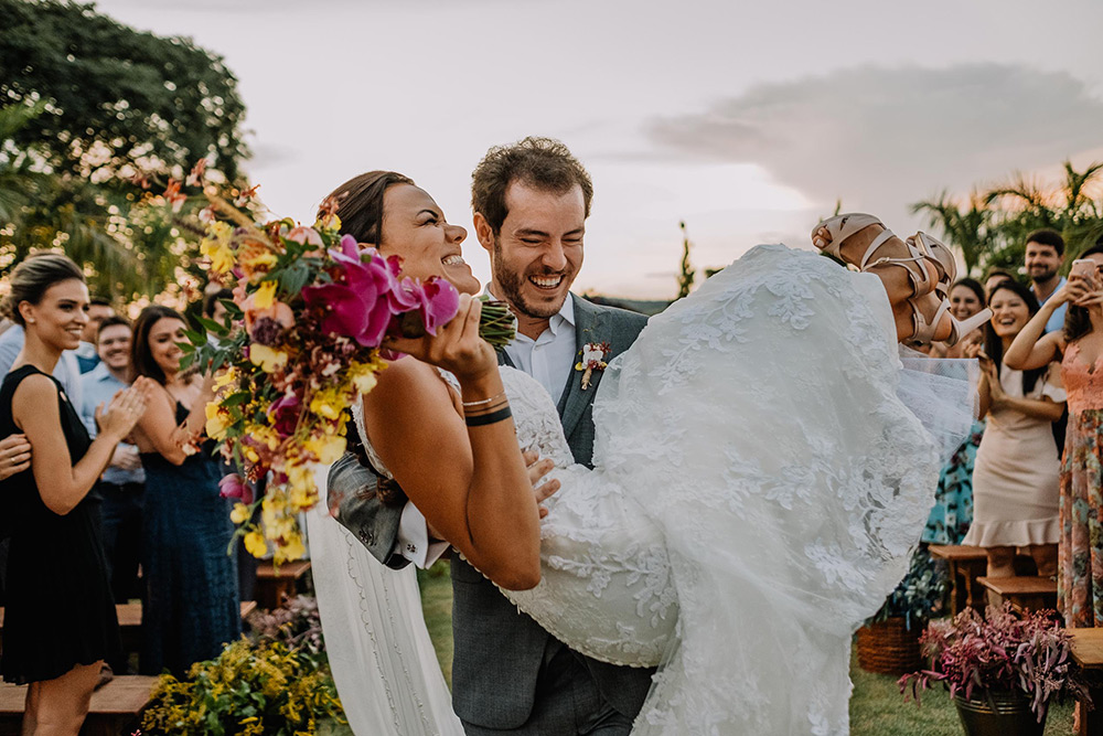 Um casamento no campo com a luz natural como um dos destaques, refletindo a alegria dos noivos e tornando o ambiente ainda mais bonito.