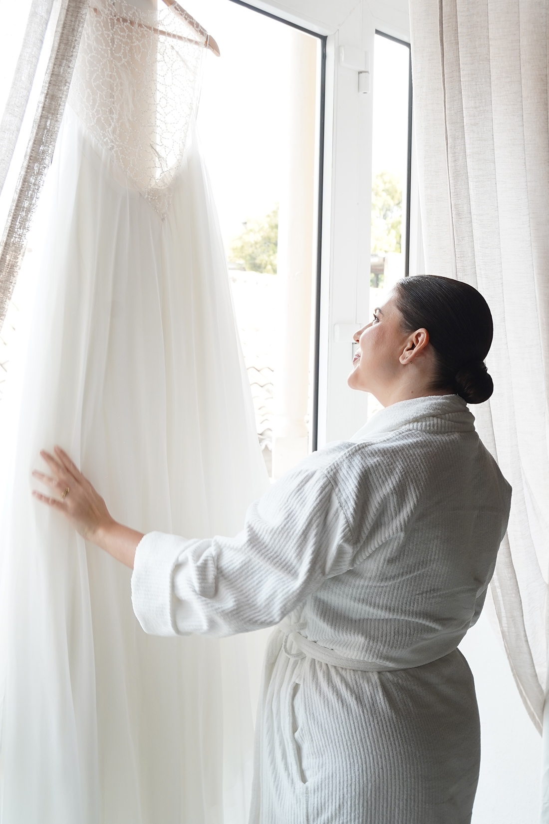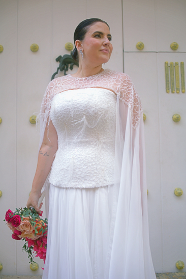 Para um momento tão simbólico, meu vestido precisava traduzir leveza e significado. O modelo foi criado por Lara Bassoli, com tecido da Pétalas Noivas, em uma composição que uniu romantismo e elegância.