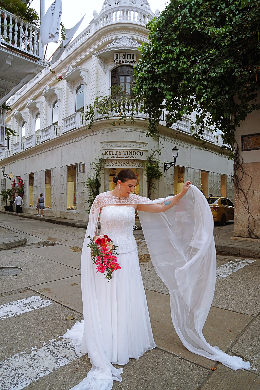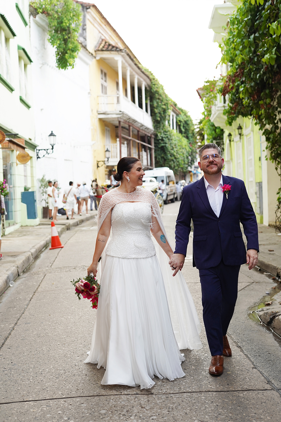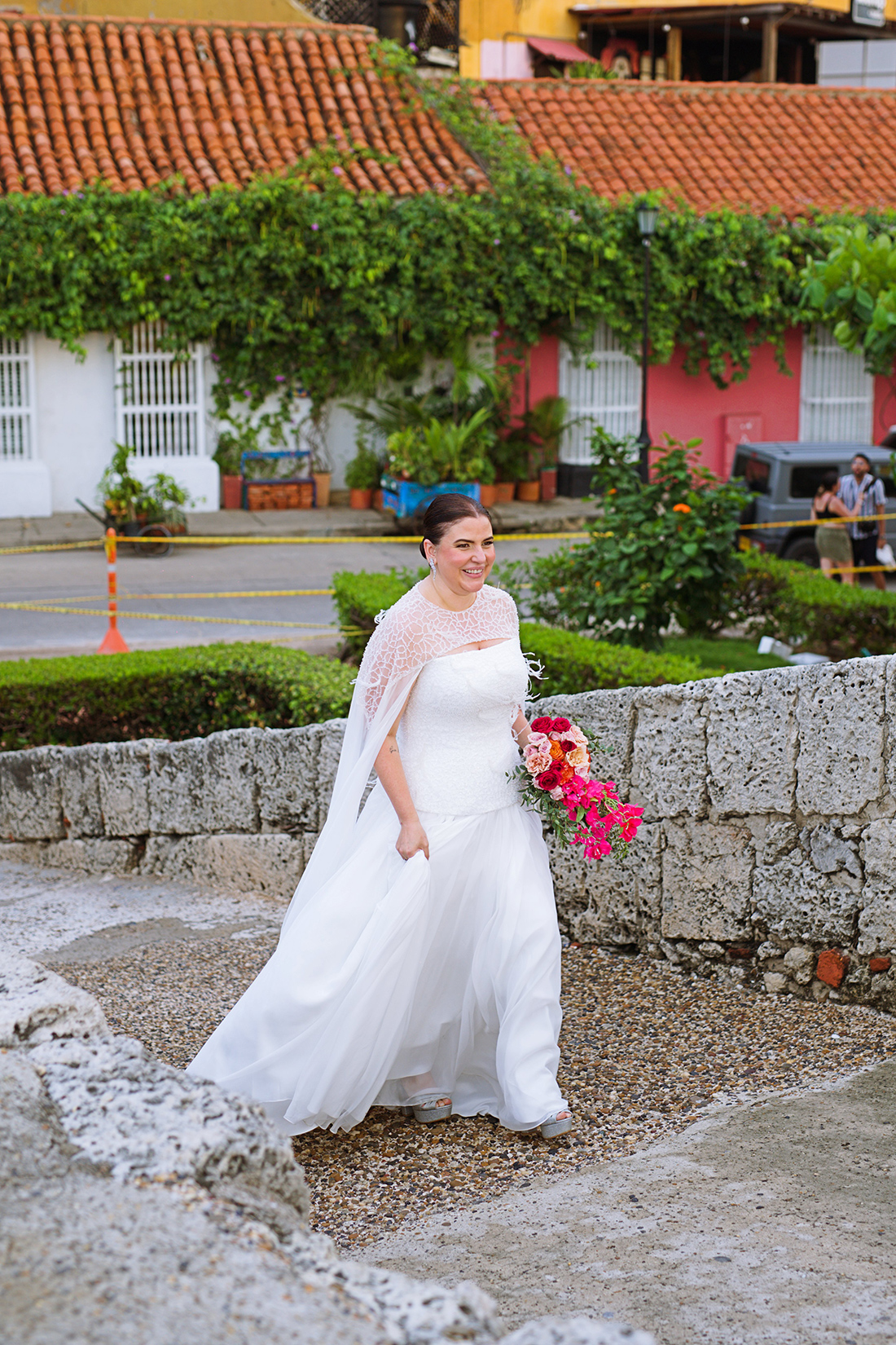 A caminhada pela cidade antiga, entre ruas de pedra, varandas floridas e fachadas coloridas que parecem contar histórias a cada esquina, foi um sonho! Aliás, caminhar vestida de noiva por esse cenário vivo, repleto de passado e significado, já era por si só um ritual de conexão com o amor e com o tempo.