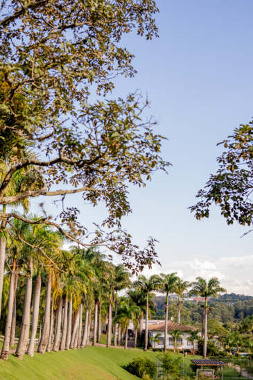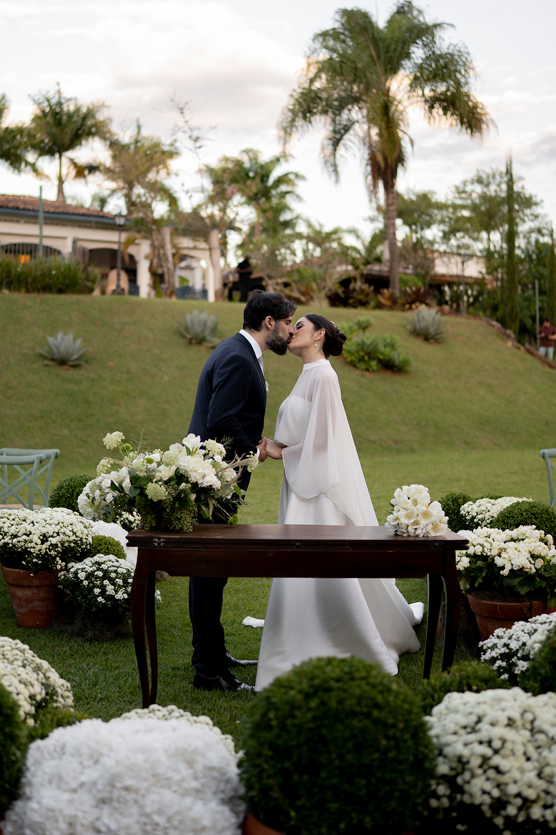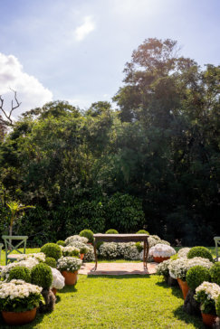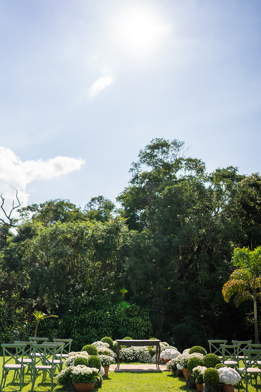 O altar, delicadamente montado em meio ao jardim, trouxe uma composição que foge do óbvio. Nesse sentido, a grande estrela é a própria fazenda.