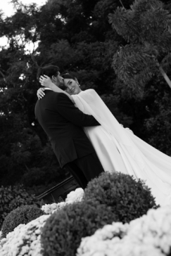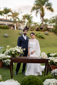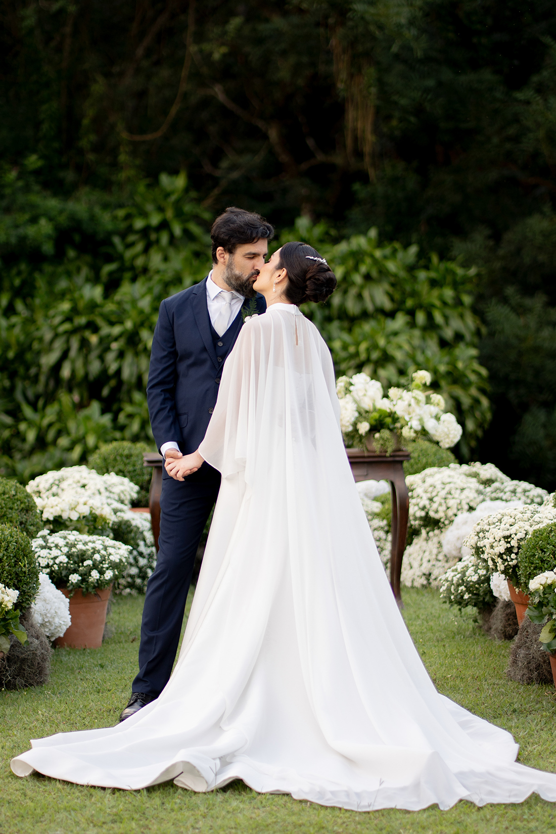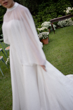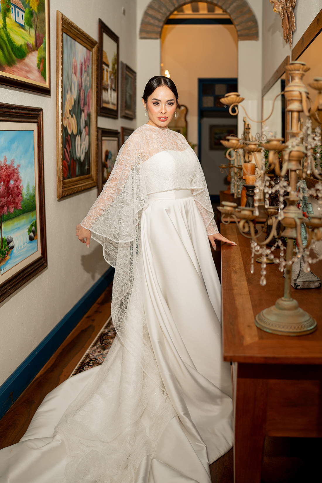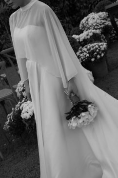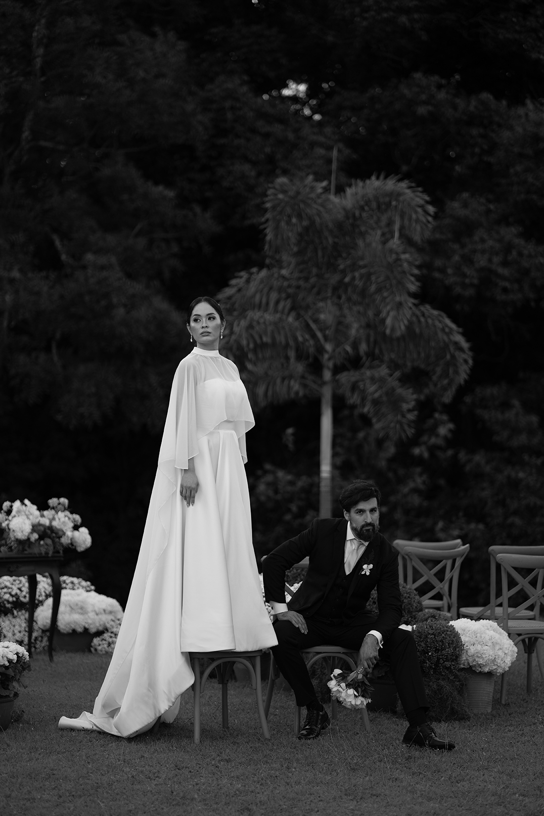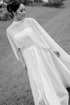 Com linhas minimalistas, caimento impecável e uma capa fluida que traz movimento, ele traduz perfeitamente o conceito de noiva contemporânea. É sofisticado sem ser rígido, moderno sem perder o romantismo.