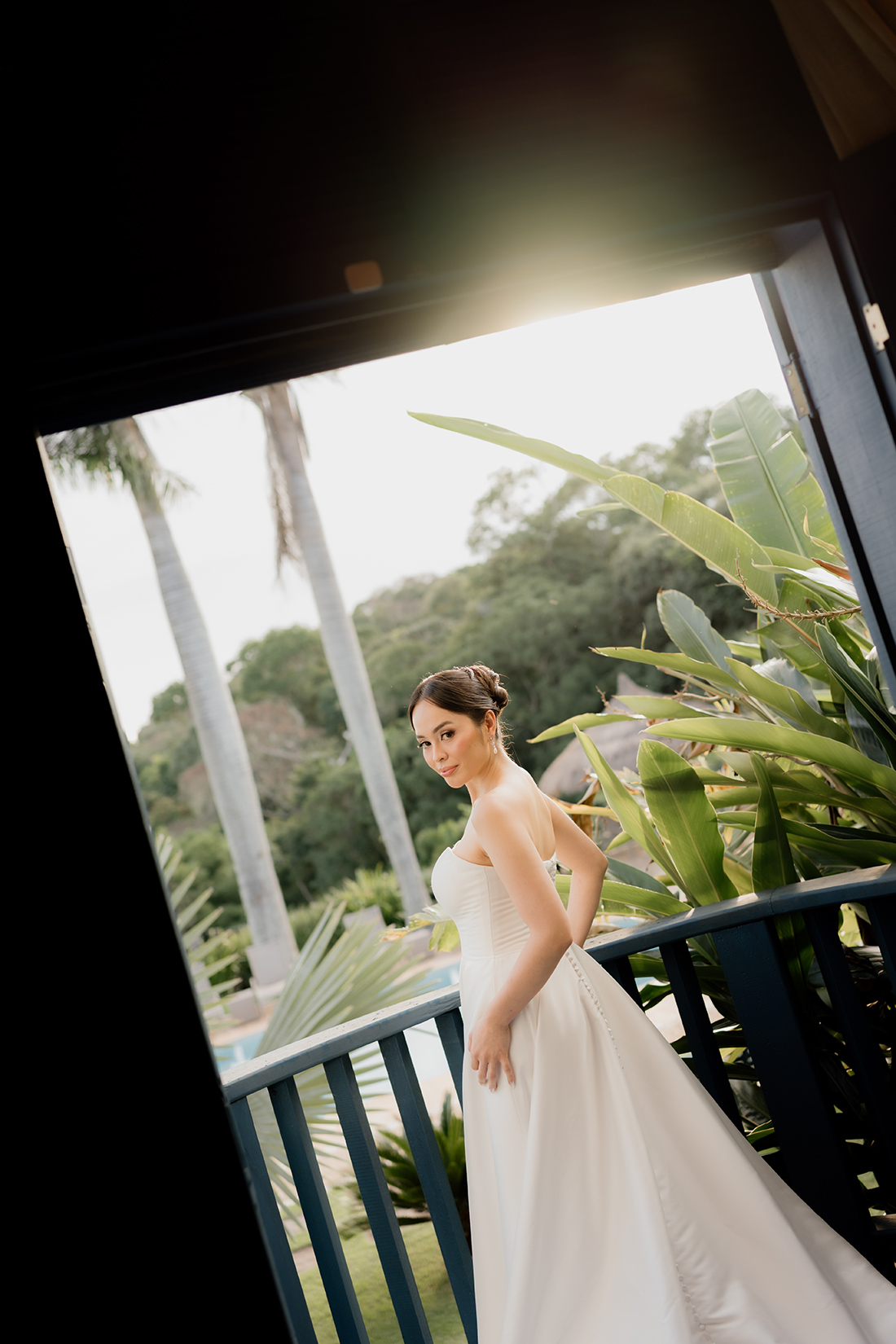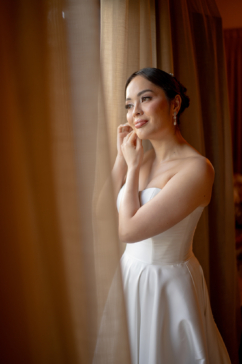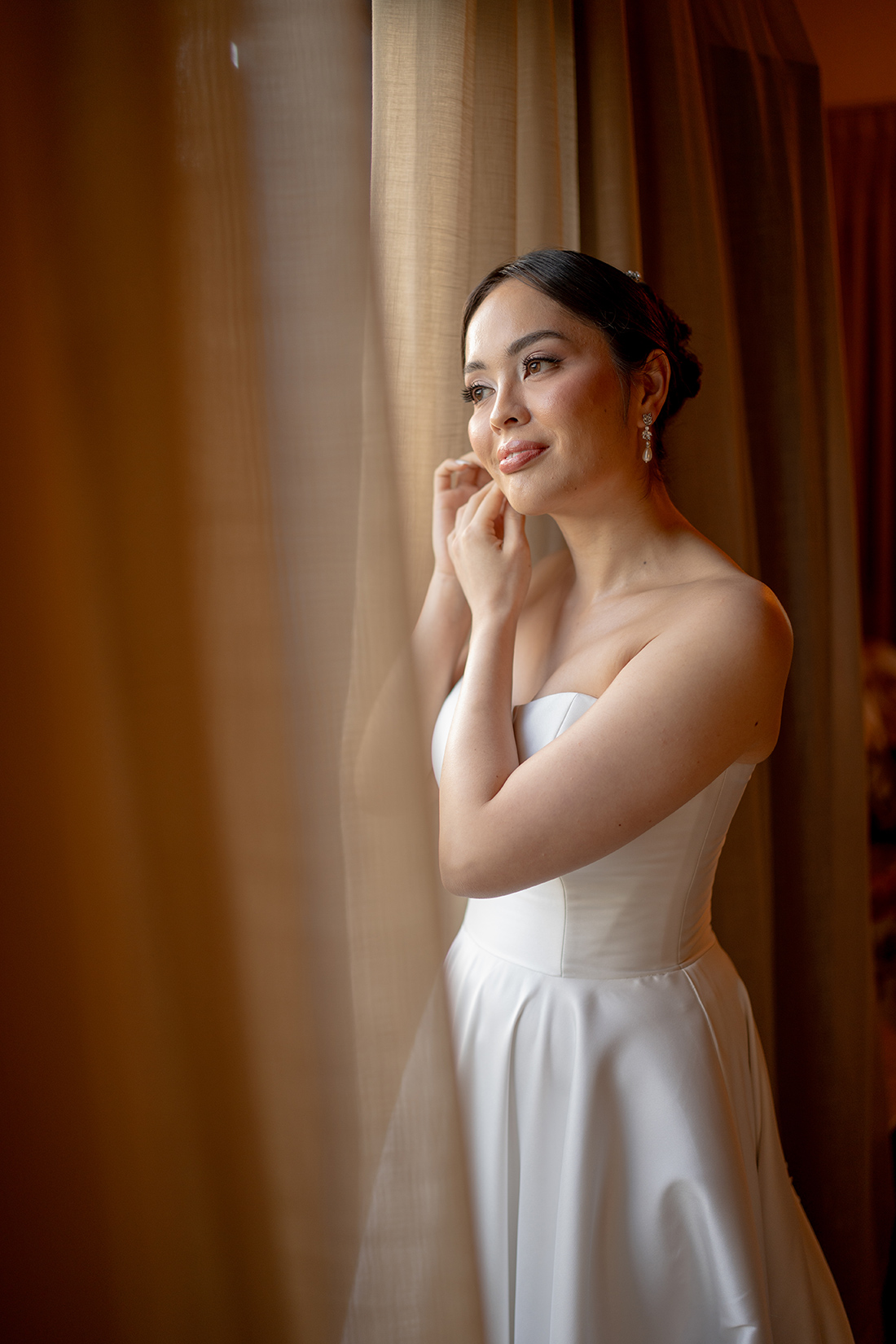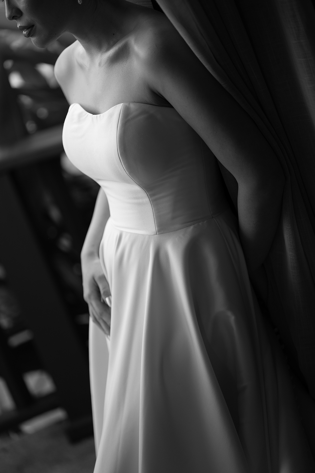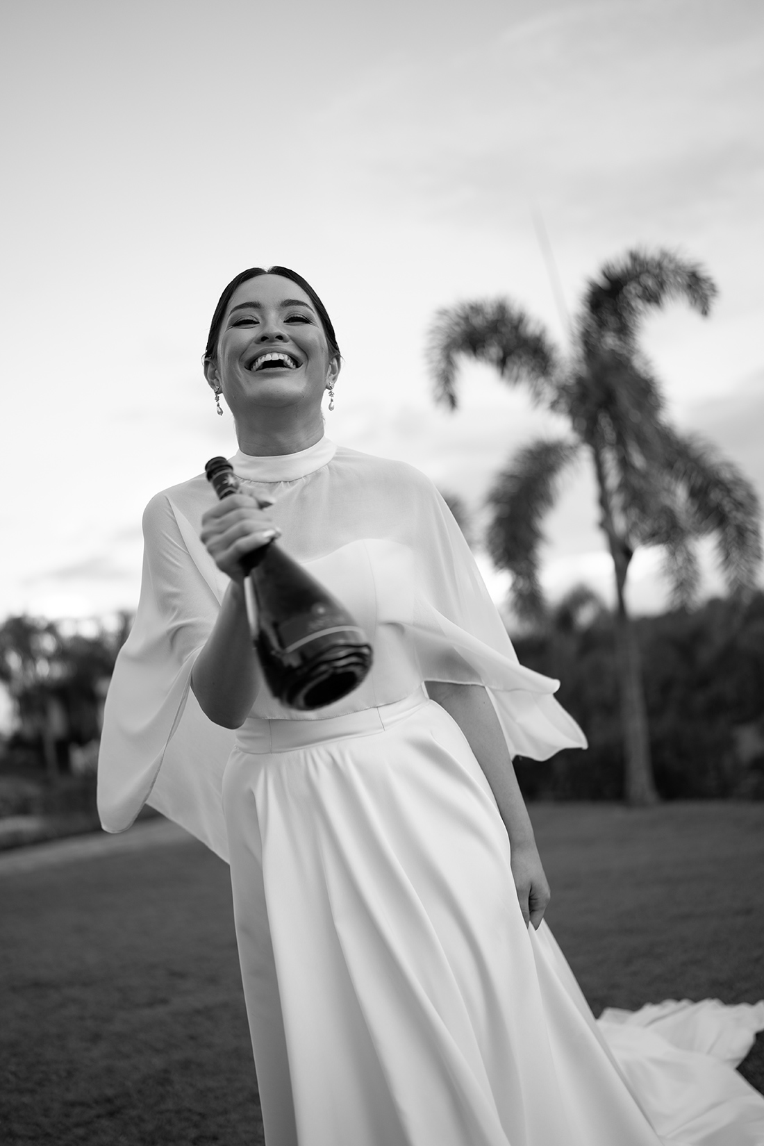Com linhas minimalistas, caimento impecável e uma capa fluida que traz movimento, ele traduz perfeitamente o conceito de noiva contemporânea. É sofisticado sem ser rígido, moderno sem perder o romantismo.