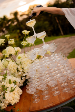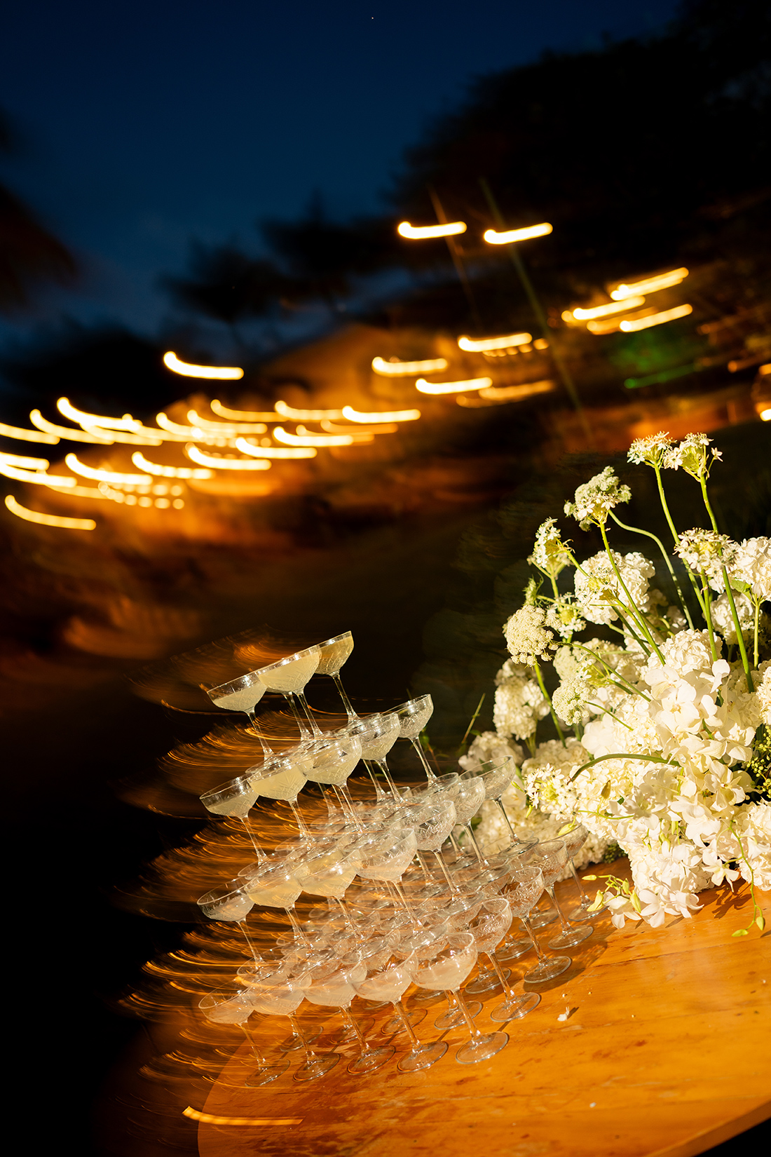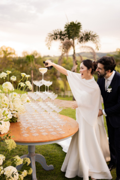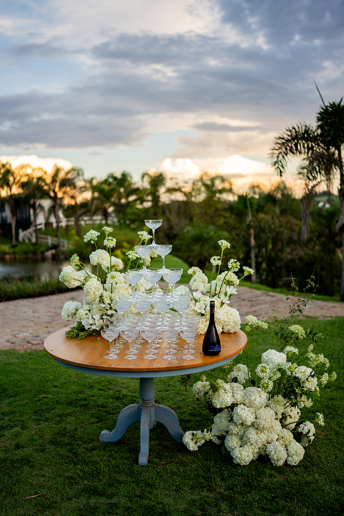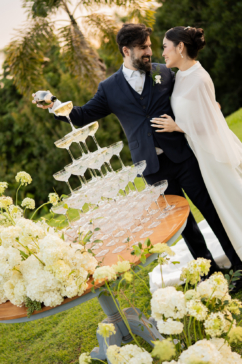 Um dos pontos altos foi a mesa com a torre de espumante. Além de ser uma tendência forte, ela foi incorporada de forma elegante à decoração, sem parecer um elemento isolado. Pelo contrário, virou protagonista de um dos momentos mais charmosos do editorial.