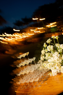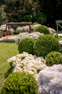 A escolha por flores brancas, incluindo hortênsias e outras espécies delicadas, reforçou a estética atemporal, enquanto os arranjos baixos e distribuídos em vasos criaram um visual mais orgânico e atual.