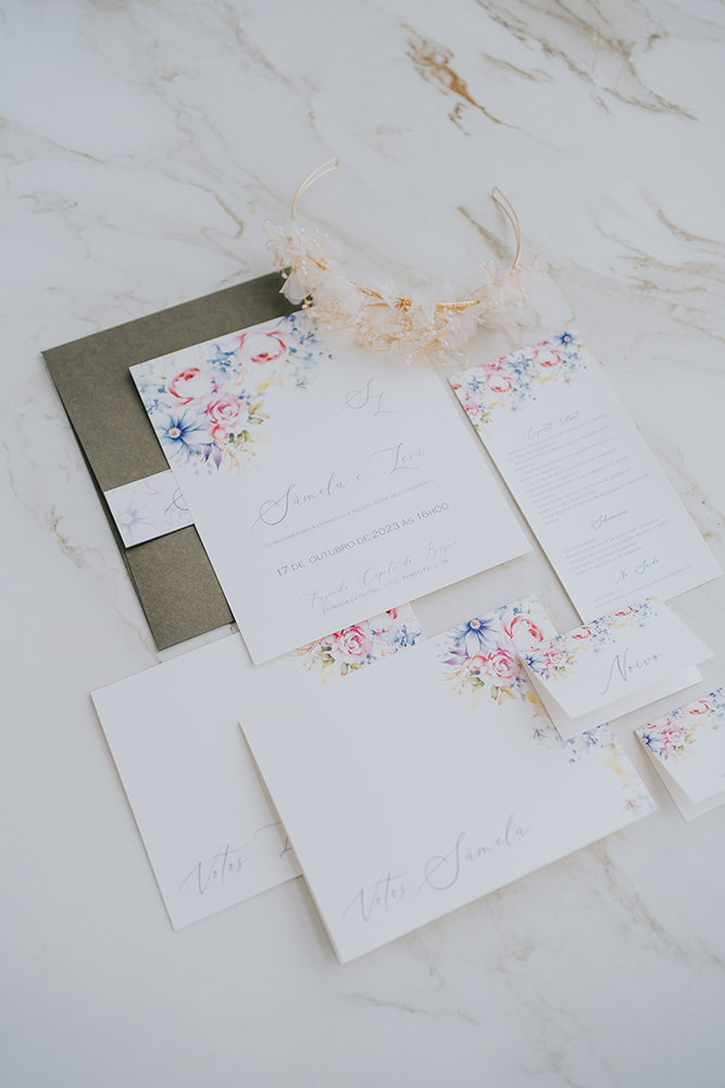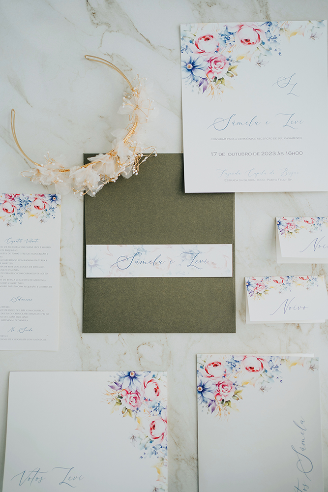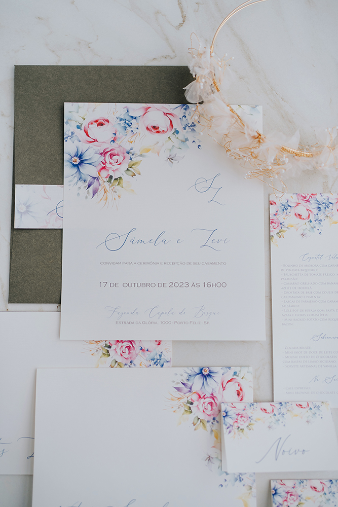 Contamos ainda com a papelaria da Papel e Estilo, que brilhou com convite, menu e marcadores de lugar.