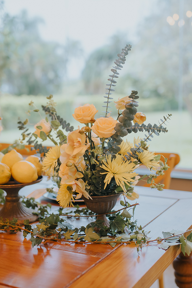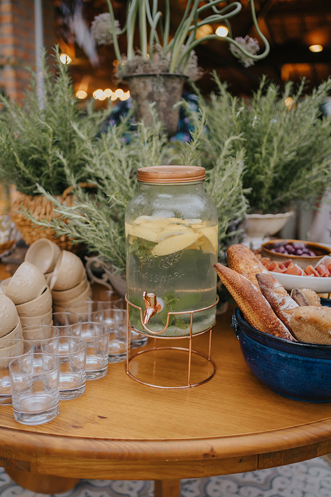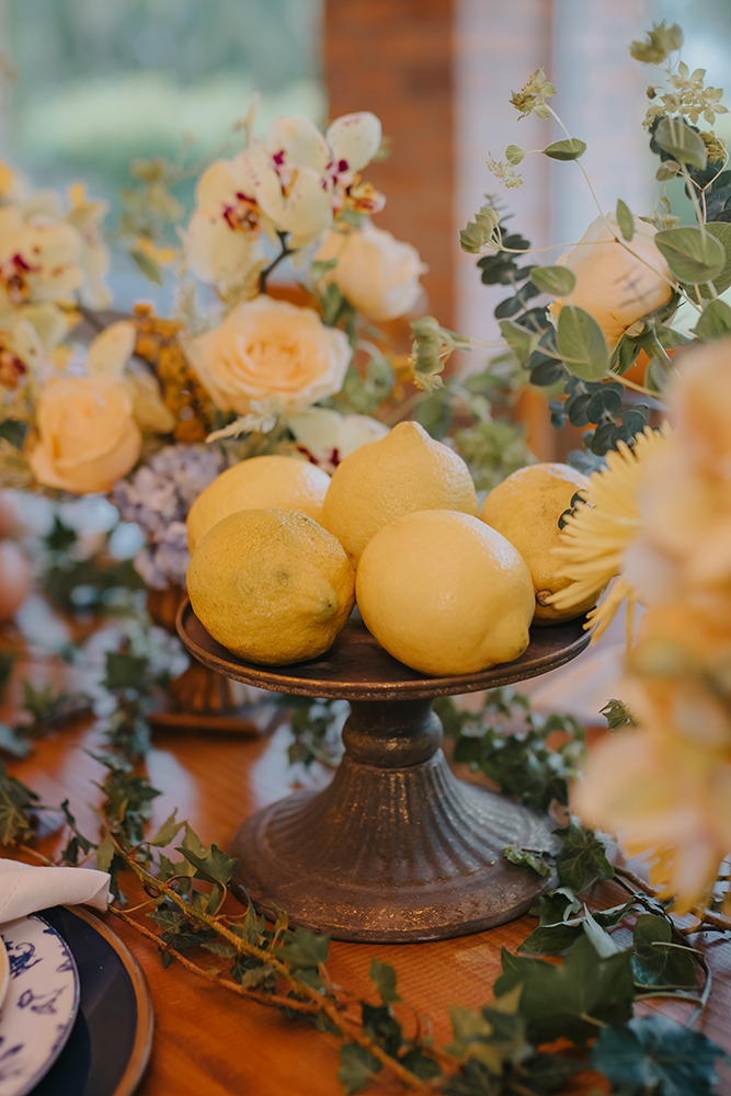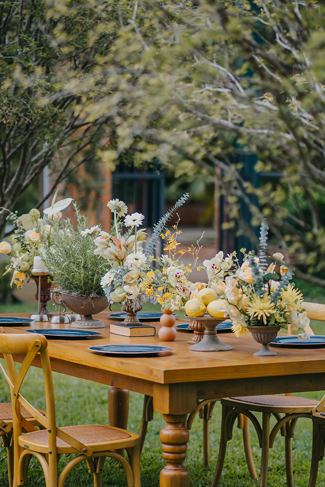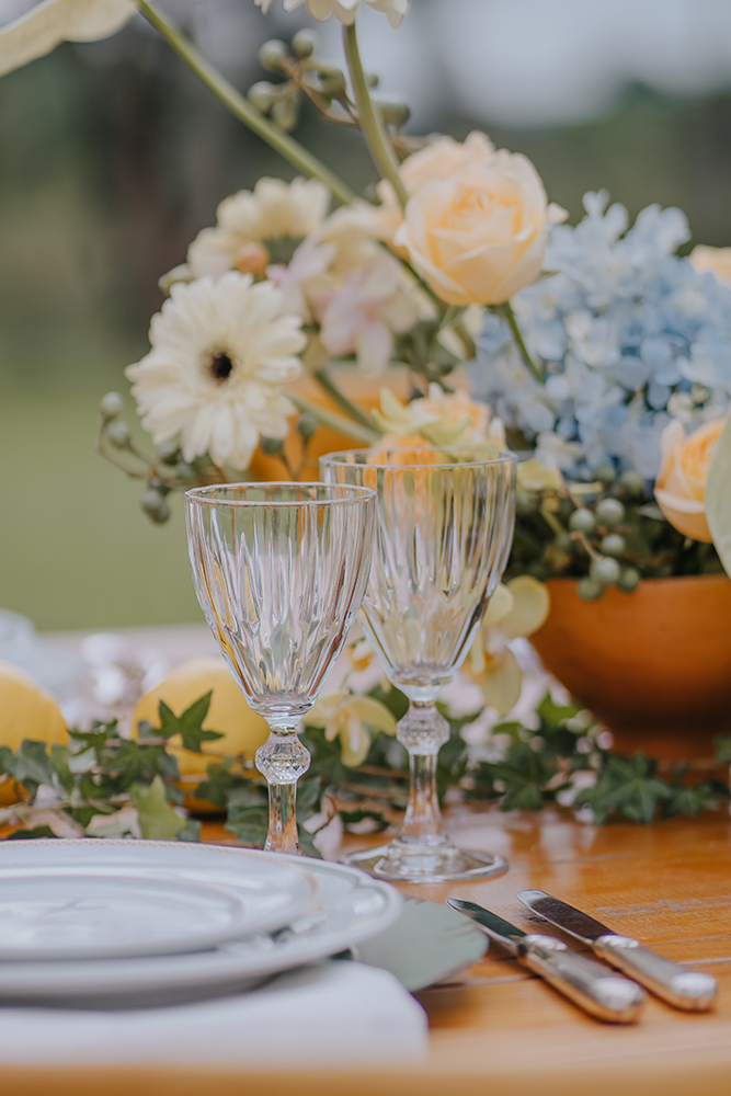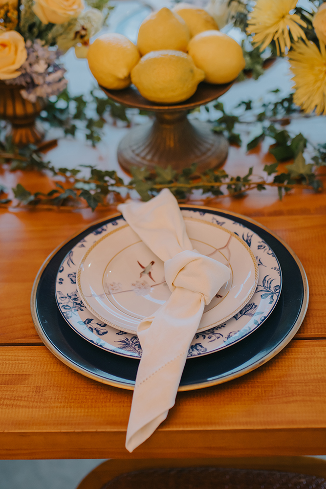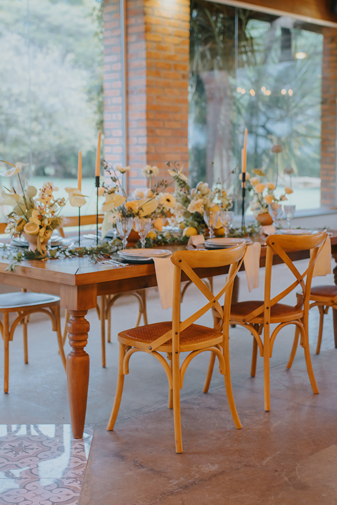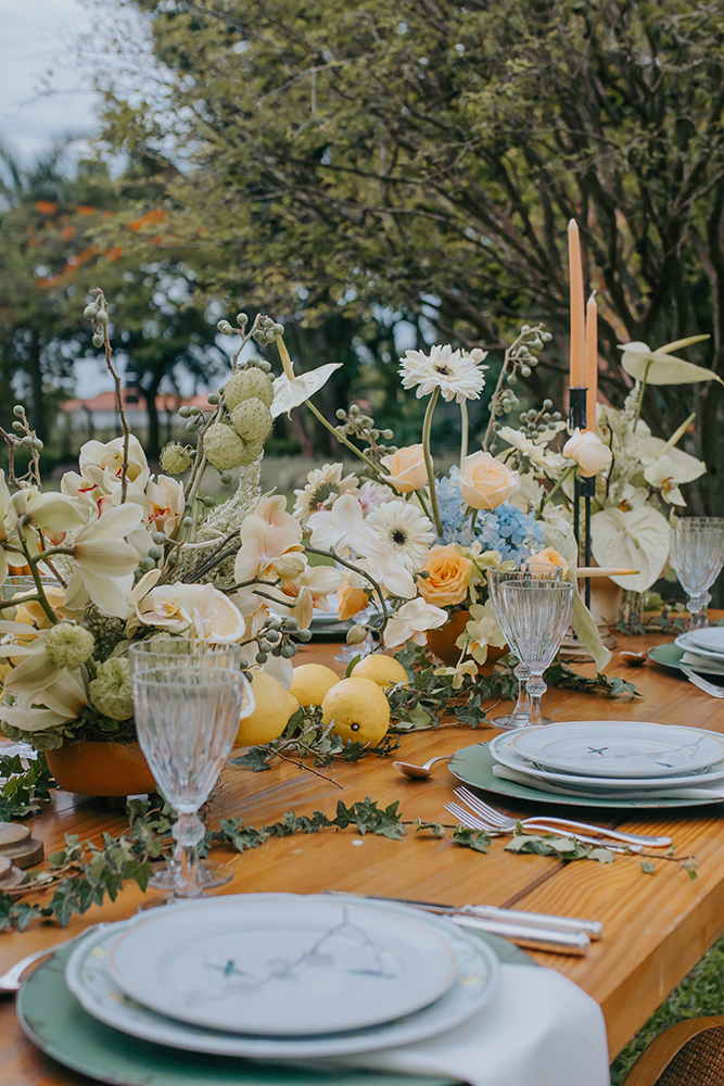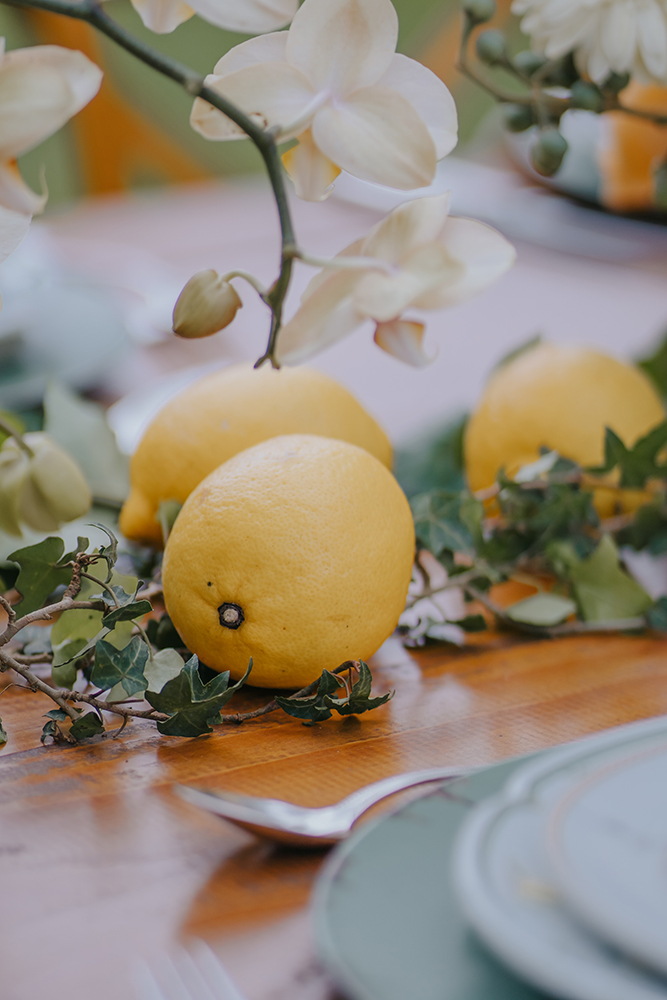 O briefing inicial indicava uma leve pincelada do clima italiano. Dessa forma, a mesa posta incorporou o limão siciliano numa proposta nada óbvia, com muito bom gosto e aquele tchan que a gente não cansa de olhar.