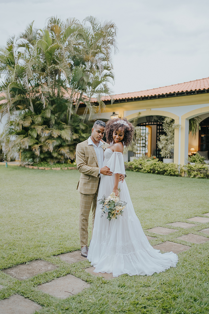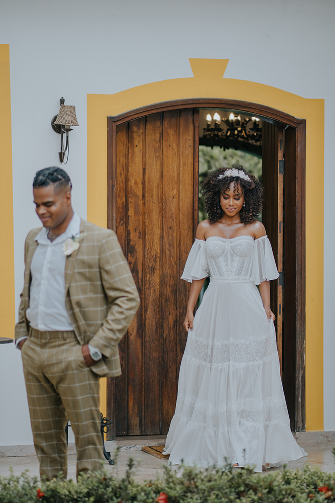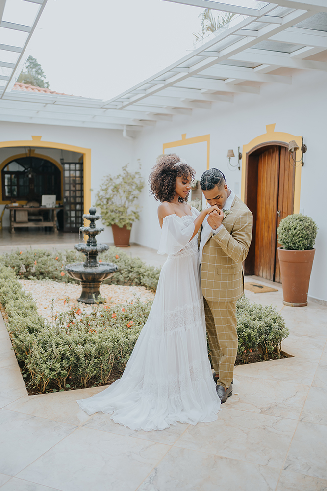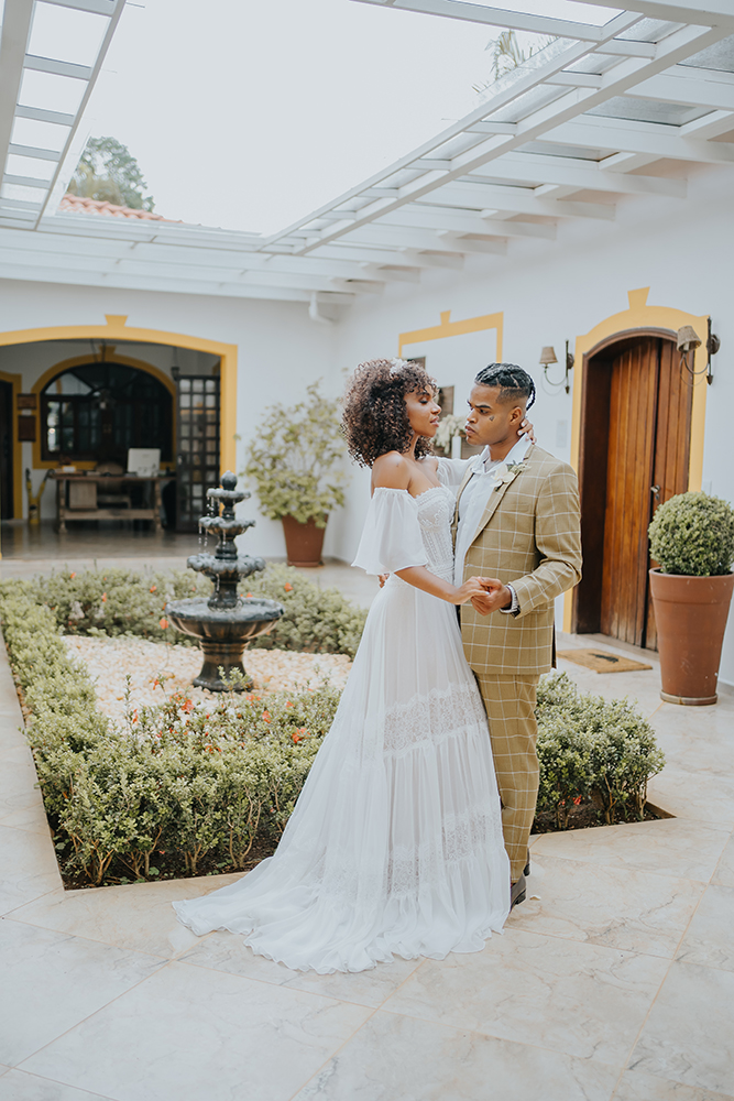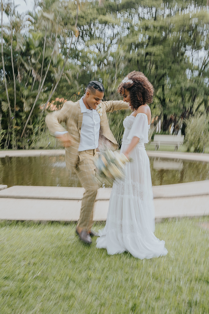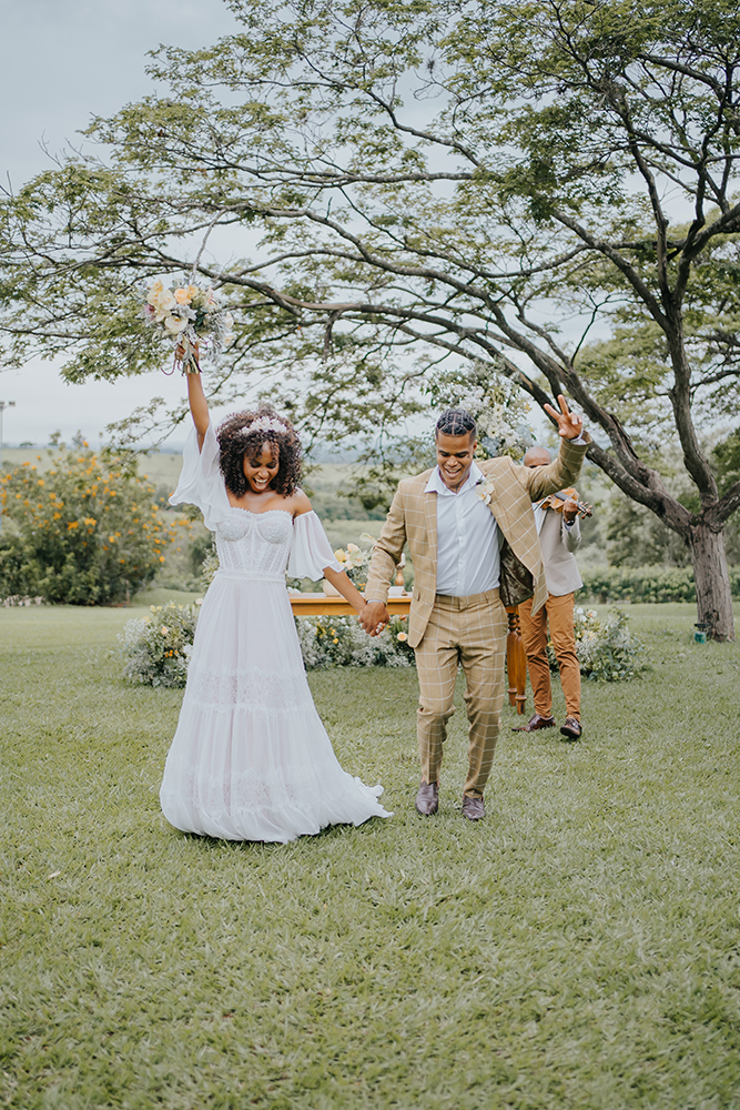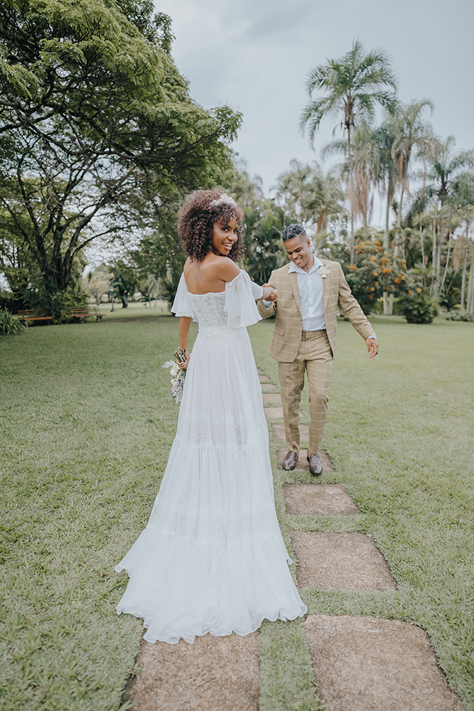 O vestido rendado veio diretamente da nova colação da My Vintage Dress. Enquanto isso, o traje masculino é da P8, provando que os noivos também podem ousar sem sair da vibe elegante.