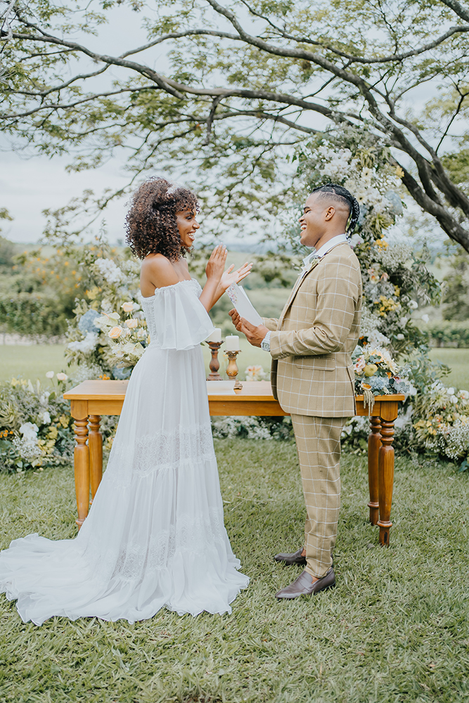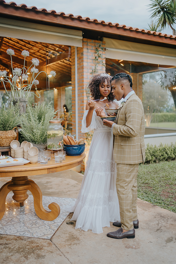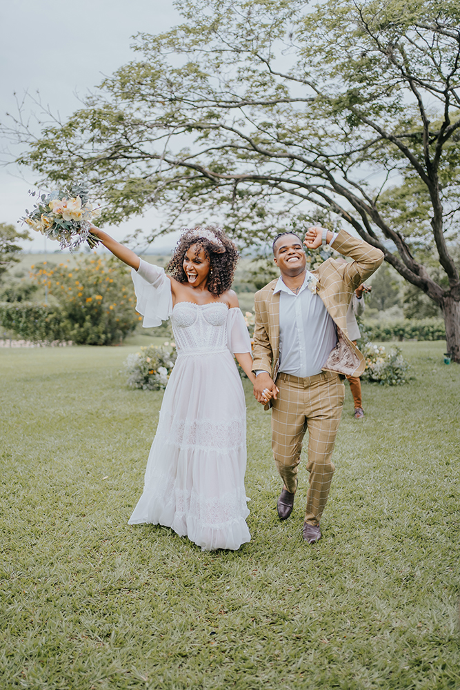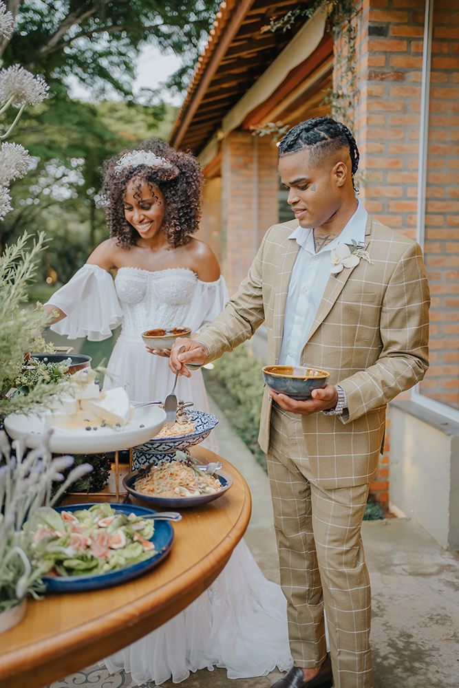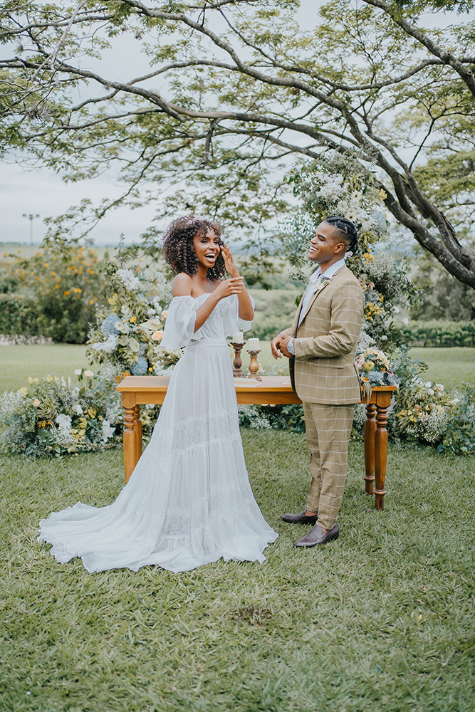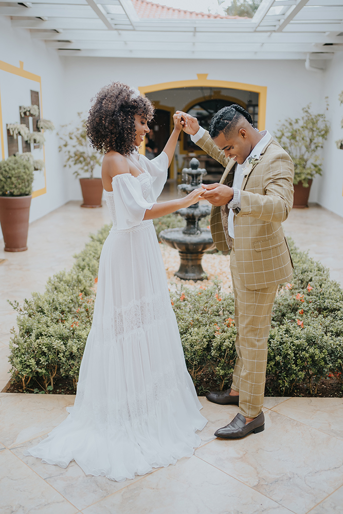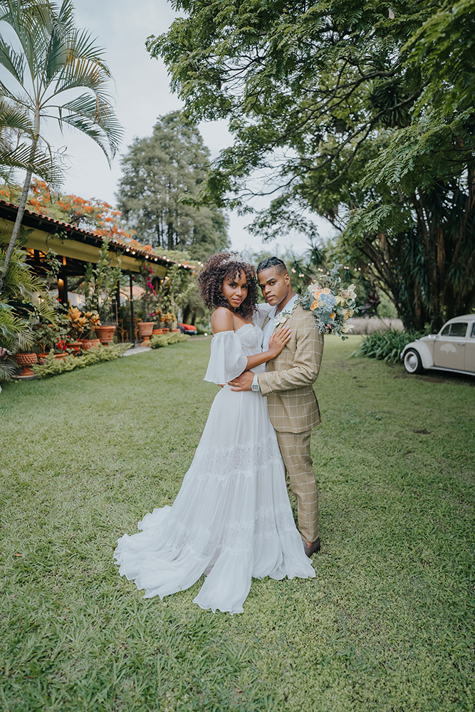 O vestido rendado veio diretamente da nova colação da My Vintage Dress. Enquanto isso, o traje masculino é da P8, provando que os noivos também podem ousar sem sair da vibe elegante.
