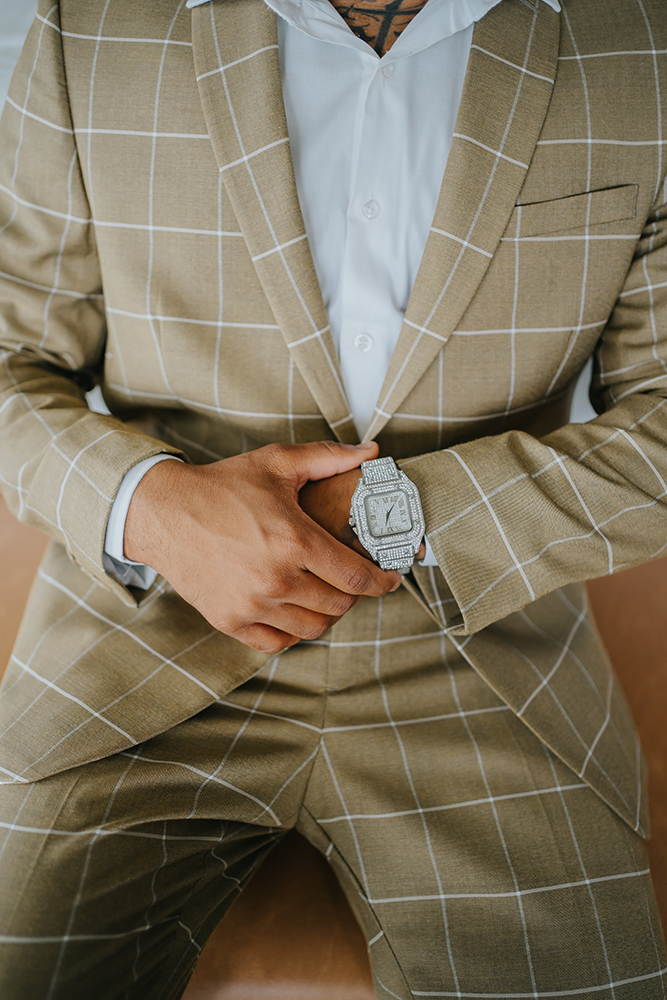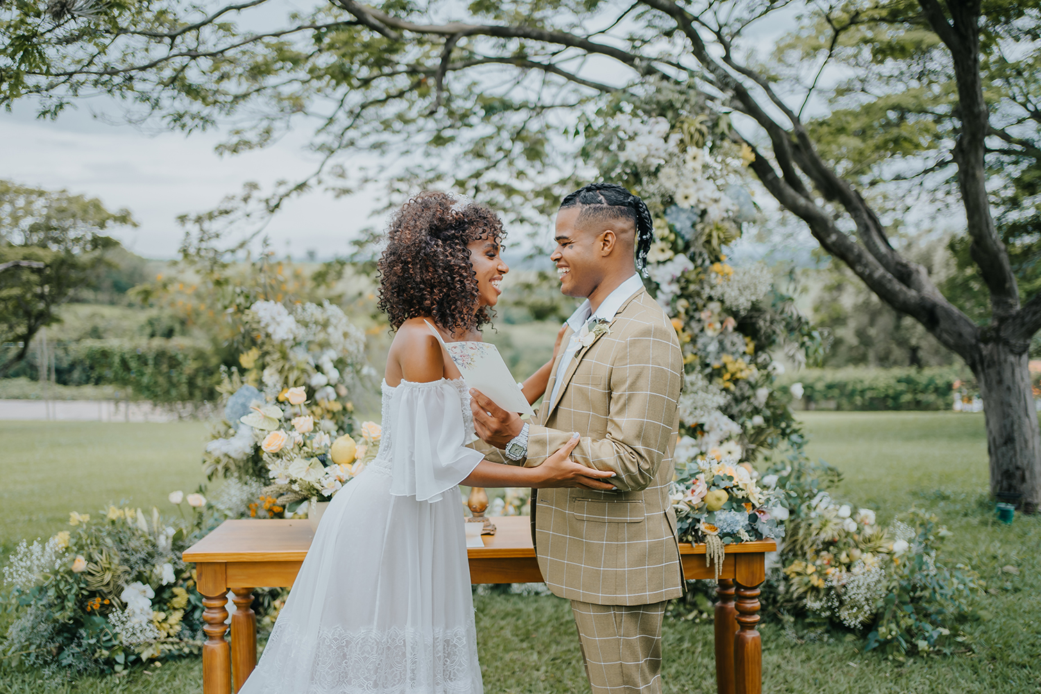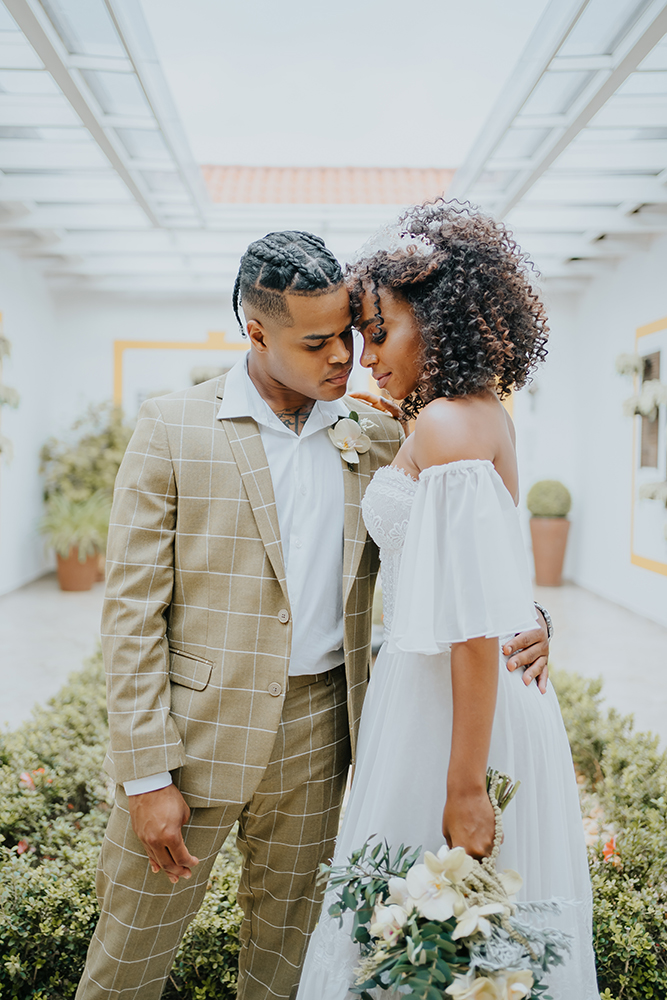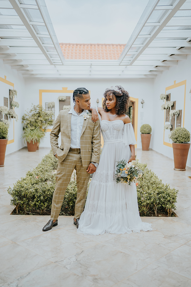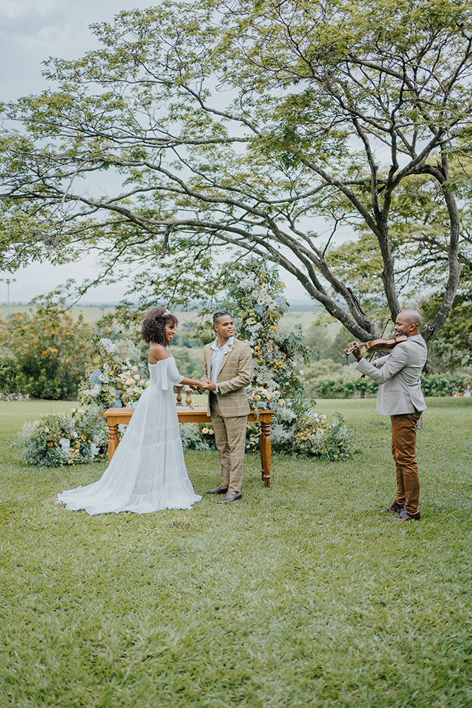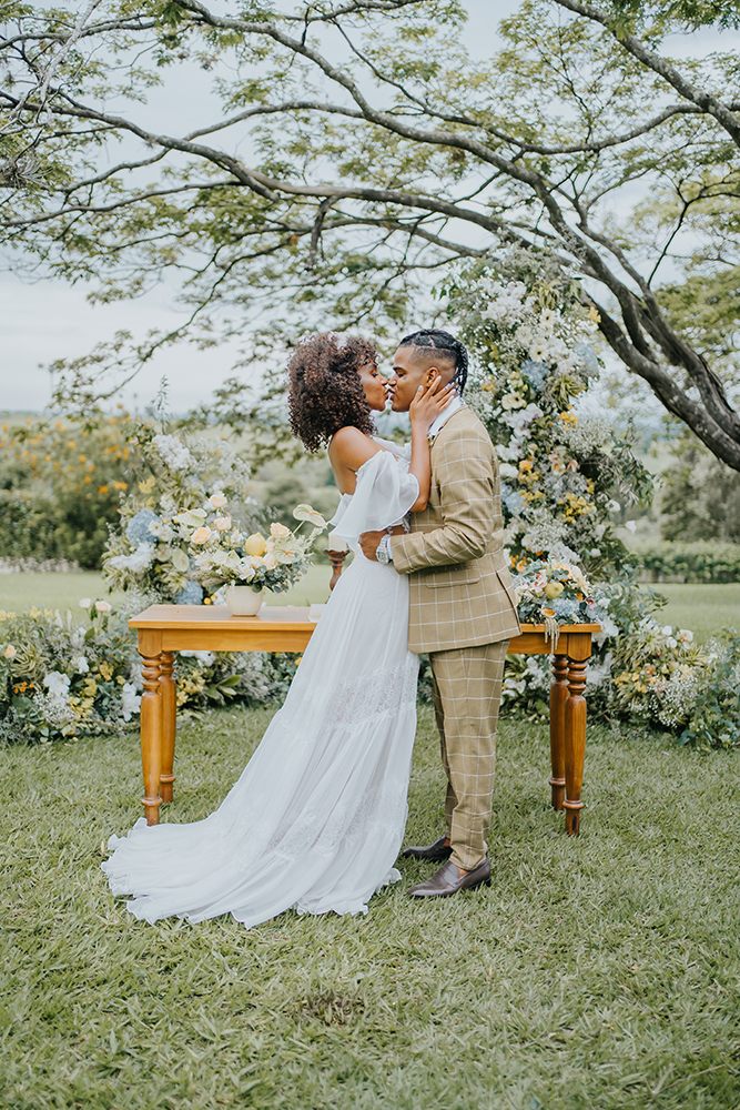 O vestido rendado veio diretamente da nova colação da My Vintage Dress. Enquanto isso, o traje masculino é da P8, provando que os noivos também podem ousar sem sair da vibe elegante.