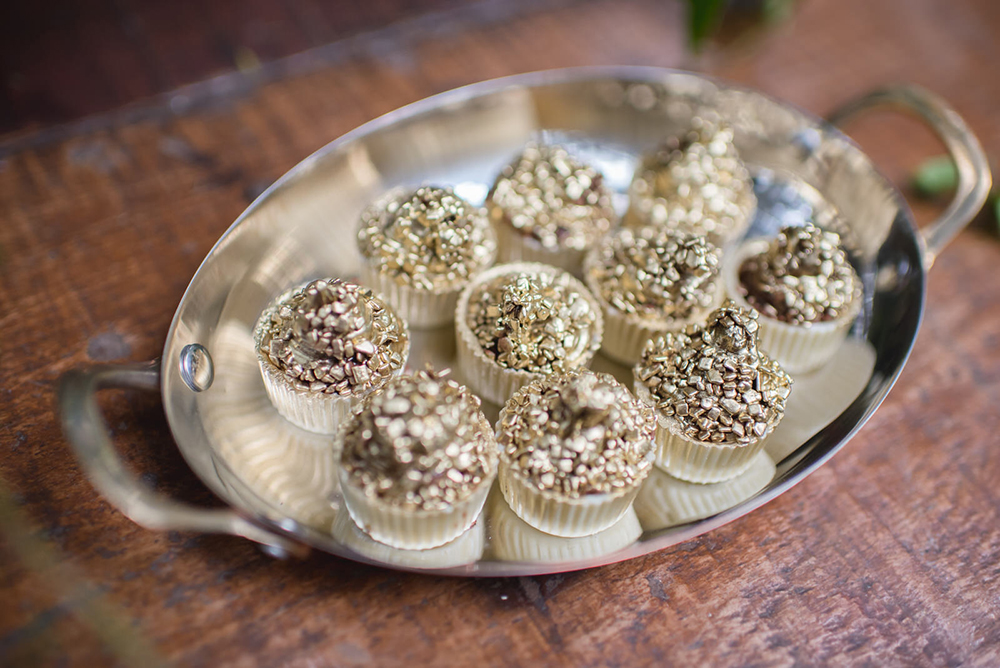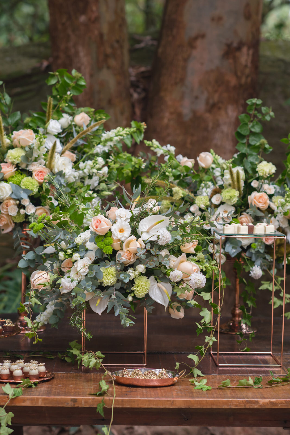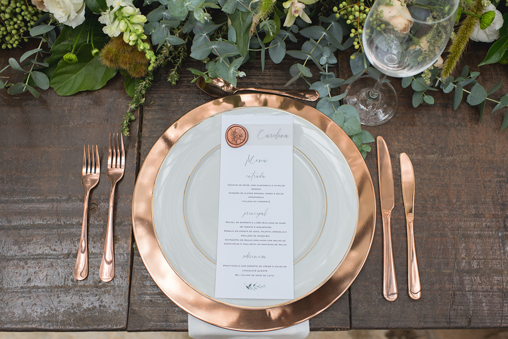A ideia era algo elegante e integrado à natureza. As peças em tom de cobre deram um ar moderno sem pesar. Espie os cenários e arranjos e você saberá do que estou falando!